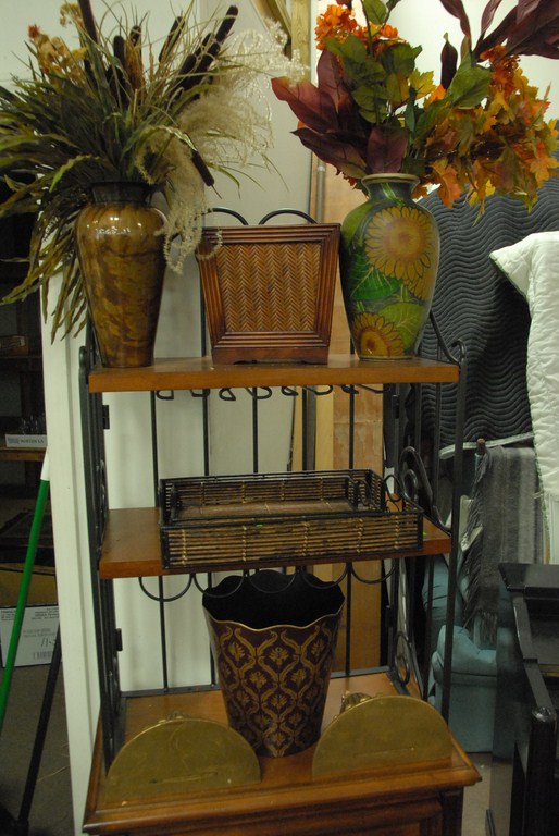 Lot 187: Decorative group lot on two tagres including reproduction radio with CD player, five clocks, vases, trays, shelves, etc.