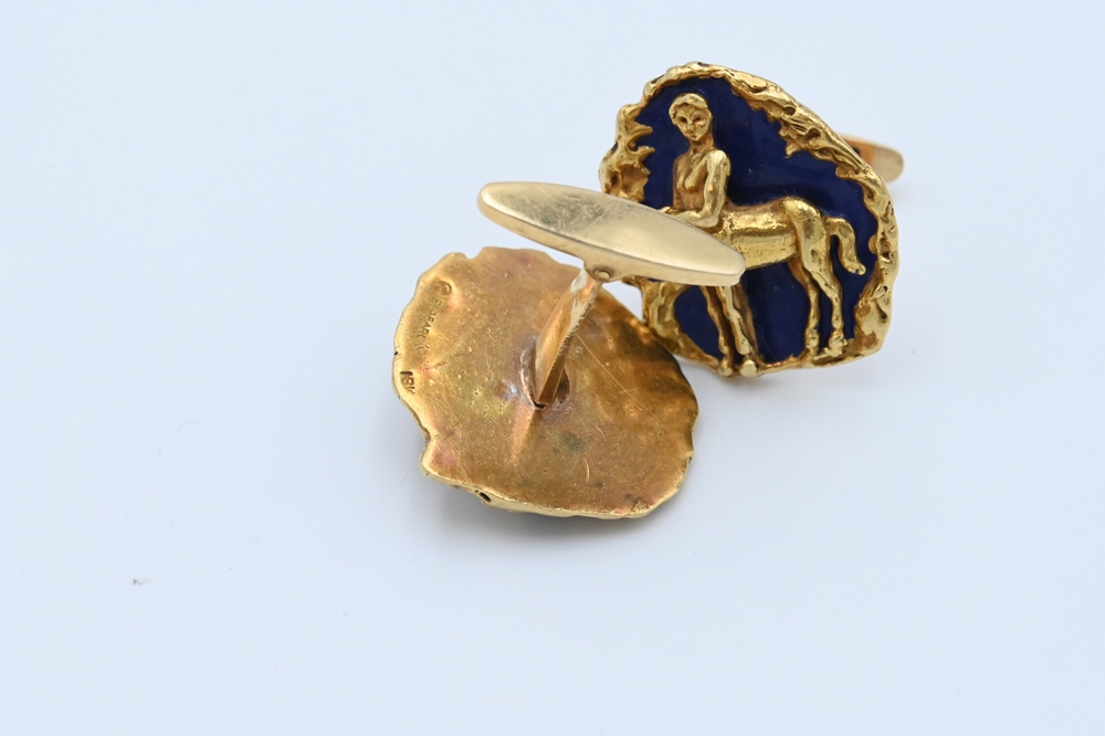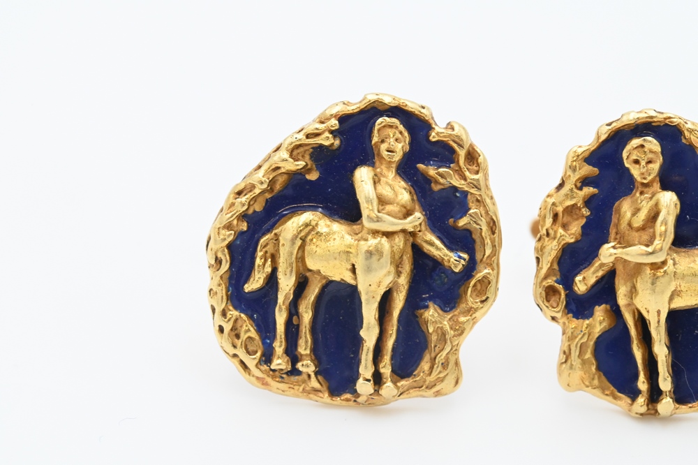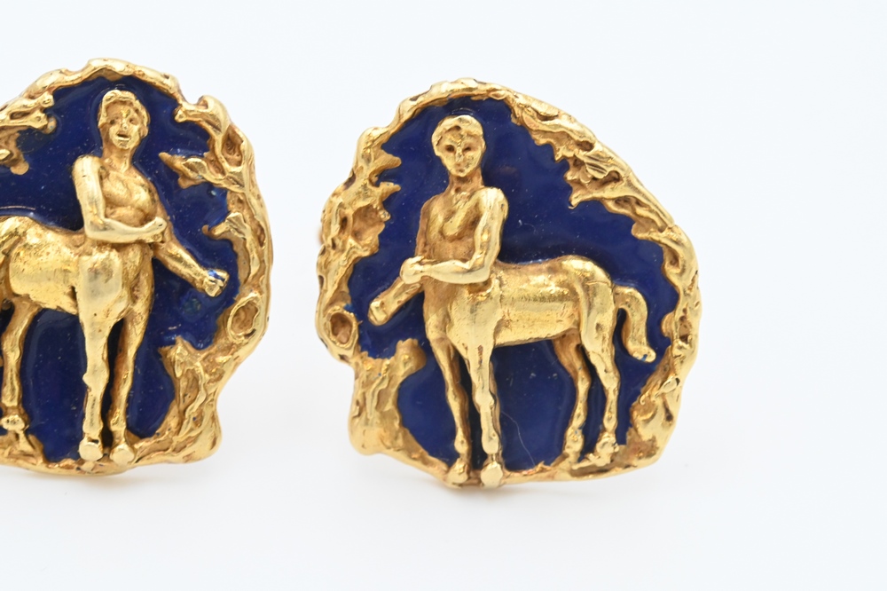Lot 187: E. Pearl Signed Pair of 18 Karat Yellow Gold Centaur Cufflinks, having blue enamel background, 22 grams.
