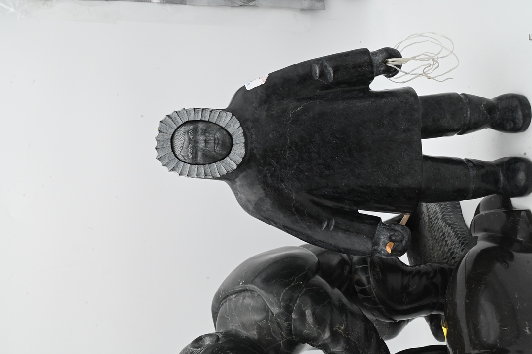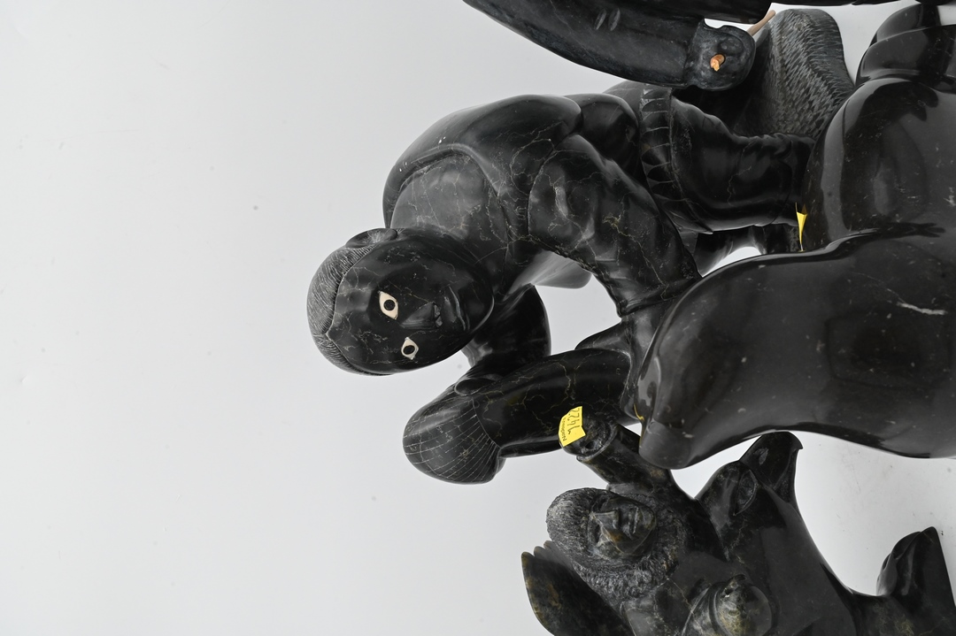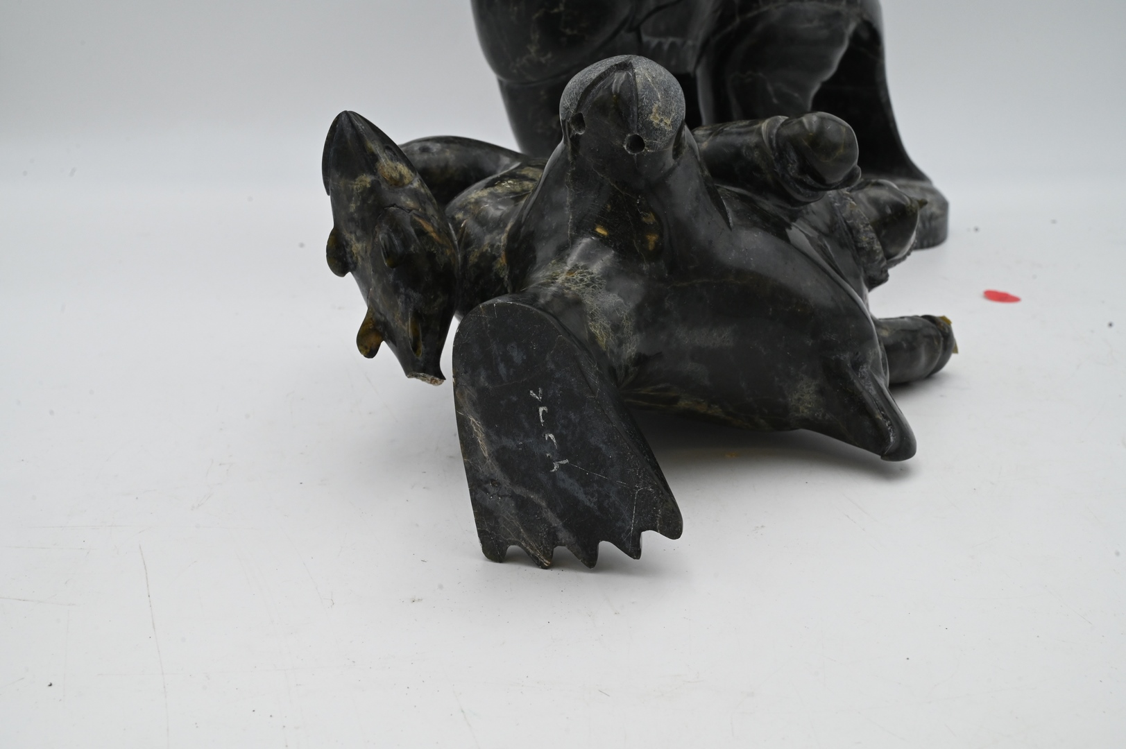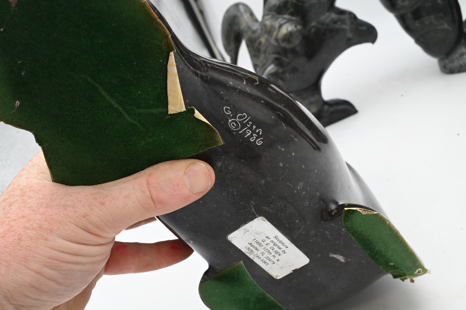 Group of Four Eskimo Inuit Carvings, seal signed “G. Olsen”, large carved figure holding a fish signed illegibly on bottom, standing figure holding a spear signed “Lab”, and a multiple carved figure, tallest 15 1/4 inches.