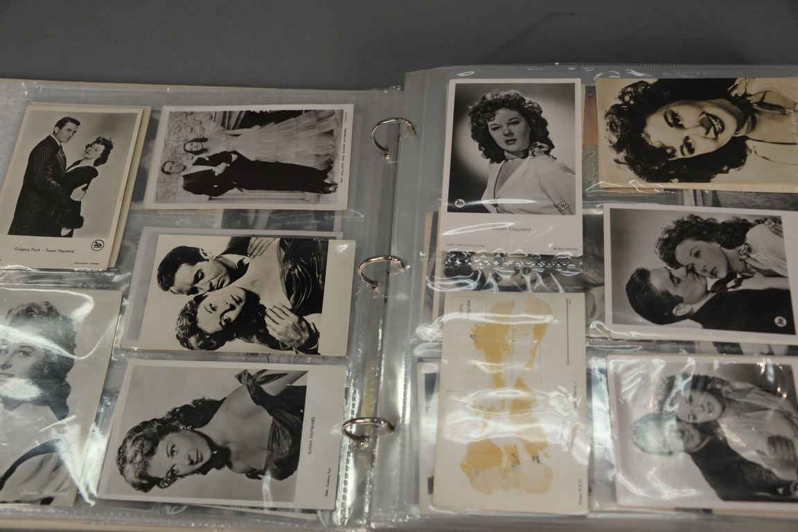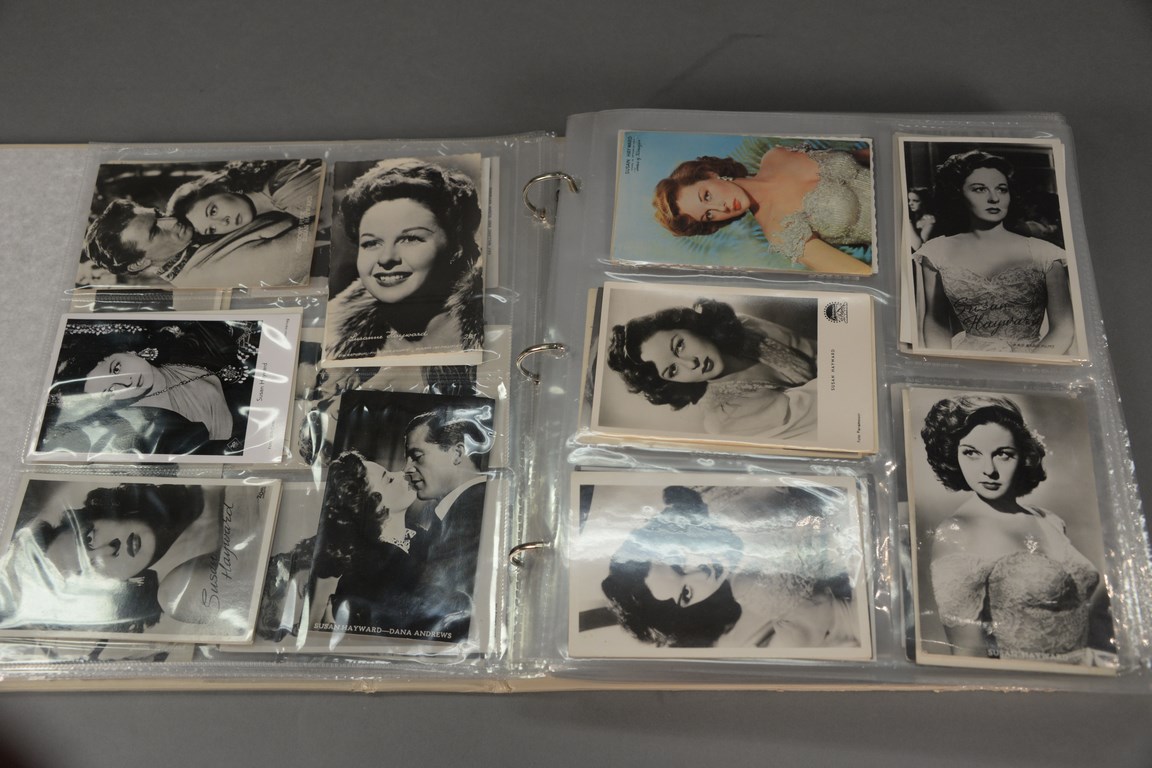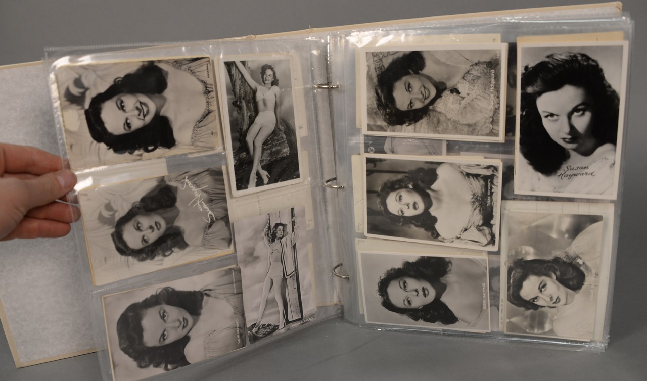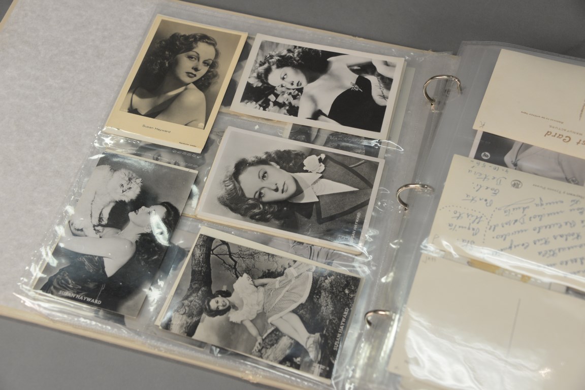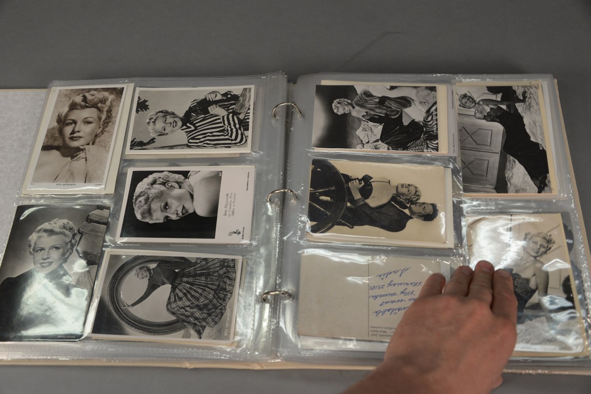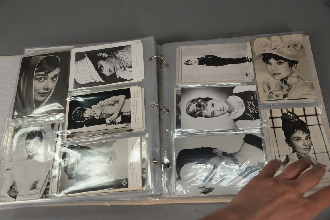 Lot 187: Large binder of postcards of actors and actresses, 18 are signed including 3 June Haver, 1 Susan Hayward, 1 Audrey Hepburn, 2 Betty …