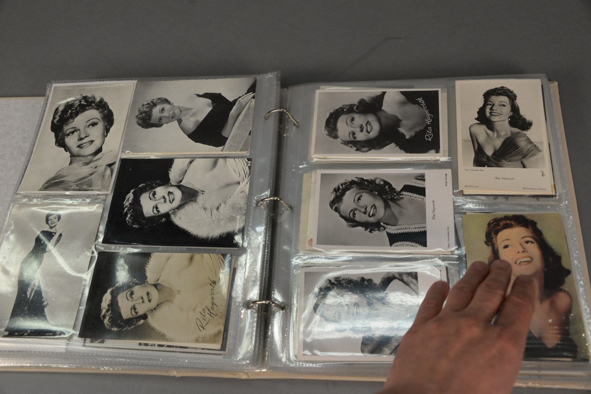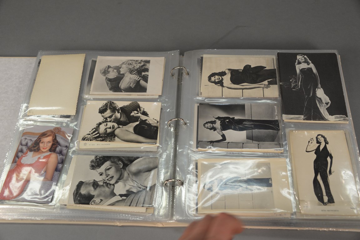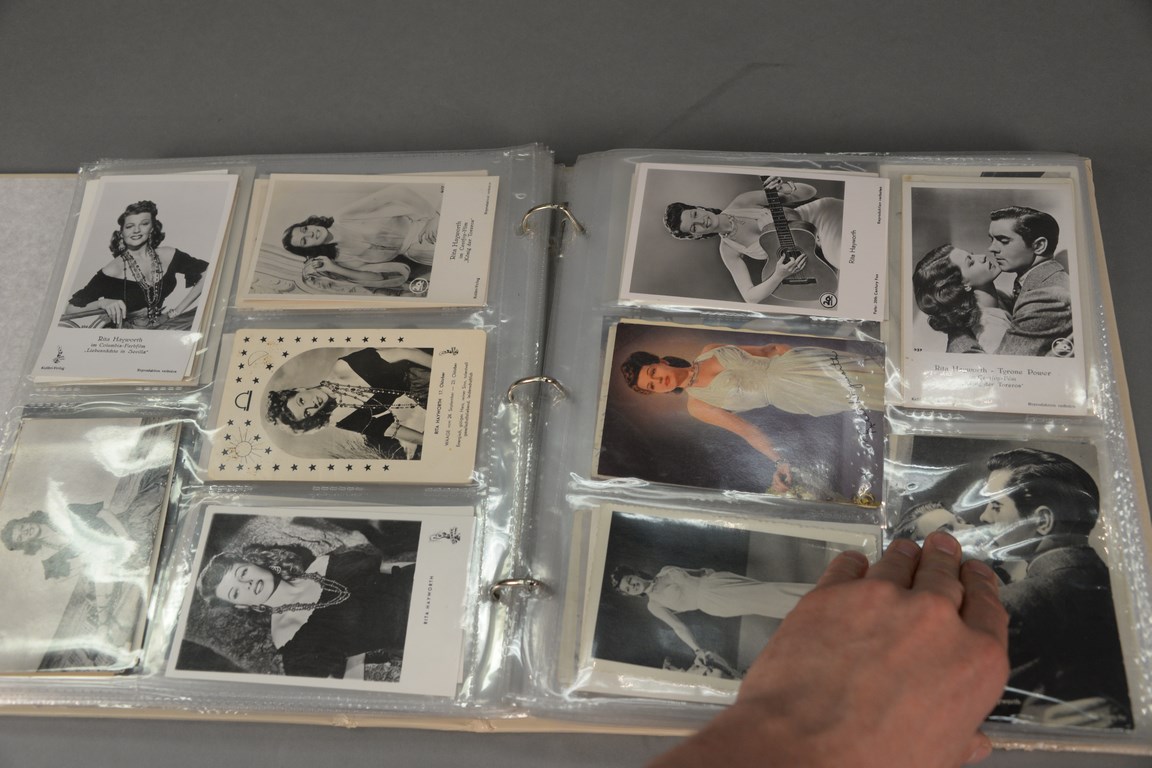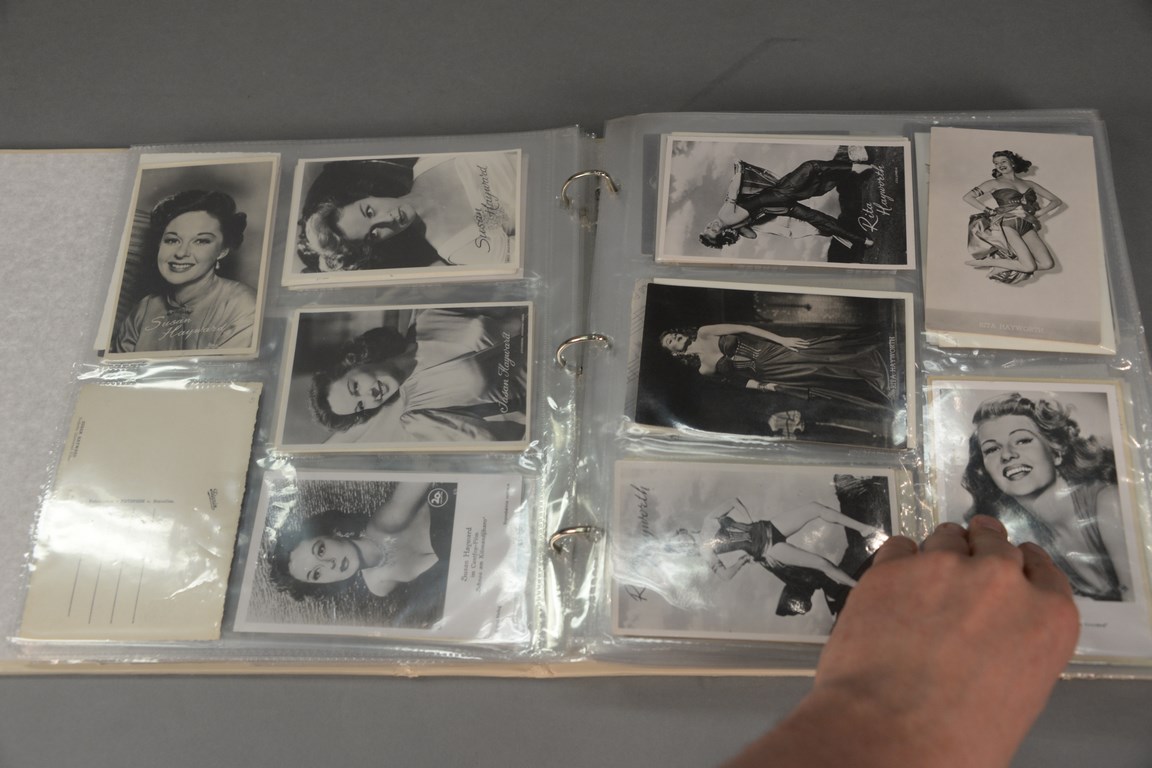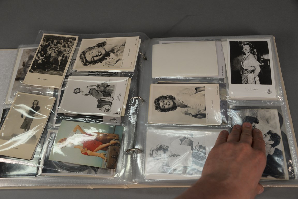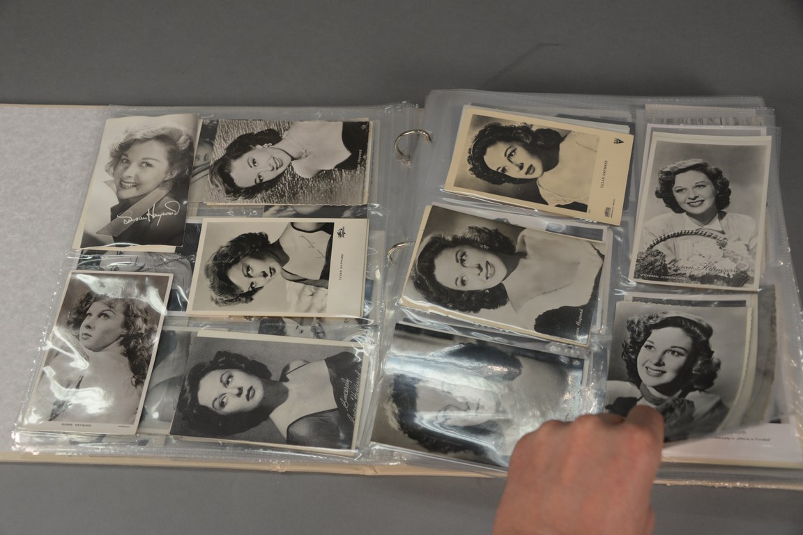 Lot 187: Large binder of postcards of actors and actresses, 18 are signed including 3 June Haver, 1 Susan Hayward, 1 Audrey Hepburn, 2 Betty …