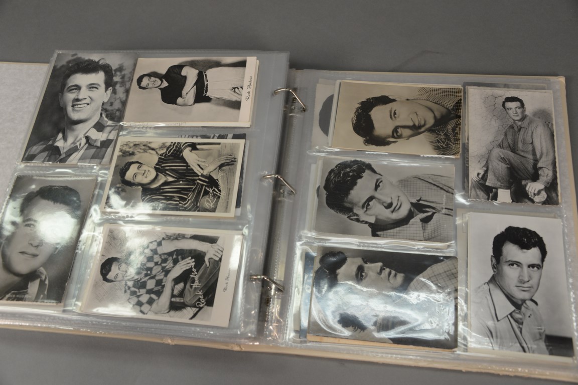 Large binder of postcards of actors and actresses, 18 are signed including 3 June Haver, 1 Susan Hayward, 1 Audrey Hepburn, 2 Betty Hutton, 1 Tab Hunter, 3 Charlton Heston, 2 Bob Hope, 3 Rock Hudson, 1 Bibi Johns, and 1 Louis Jordan in addition to approximately 375 unsigned postcards.