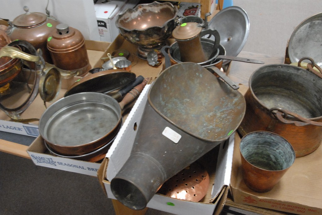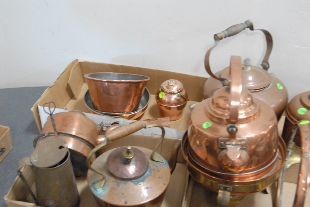 Lot 187: Nine box lots of copper four copper tea pots, two stands, small copper pots, buckets, mug, etc.