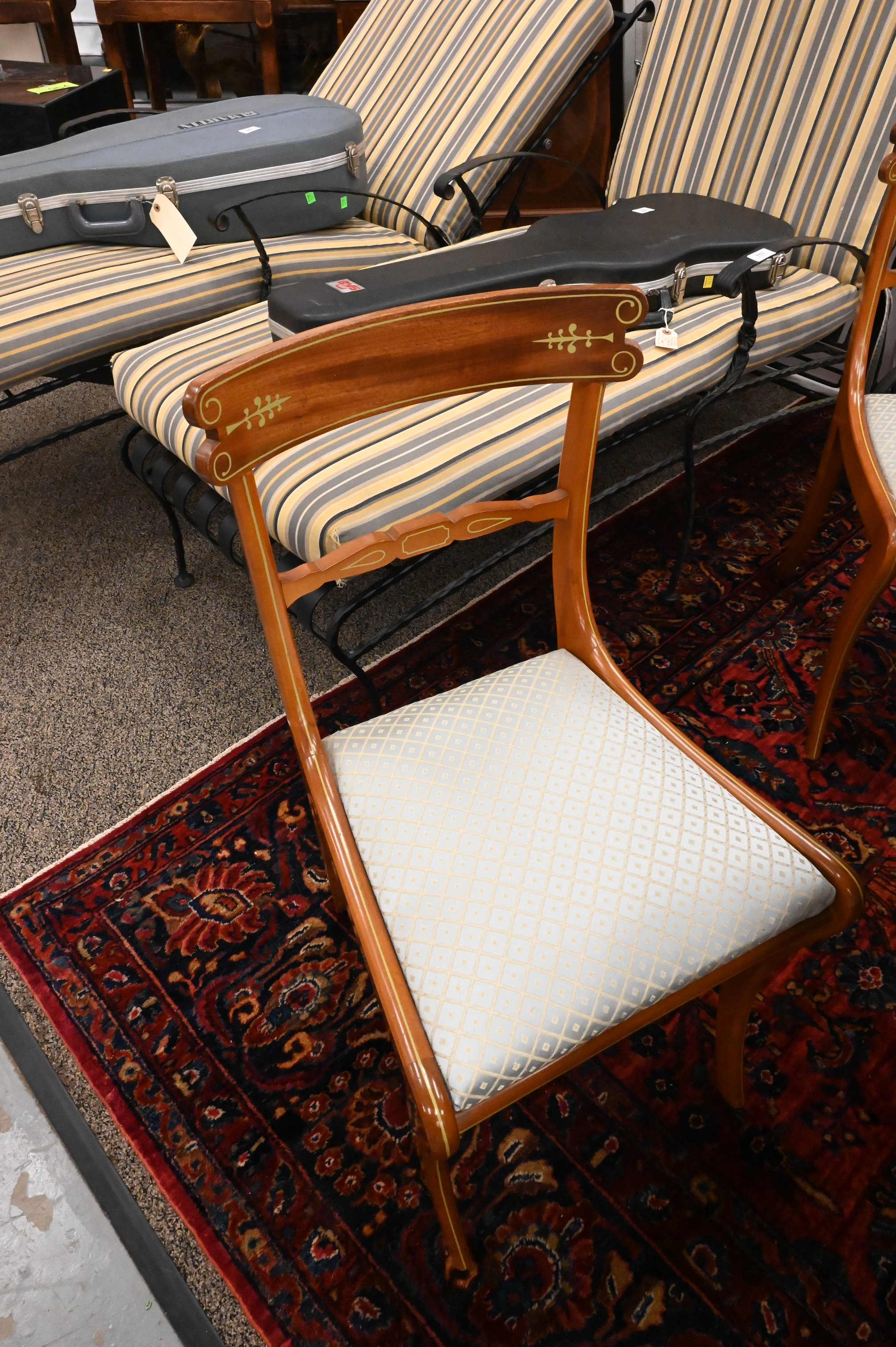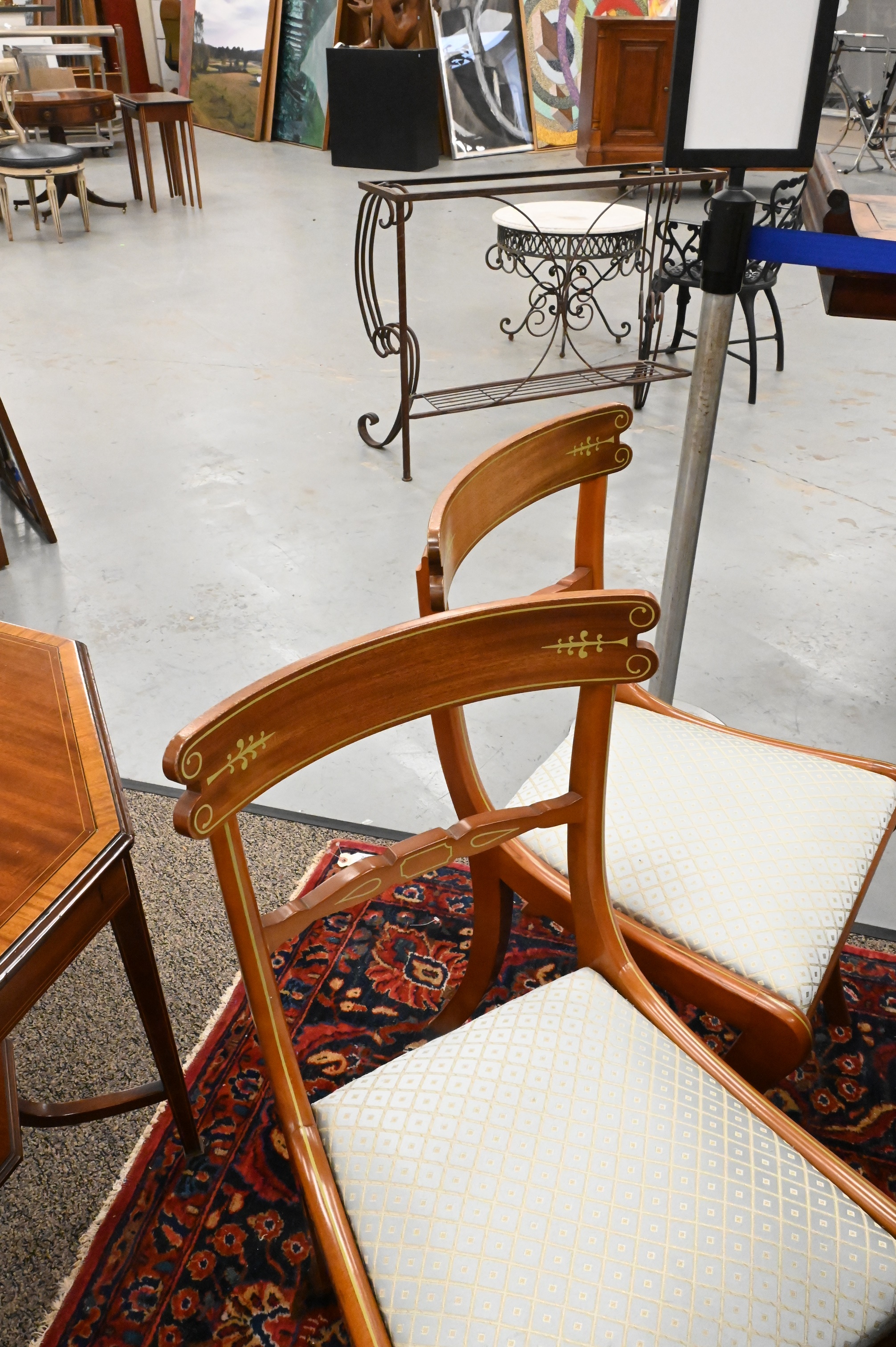 Set of 10 William Tillman Regency Style Inlaid Dining Chairs, each having silk accented slip seats, seat height 17 inches, height 33 1/2 inches.