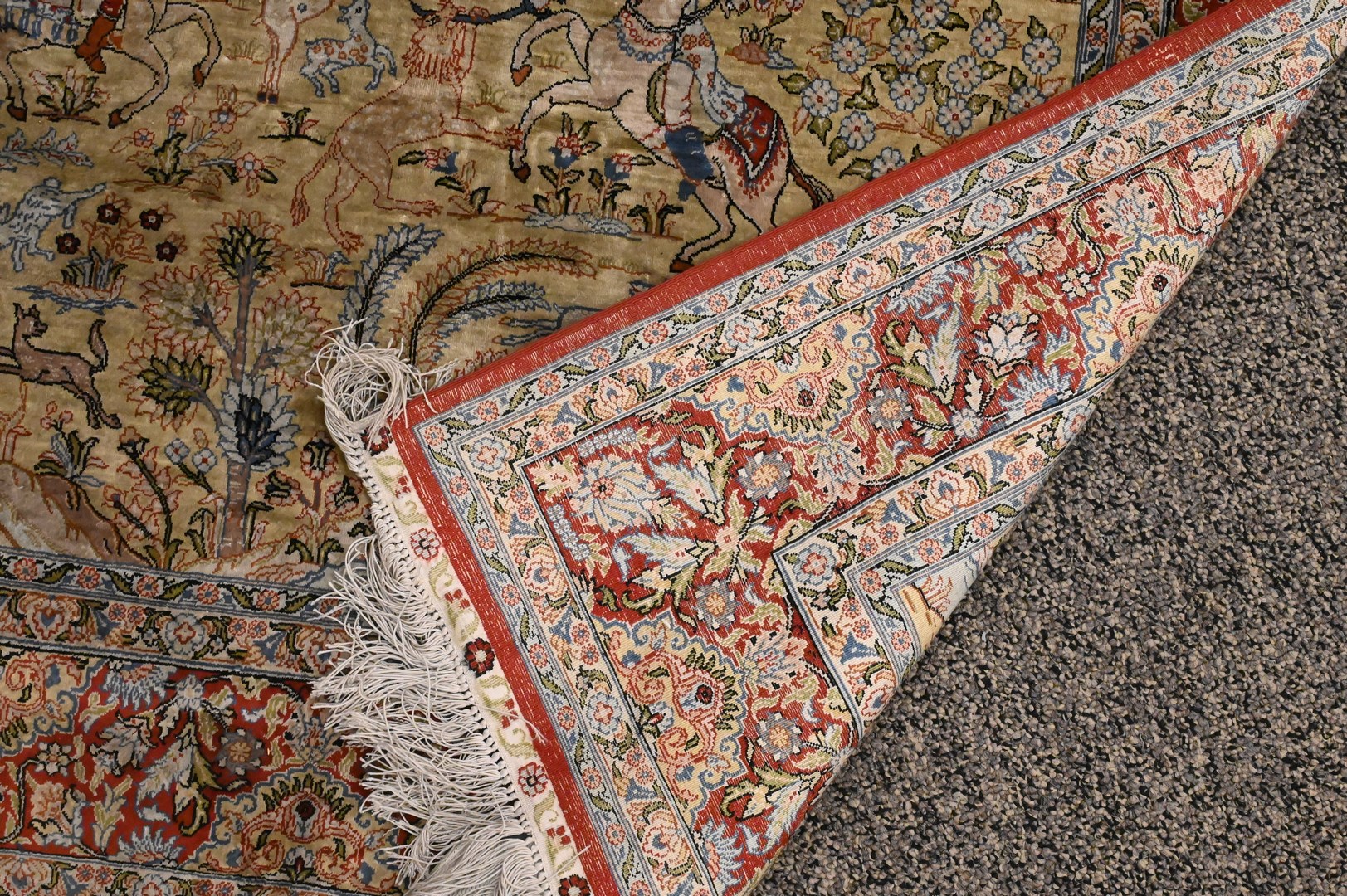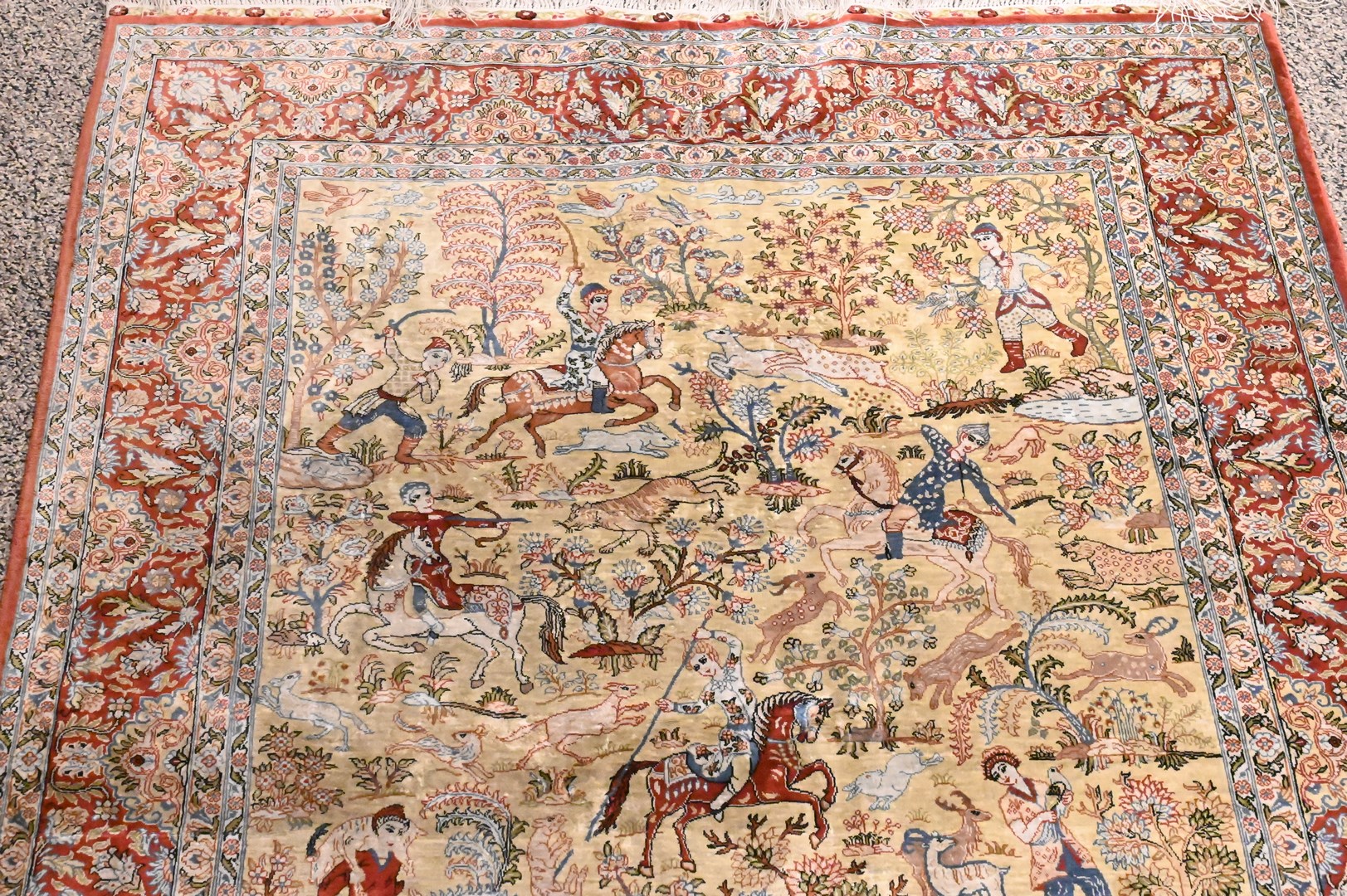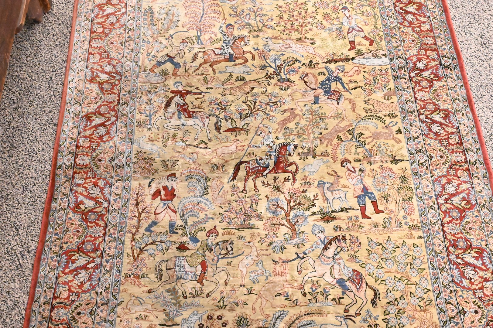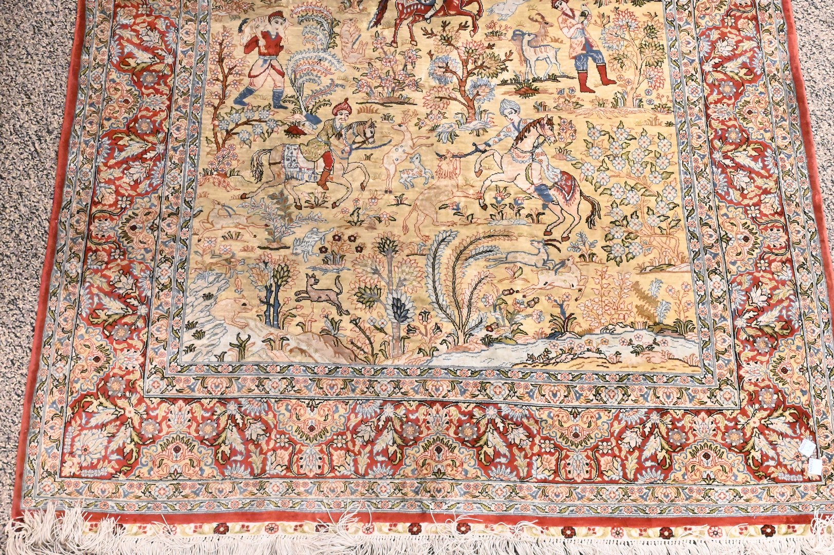 Silk Oriental Pictorial Throw Rug, depicting people, horses, deer, animals, etc., 3′ 6″ x 5′ 2″.