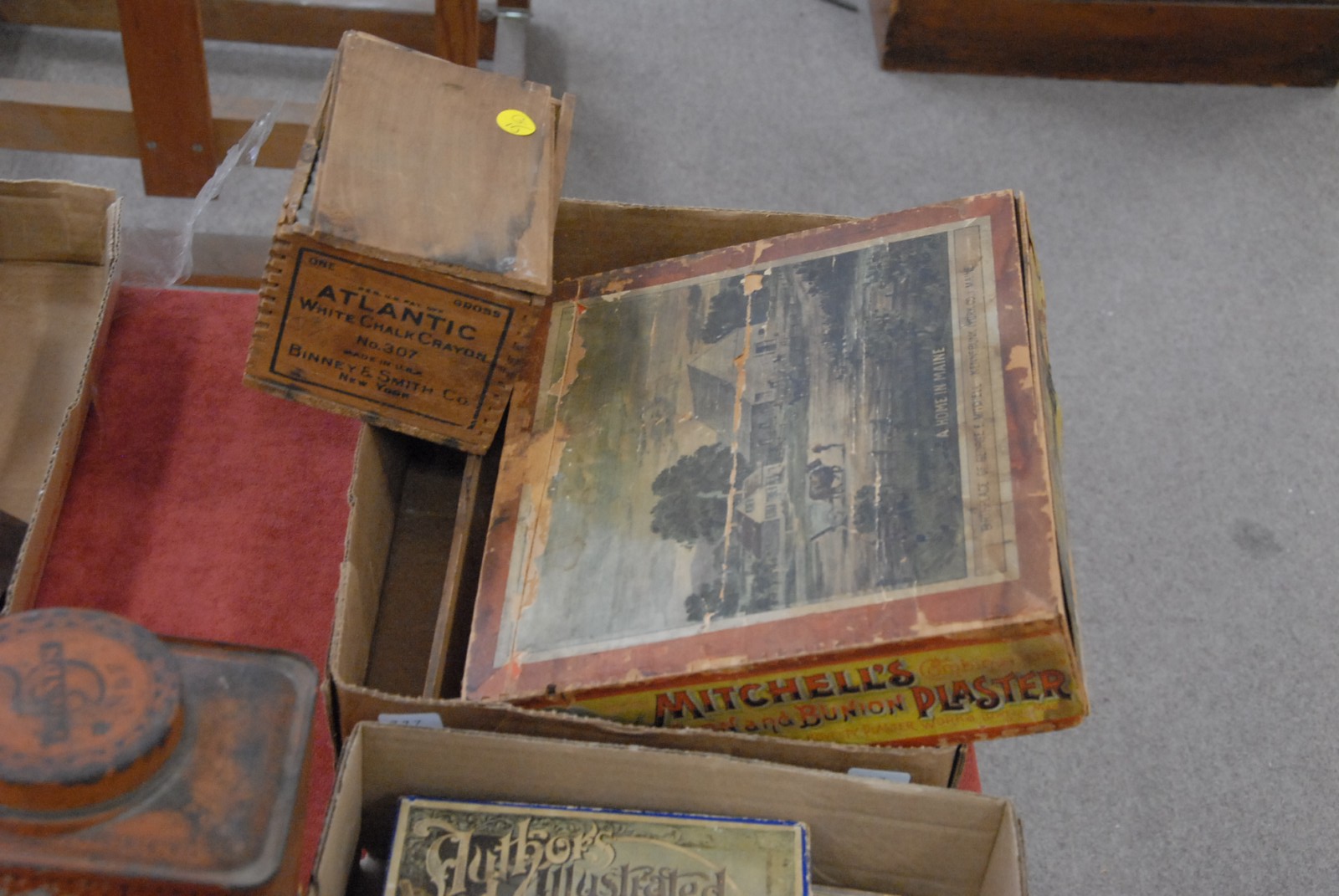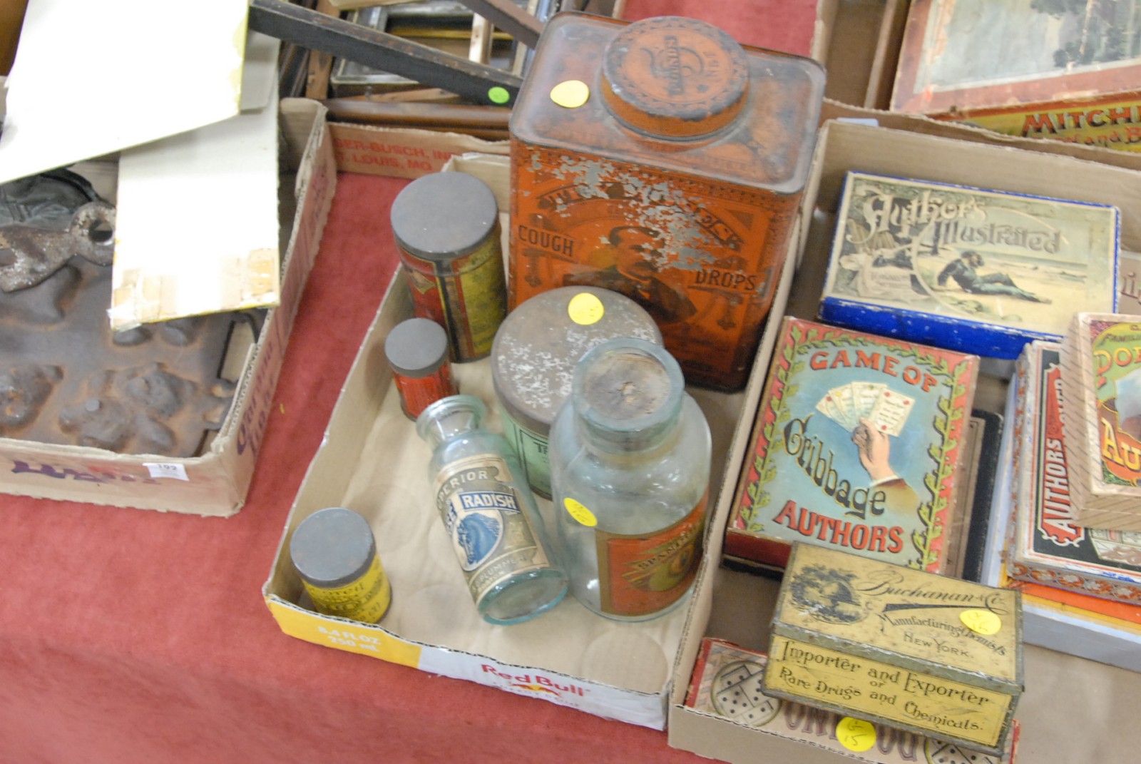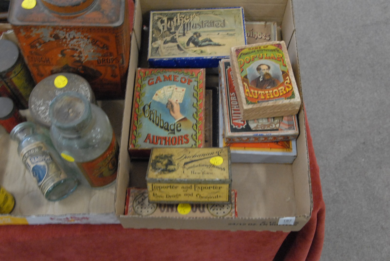 Three box lots of small early games, tins, and bottles