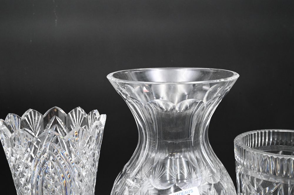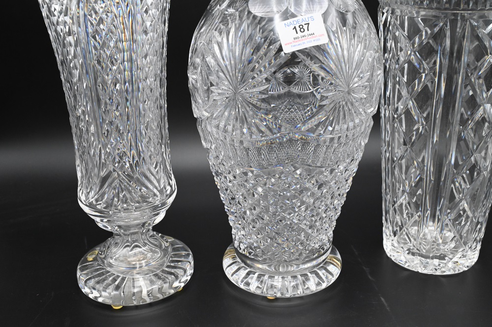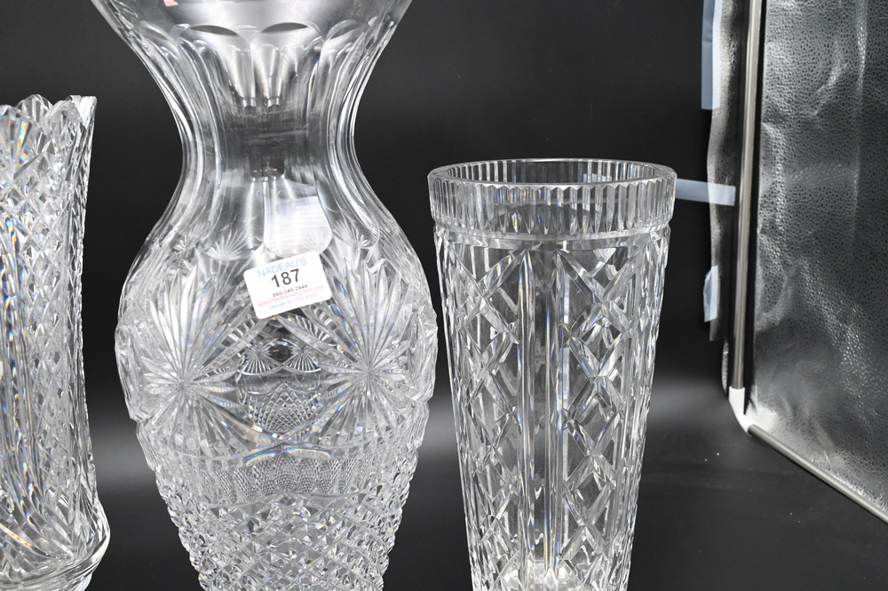 Three Large Waterford Crystal Vases, height 16 1/4 inches, 12 inches, 14 inches.