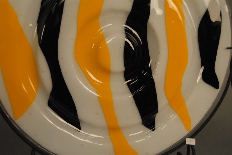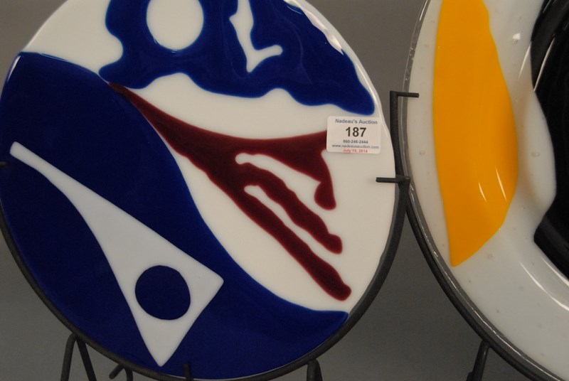 Two artglass discs on stands, dia. 12 1/2 in. – 22 in.
