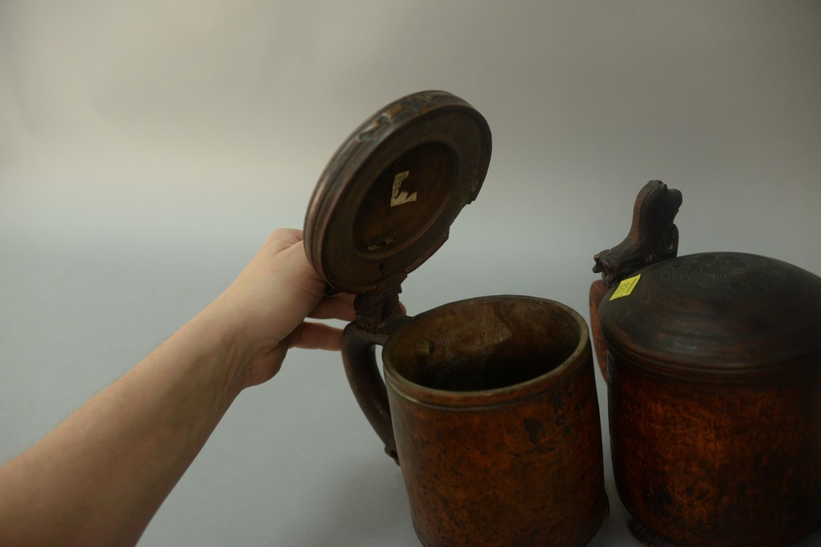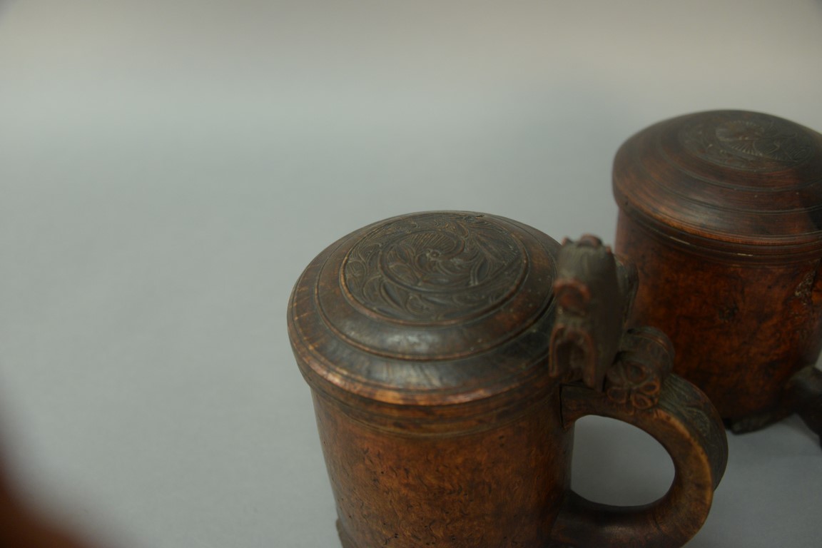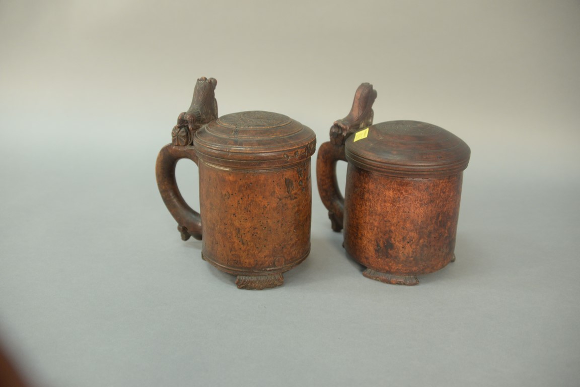 Lot 187: Two Scandinavian burlwood tankards 18th/19th century, each having hinged covers with carved lion thumb piece over handle attached to…