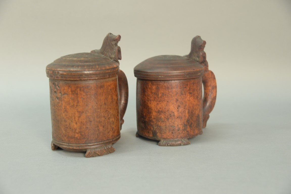 Two Scandinavian burlwood tankards 18th/19th century, each having hinged covers with carved lion thumb piece over handle attached to cylindrical body on three carved feet.