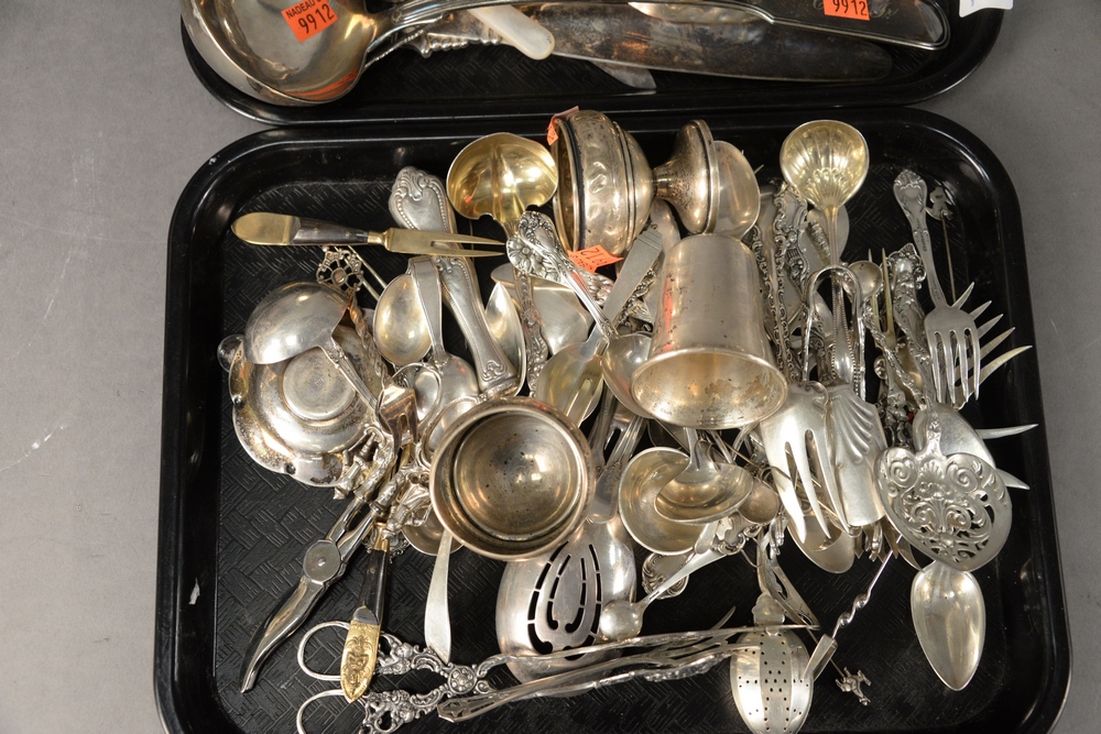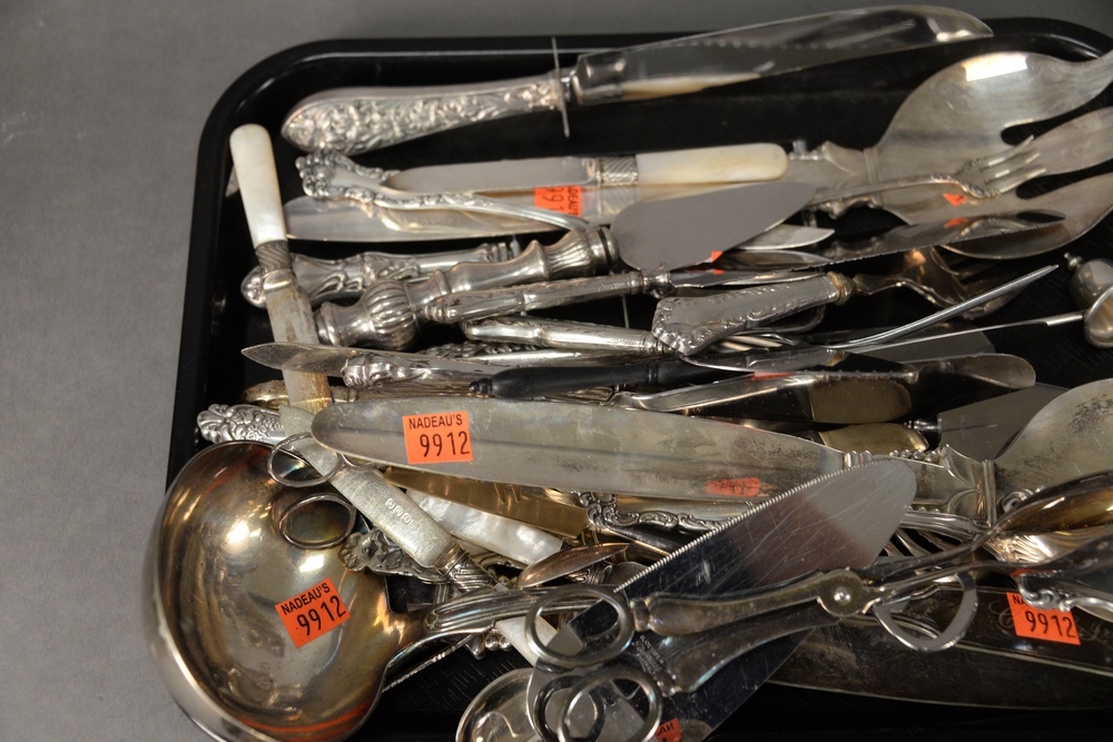Two Tray Lots of Sterling Silver and Silver Plate, to include flatware, serving pieces, etc., approximately 38.7 t.oz plus 14 handles.