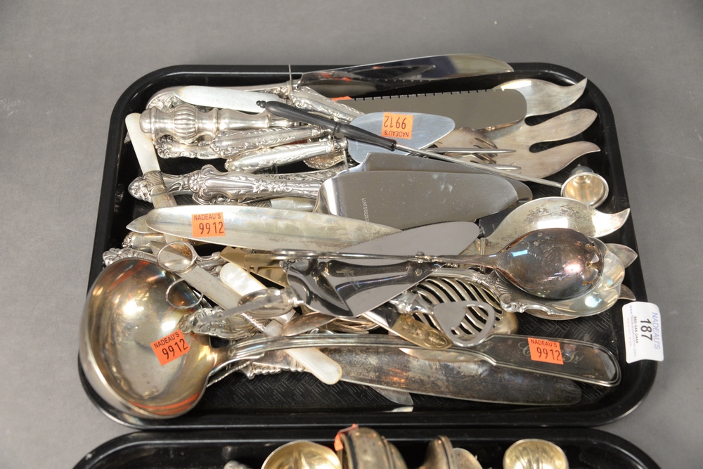 Lot 187: Two Tray Lots of Sterling Silver and Silver Plate, to include flatware, serving pieces, etc., approximately 38.7 t.oz plus 14 handles.
