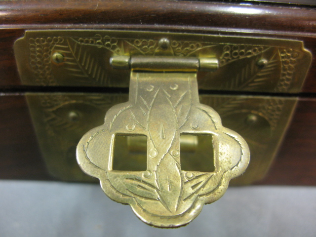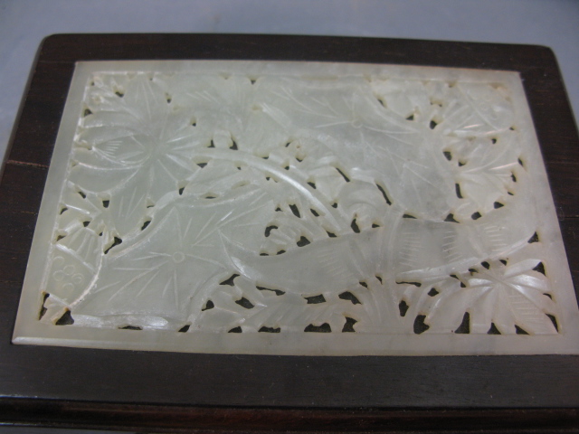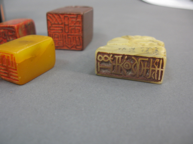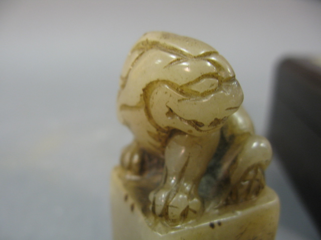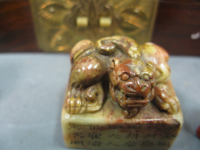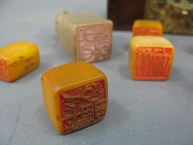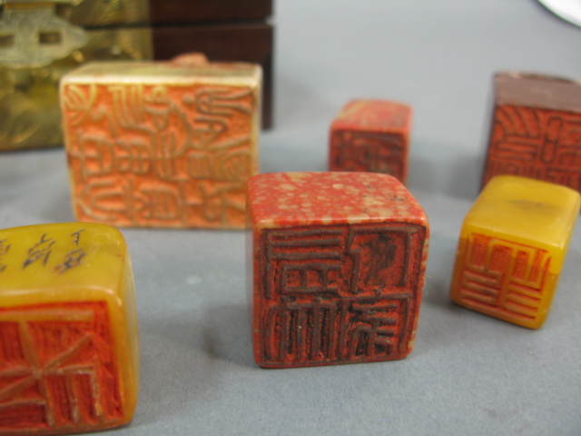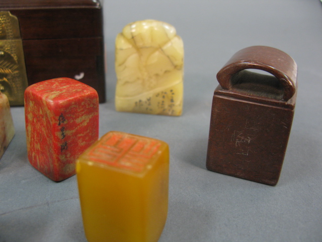 Wood lift top box with carved stone top and twelve soapstone seals inside.