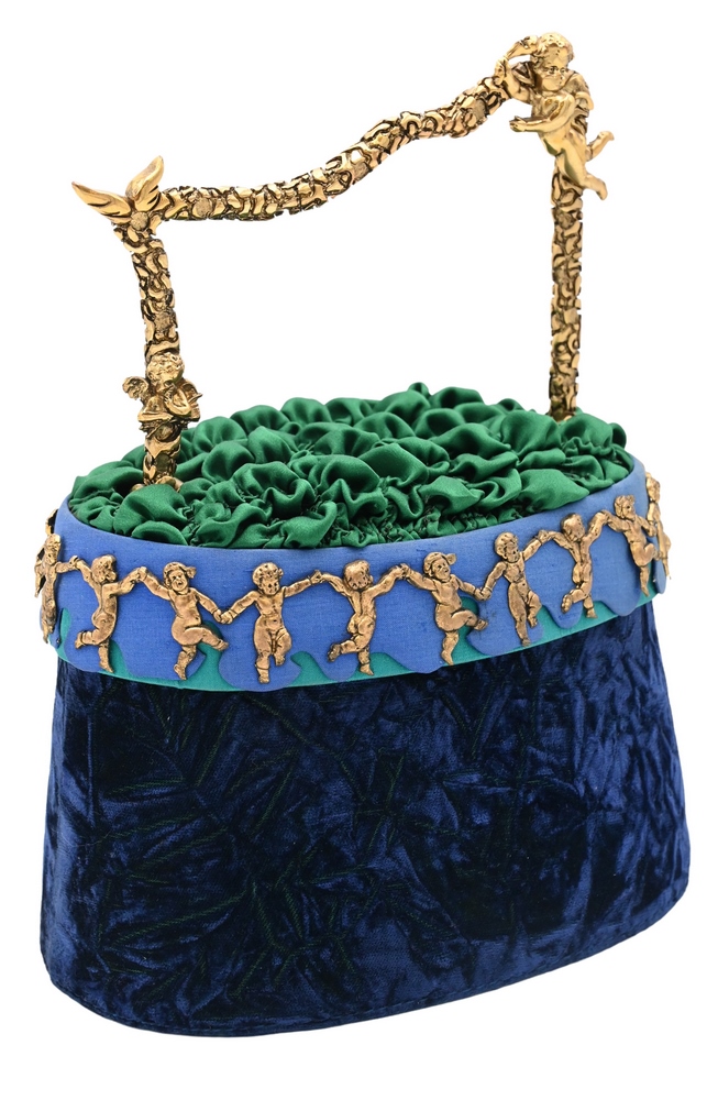 Lot 187A: Helene Angeli Handbag/Purse, having putti motif and brass handle, interior marked “Helene Angeli Made in France,” height 9 3/4 inche…