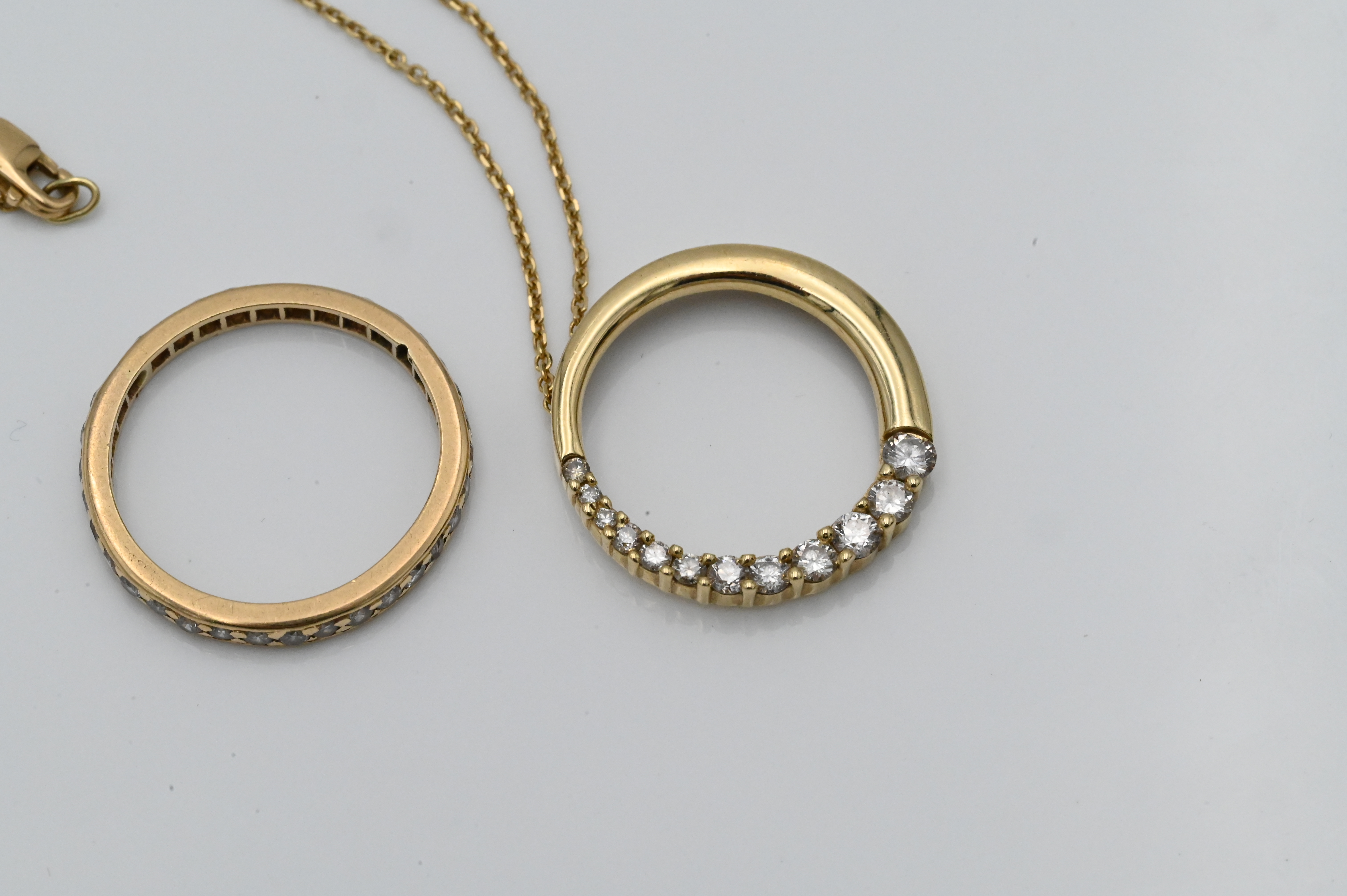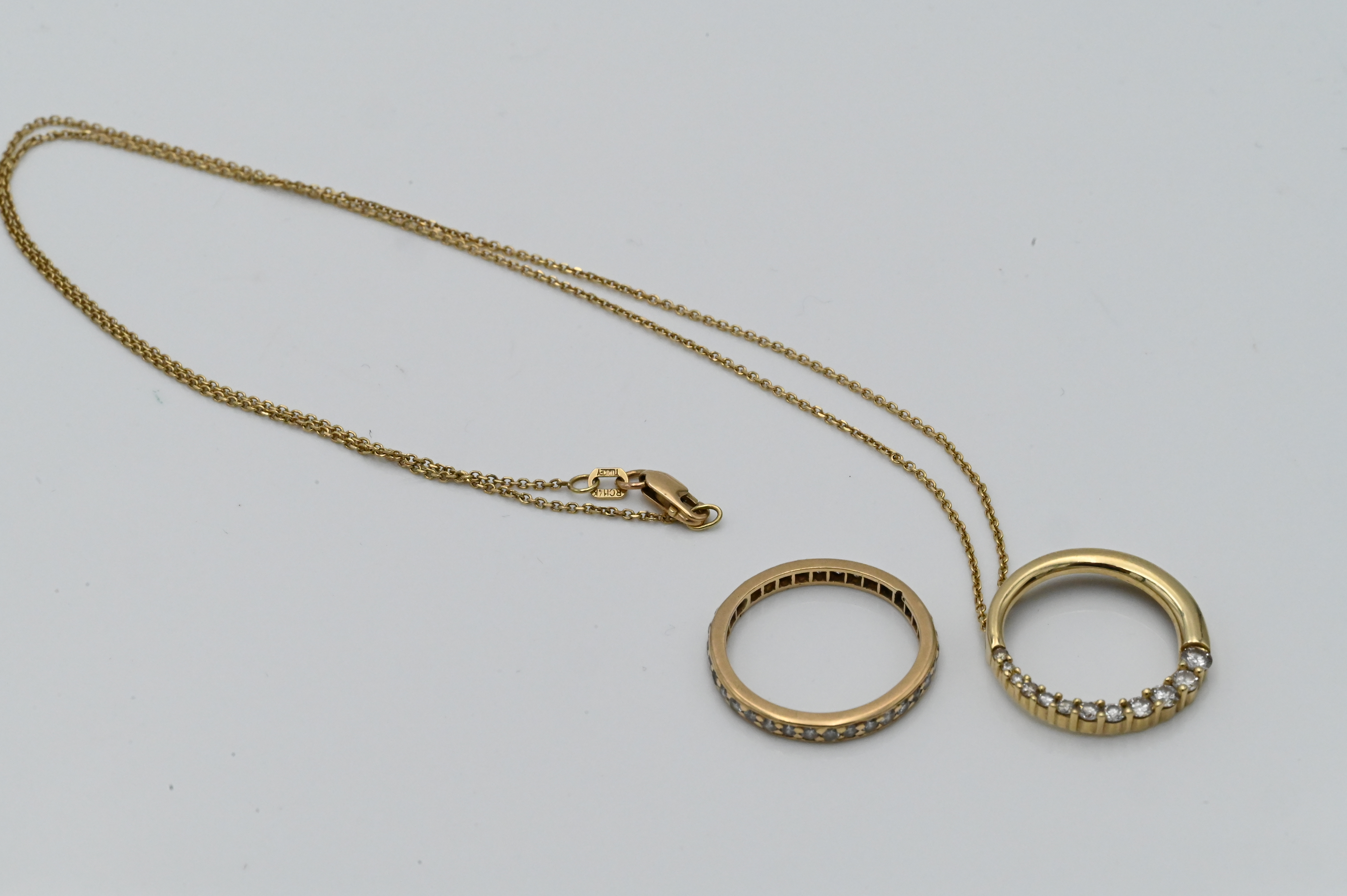 14 Karat Yellow Gold Chain, having round pendant with diamonds and channel set diamond ring.