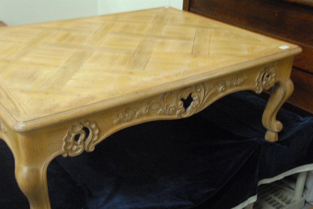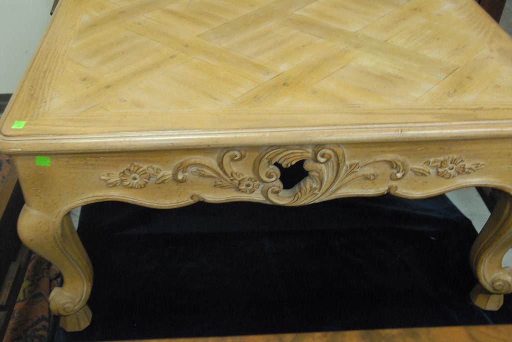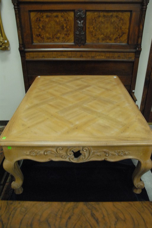 Auffray Co. oak coffee table with criss cross inlaid oak top. ht. 17in. top: 48 x 36