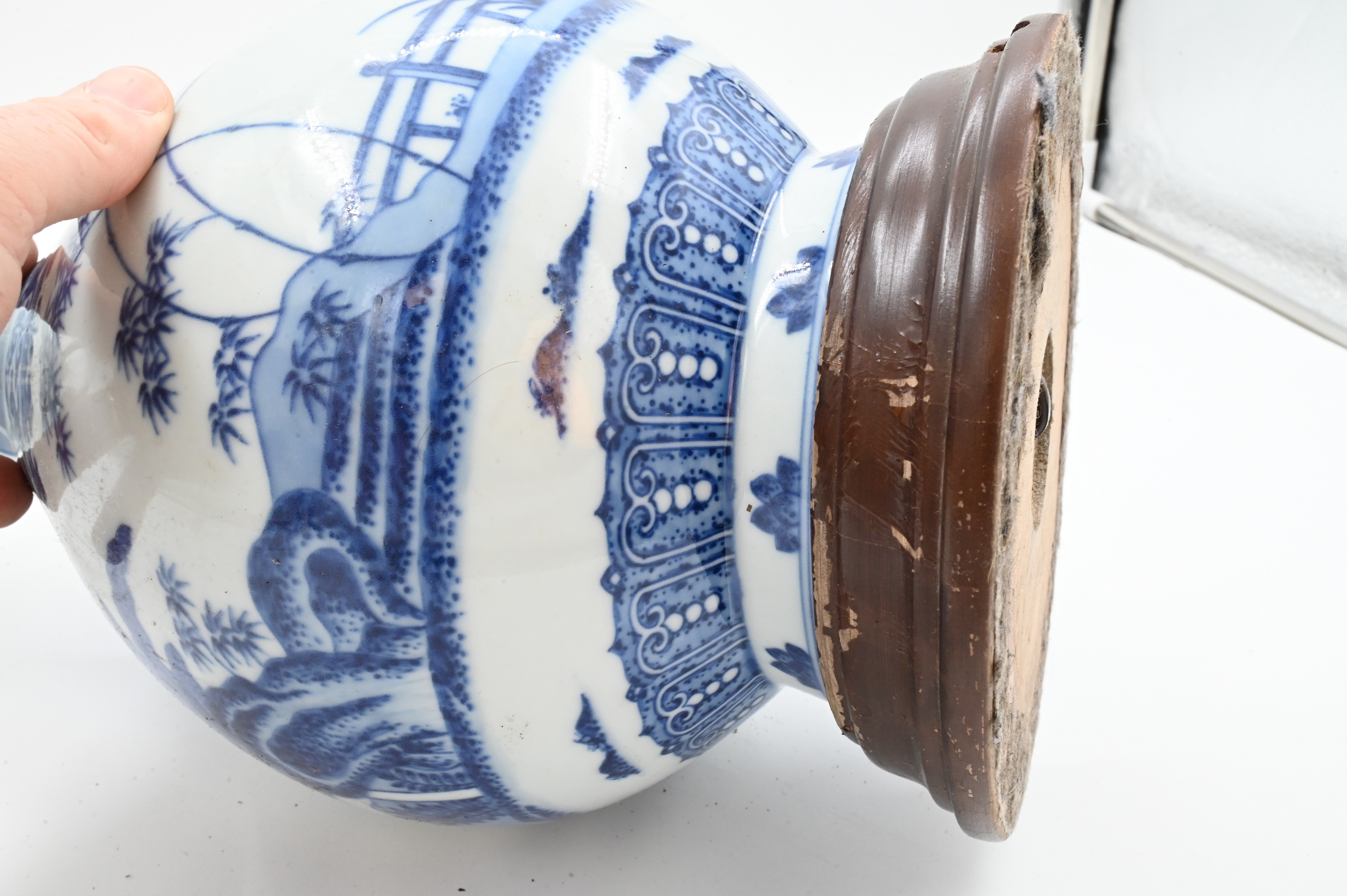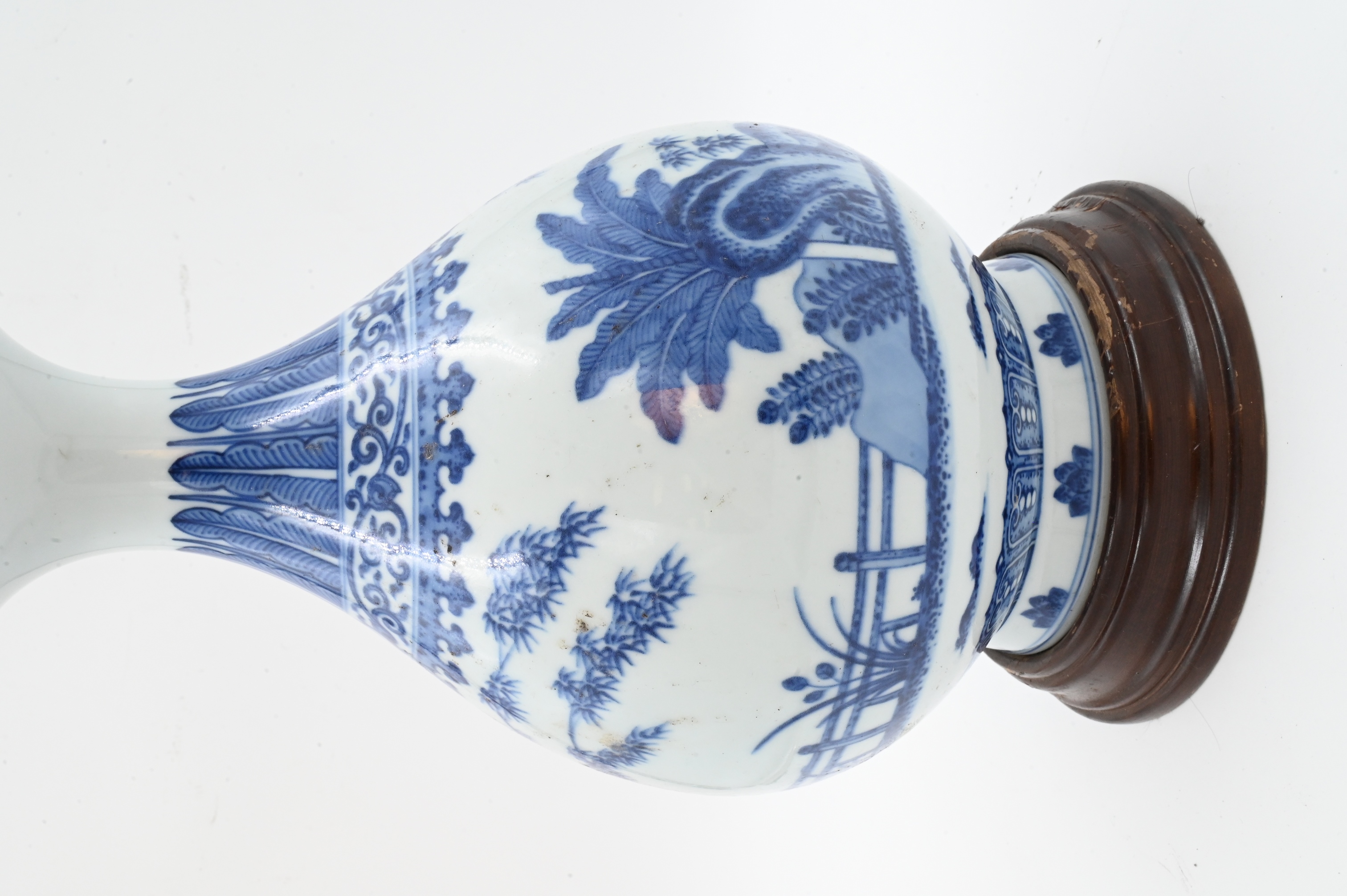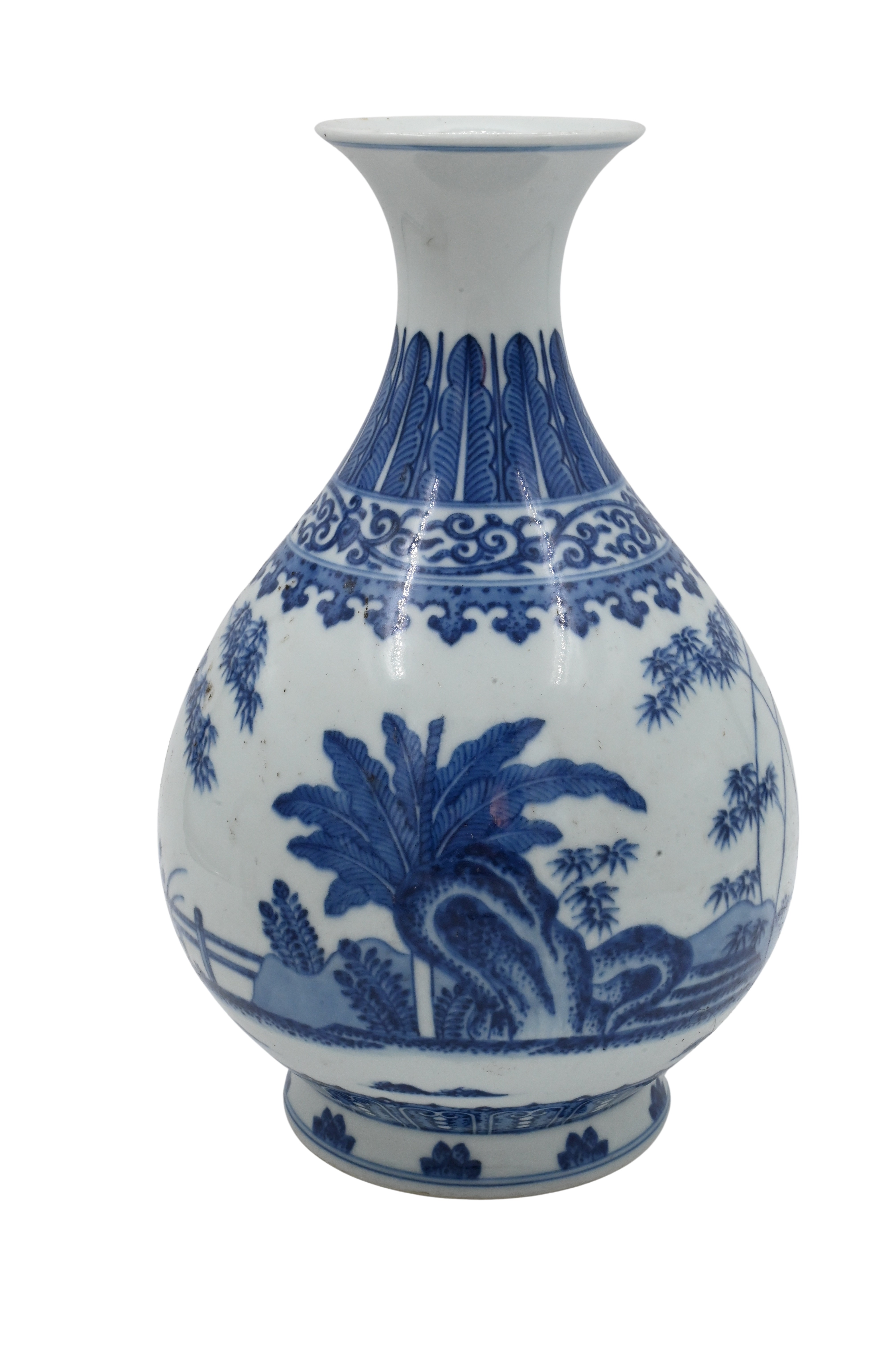 having landscape motif with bamboo trees, scroll work, and picket fence, teardrop form, six character mark to base