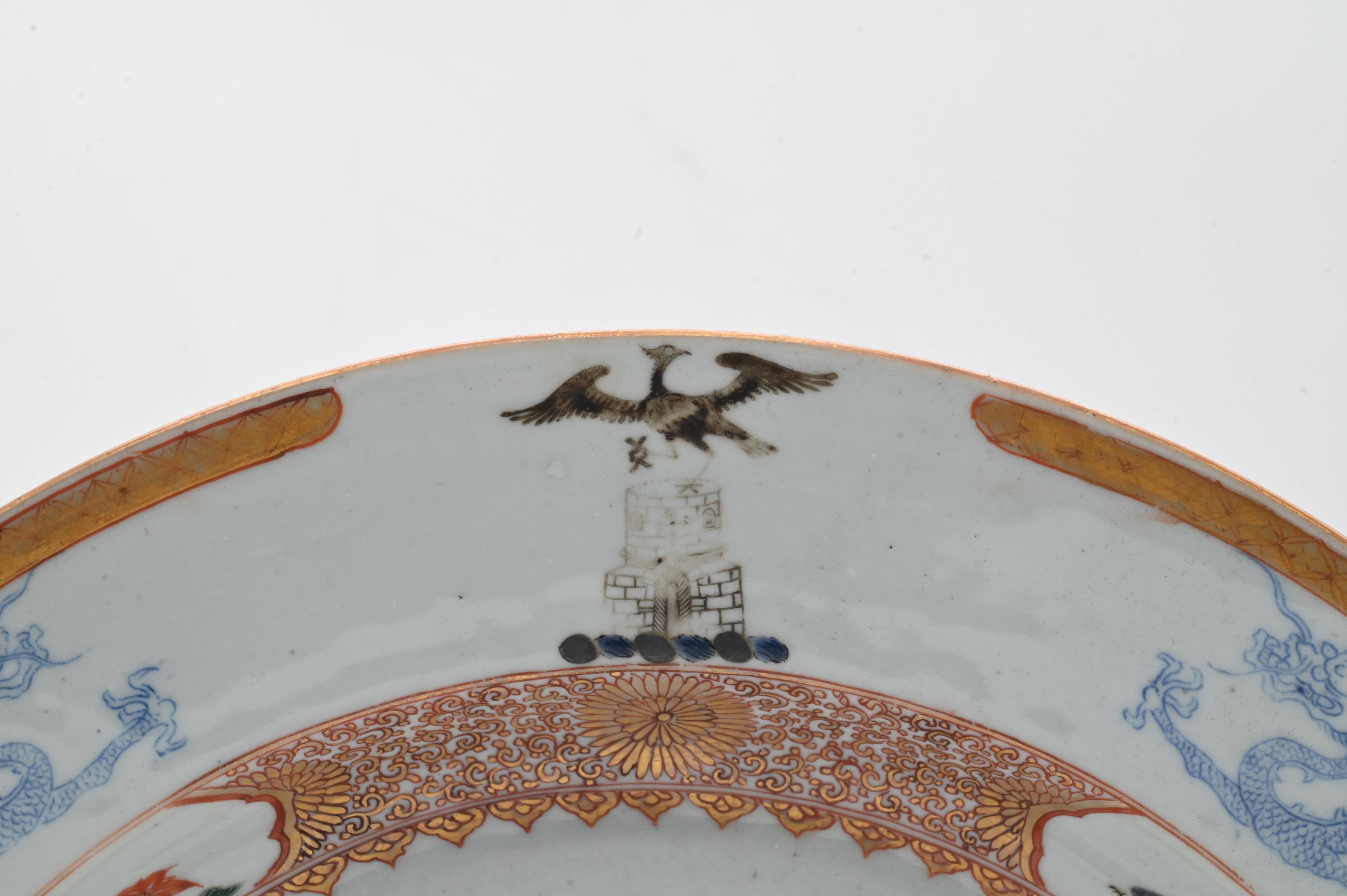 Famille rose decorated charger with central flowering plant and insects within an iron-red and gilt scroll border, the rim with alternating reserves of birds and underglaze blue dragons and fish, surmounted by a European armorial crest depicting an eagle with crossed swords above a tower and a row of six roundels, Qianlong Period 18th century