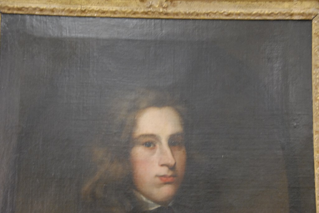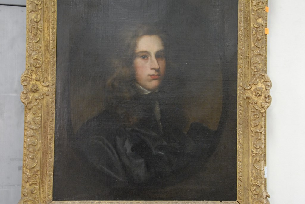 Lot 188: English portrait of young man with wavy brown hair, late 18th century, oil on canvas, unsigned, 30 1/4 x 25 1/4.