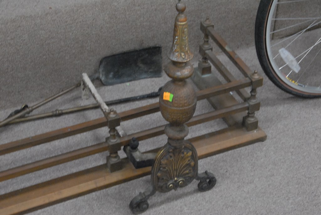 Lot 188: Fireplace grouping to include a pair of heavy brass Regency style andirons and brass fire fender.