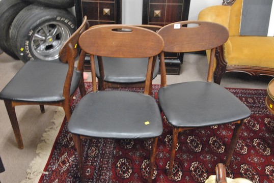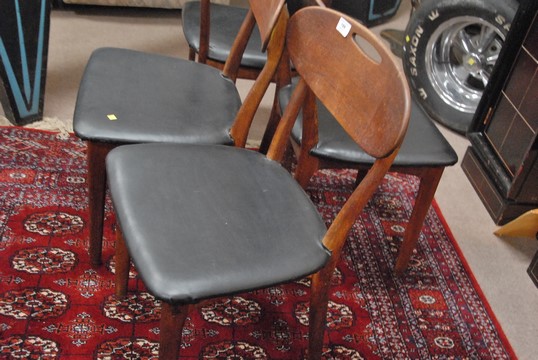 Four Mid-Century Danish teak chairs with black vinyl tops.