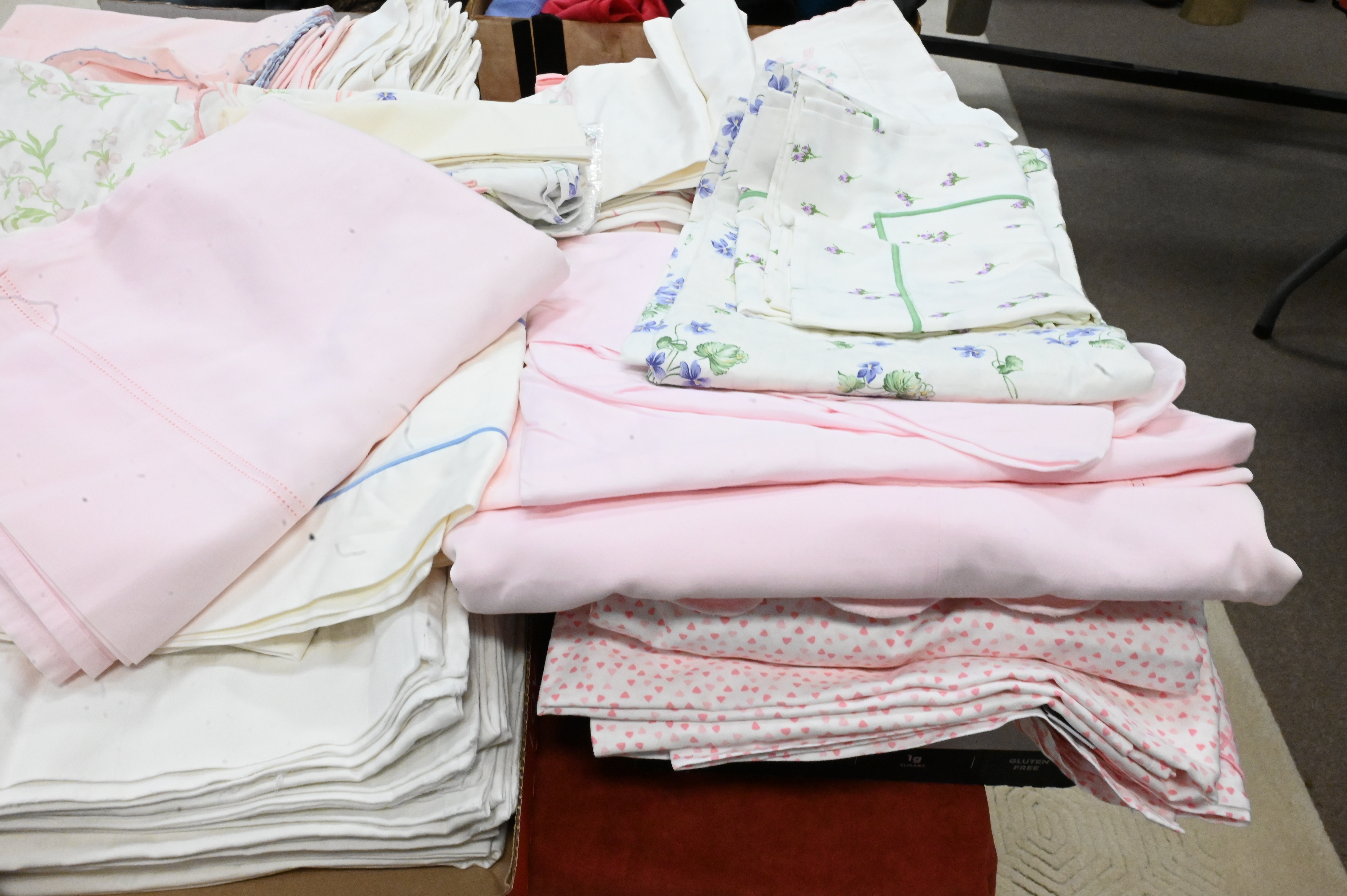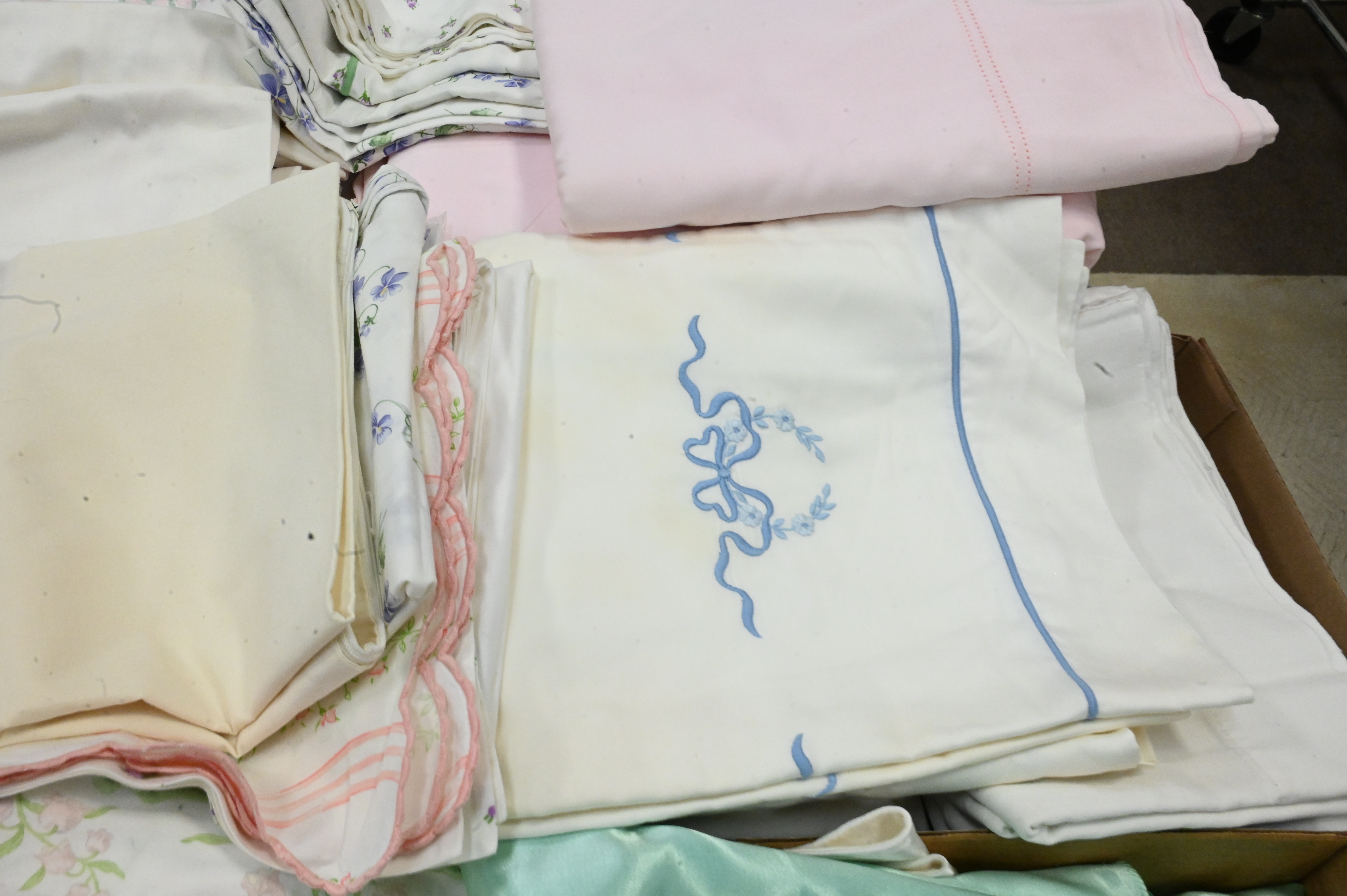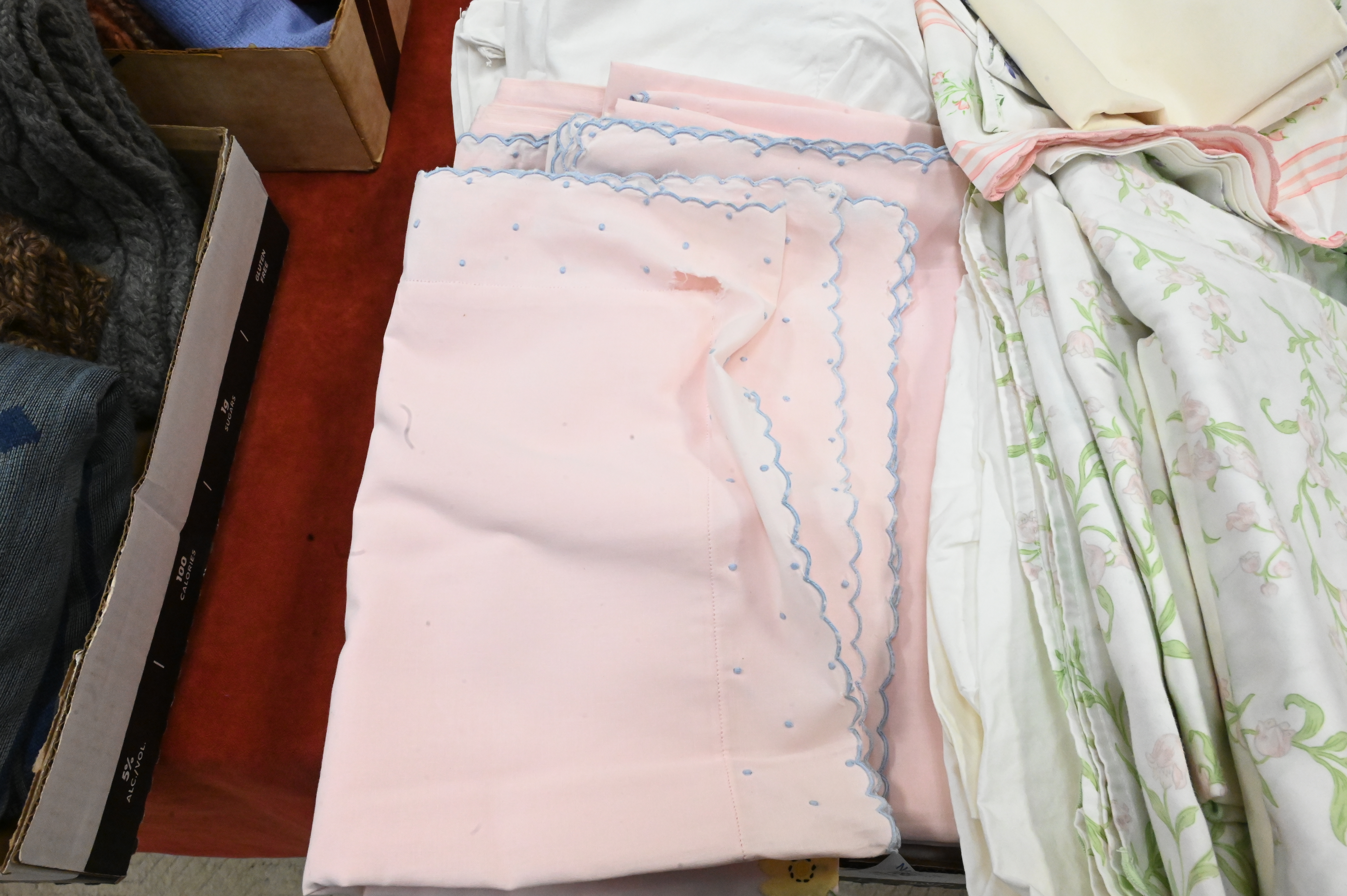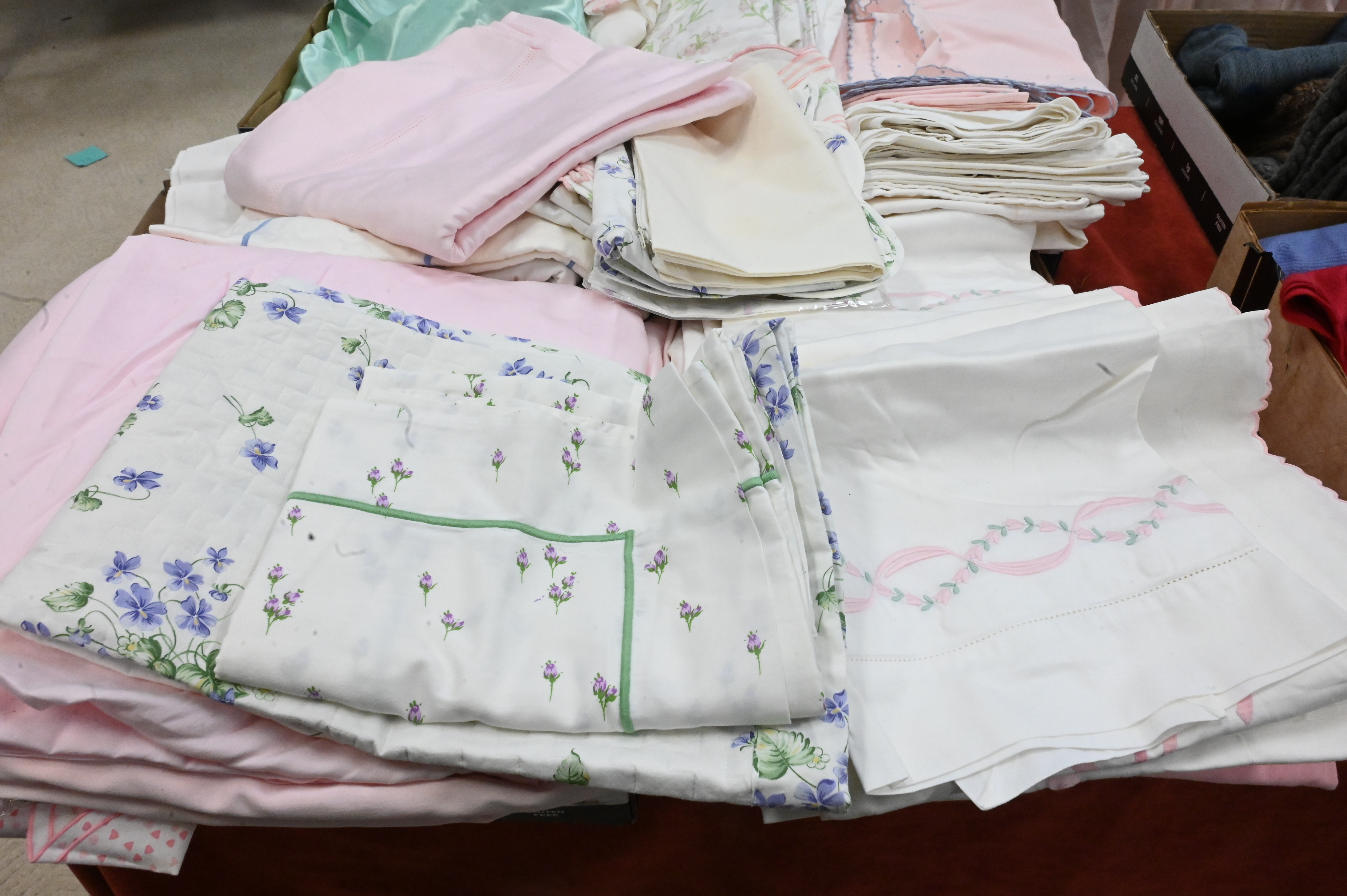 Group of Embroidered Linen, to include bed sheets and pillowcases, embroidered napkins and tablecloths.