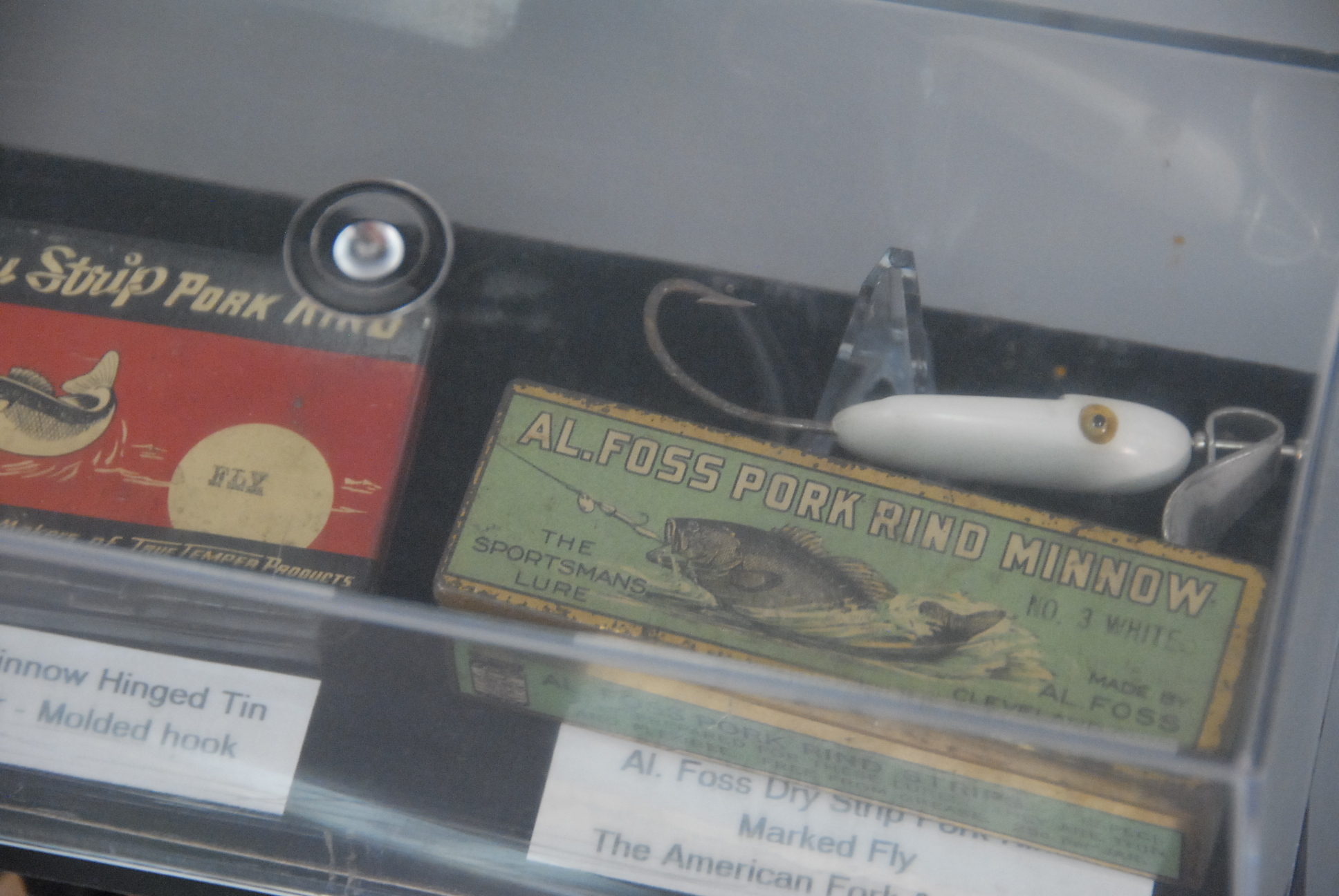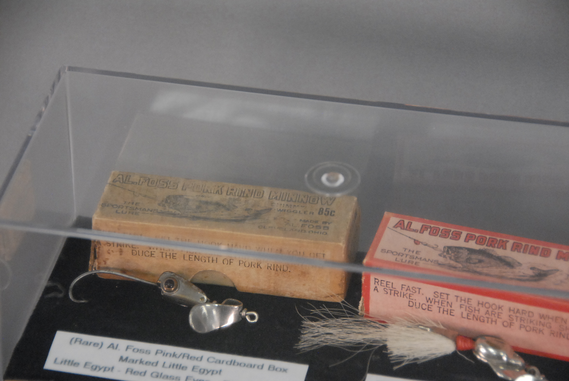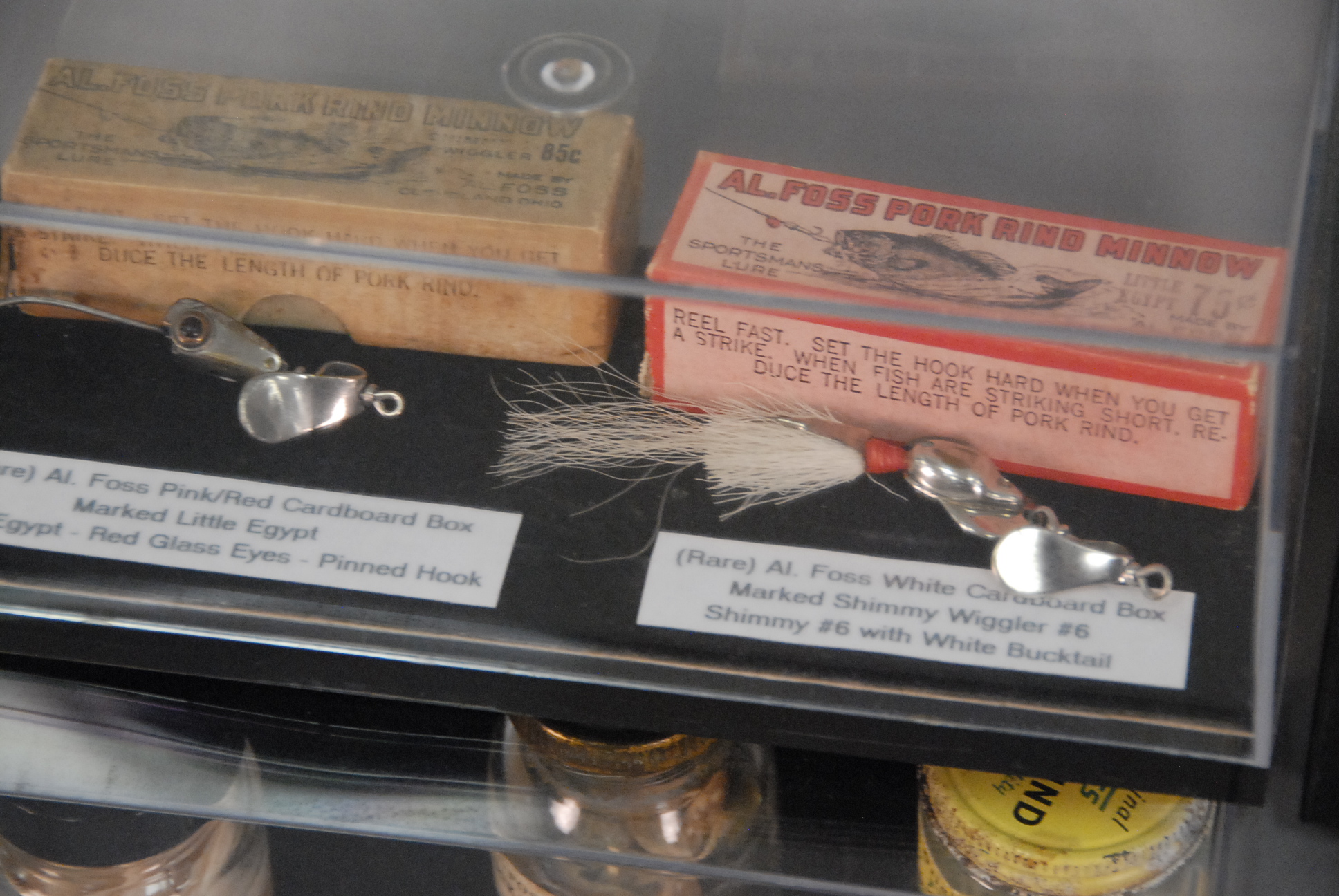 Lot 188: Group of five showcases with Al Foss Pork Rind minnows to include Dry Strip Hinged Tin, Oriental with box, rare Red cardboard box Li…