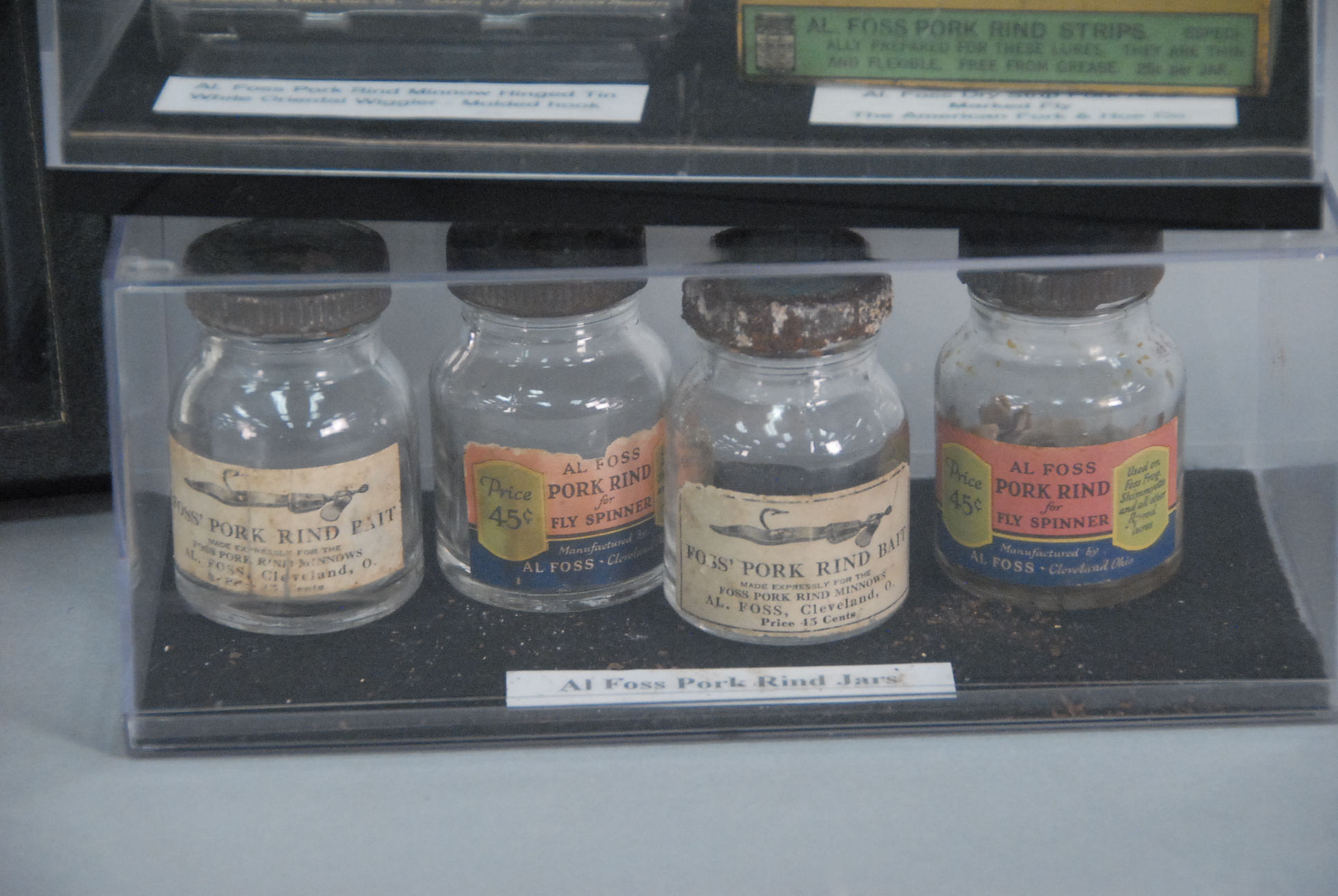 Group of five showcases with Al Foss Pork Rind minnows to include Dry Strip Hinged Tin, Oriental with box, rare Red cardboard box Little Egypt with red eyes, white boxed Shimmy Wiggler, Jazz Wiggler with paperwork, and seven Pork Rind jars.