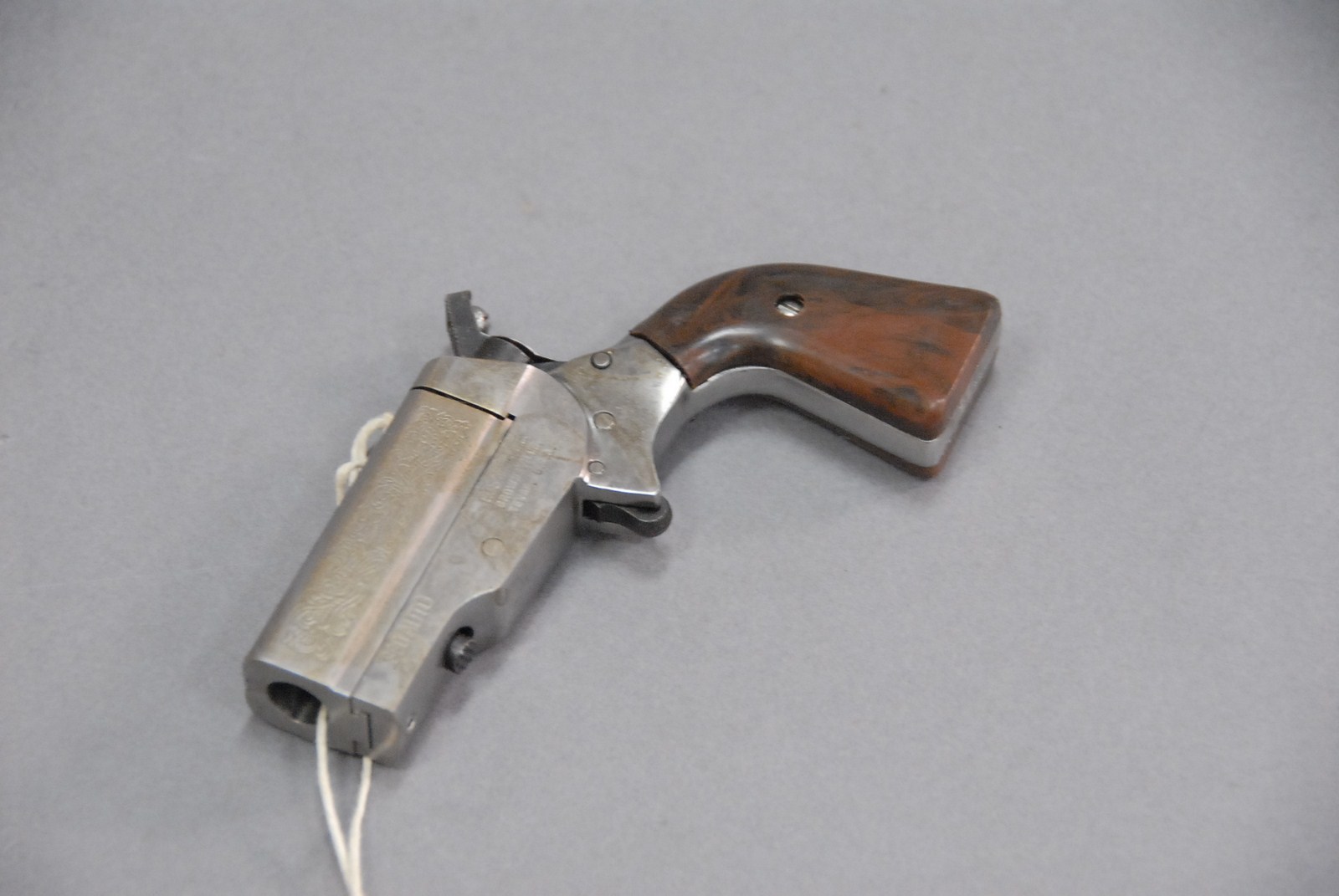 HJS Arms Inc., Derringer pistol, caliber .380 auto single shot Lone Star Derringer, 2 barrel, marked on side HJS Arms Inc., Brownsville, Texas USA. 232 SN-1198