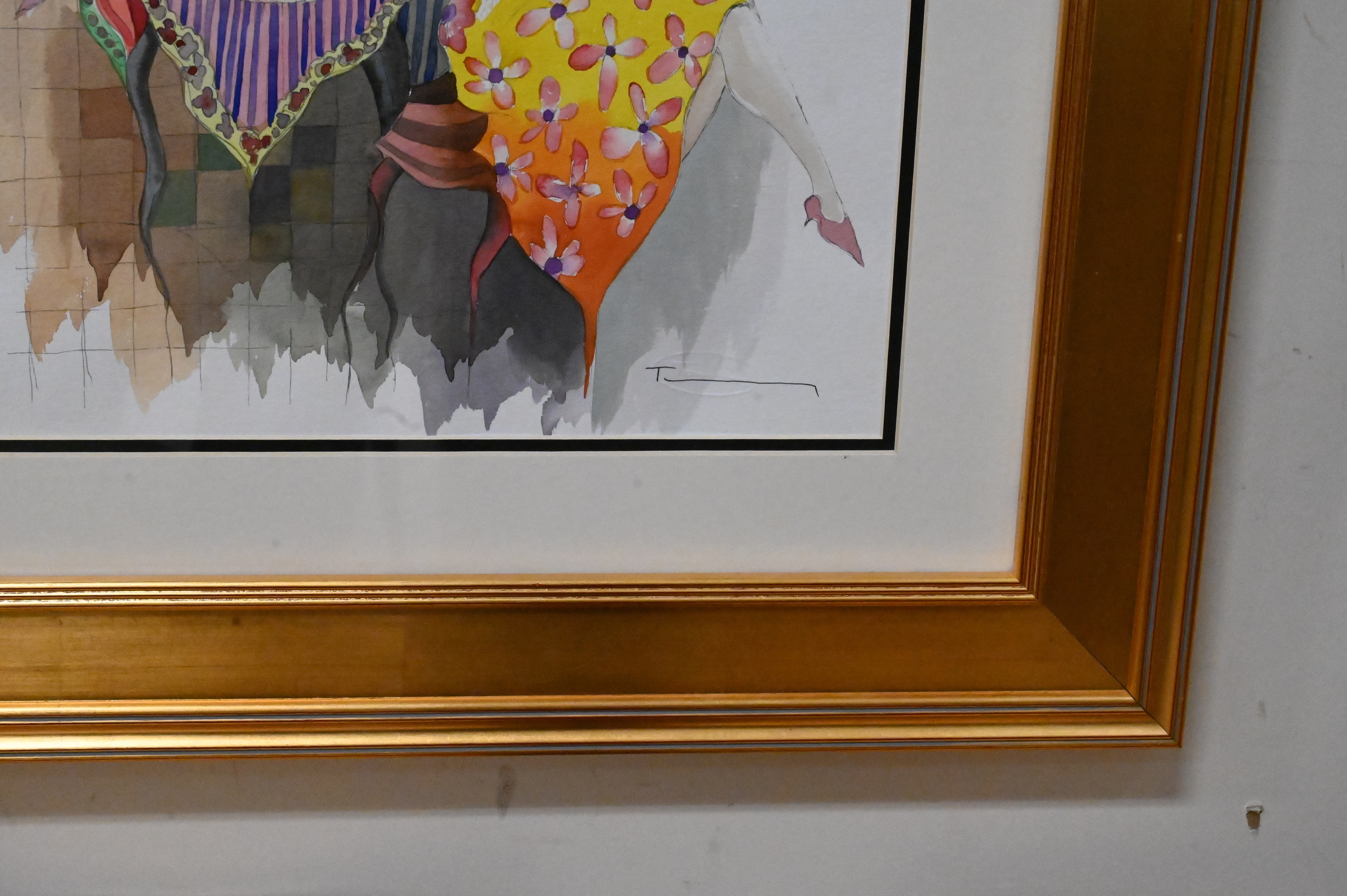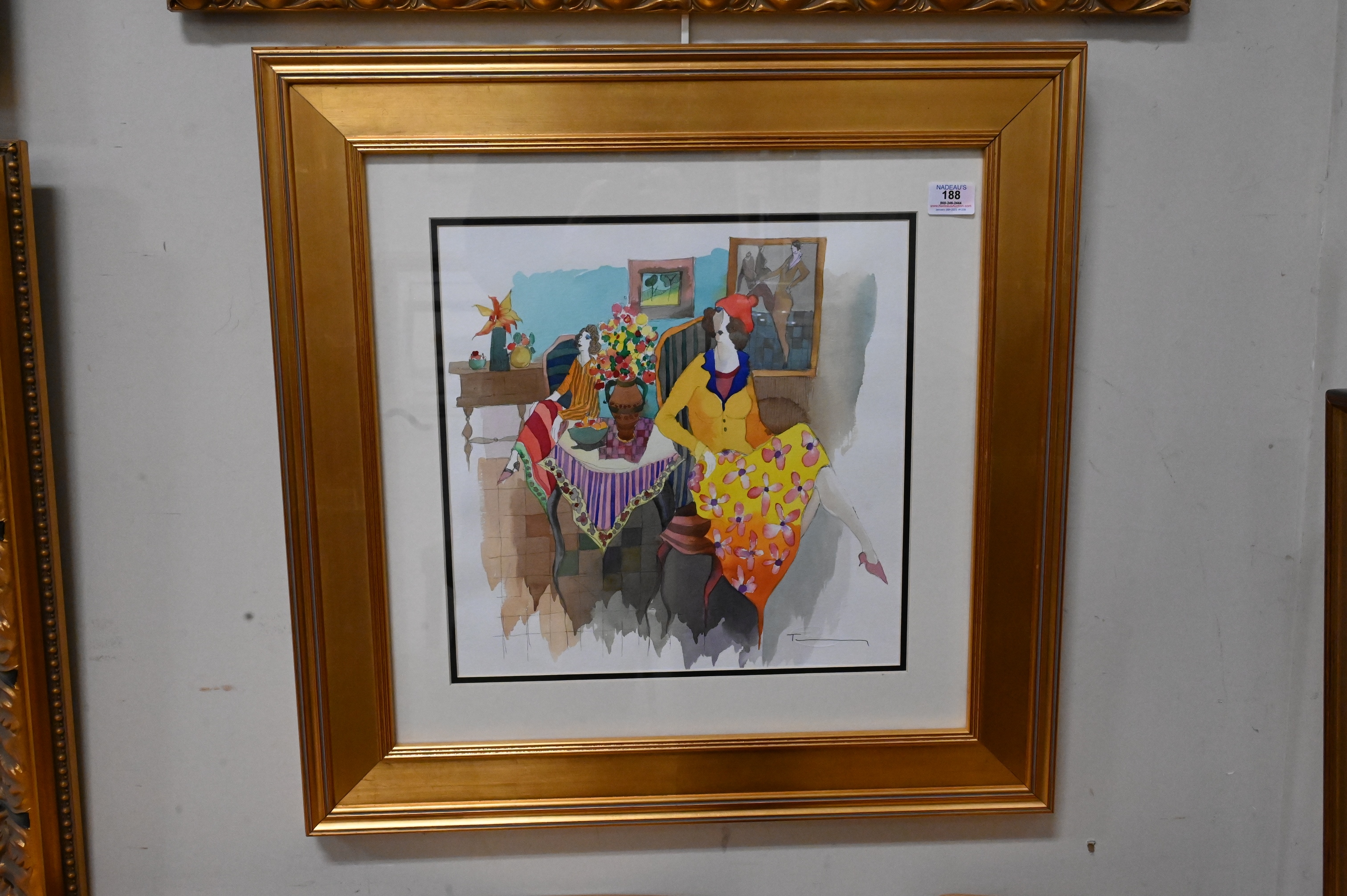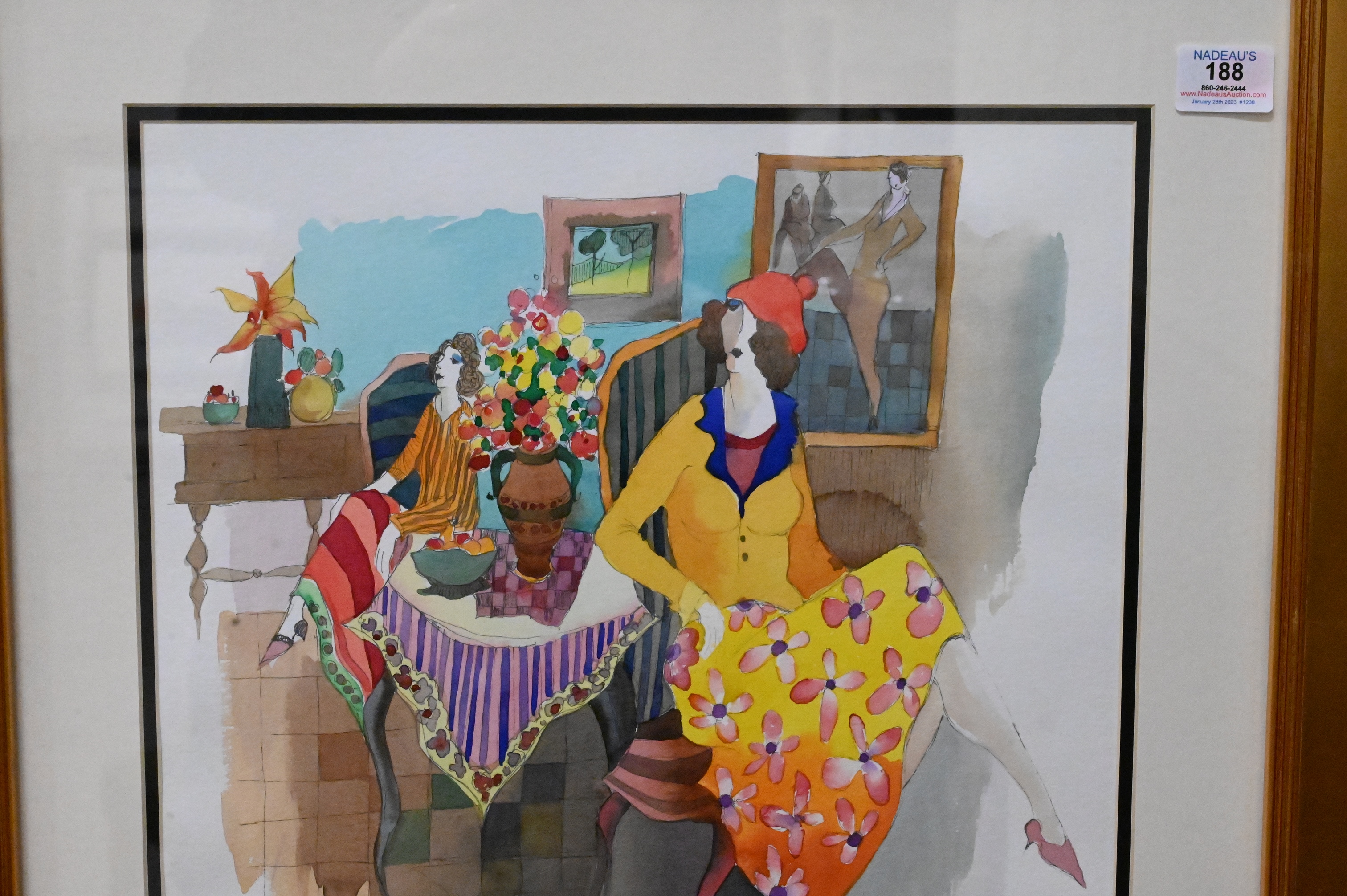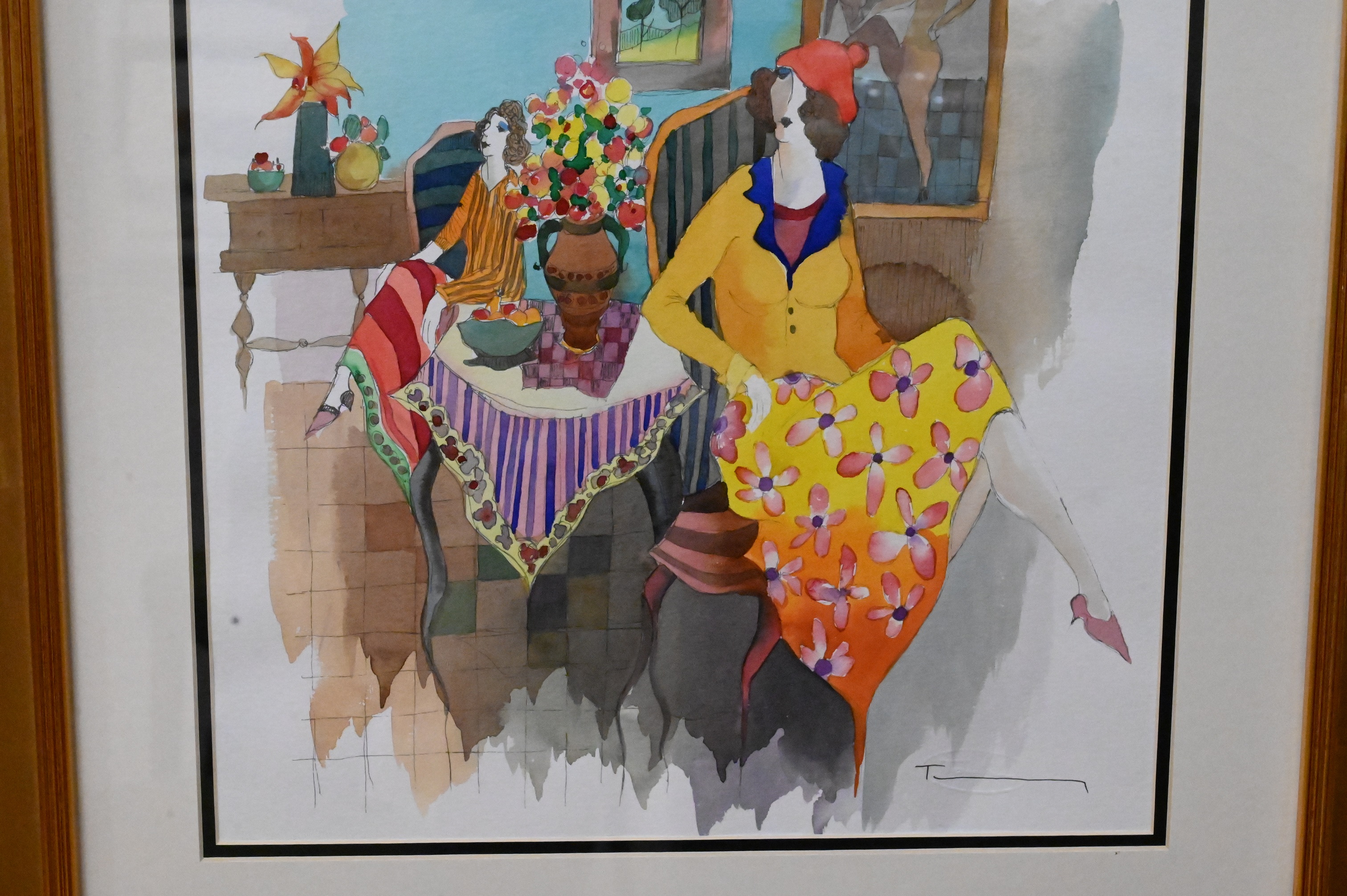 Itzchak Tarkay, watercolor and mixed media, untitled, two ladies sitting, signed Tarkay lower right, signed Bruria Tarkay on back, sight size 15″ x 15″.