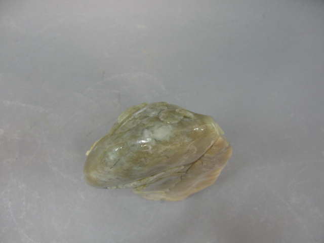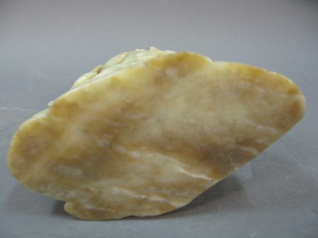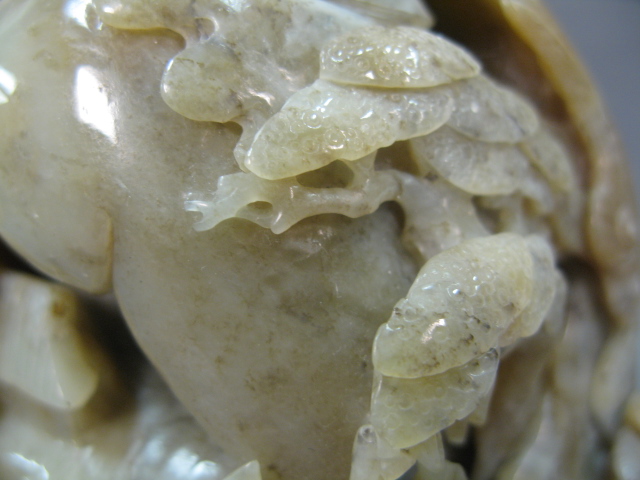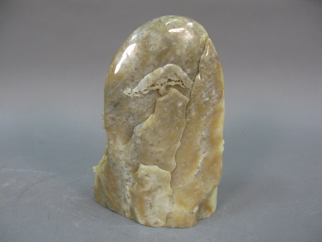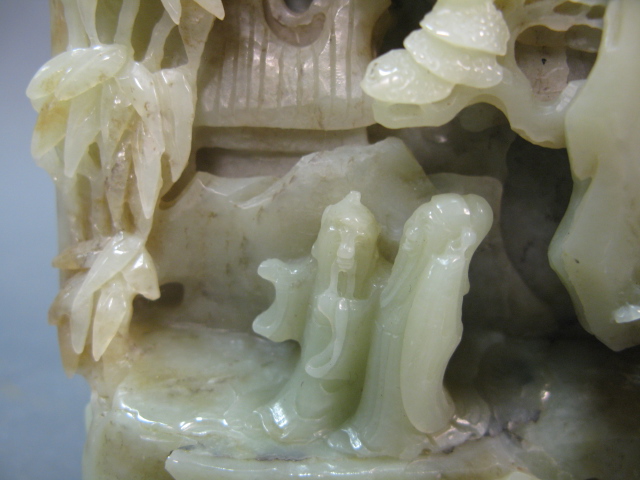 Large carved jade boulder carved in the form of a mountainous landscape with pine trees and figures inside.