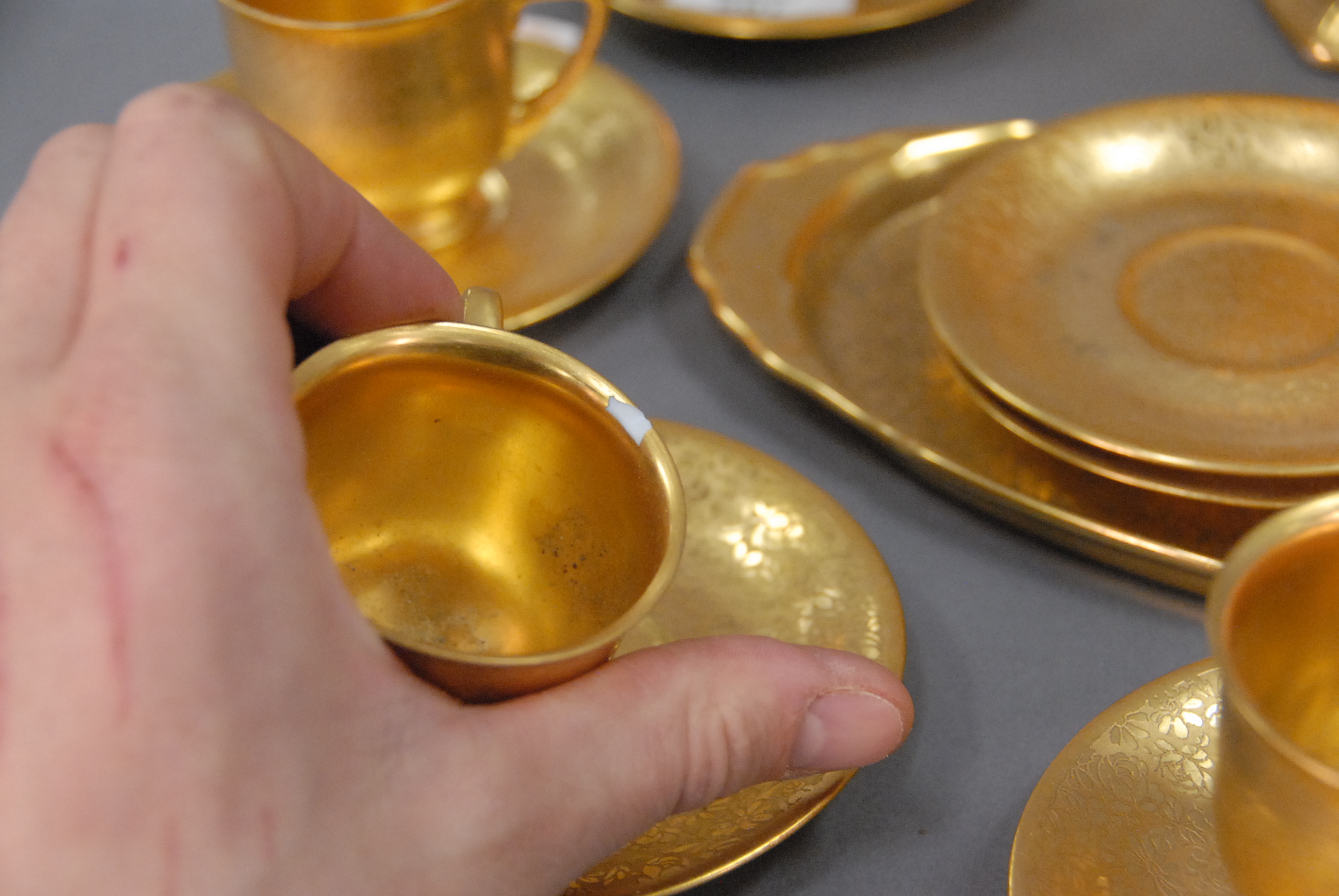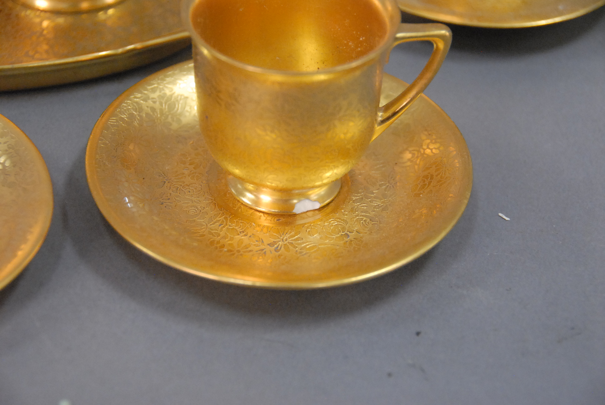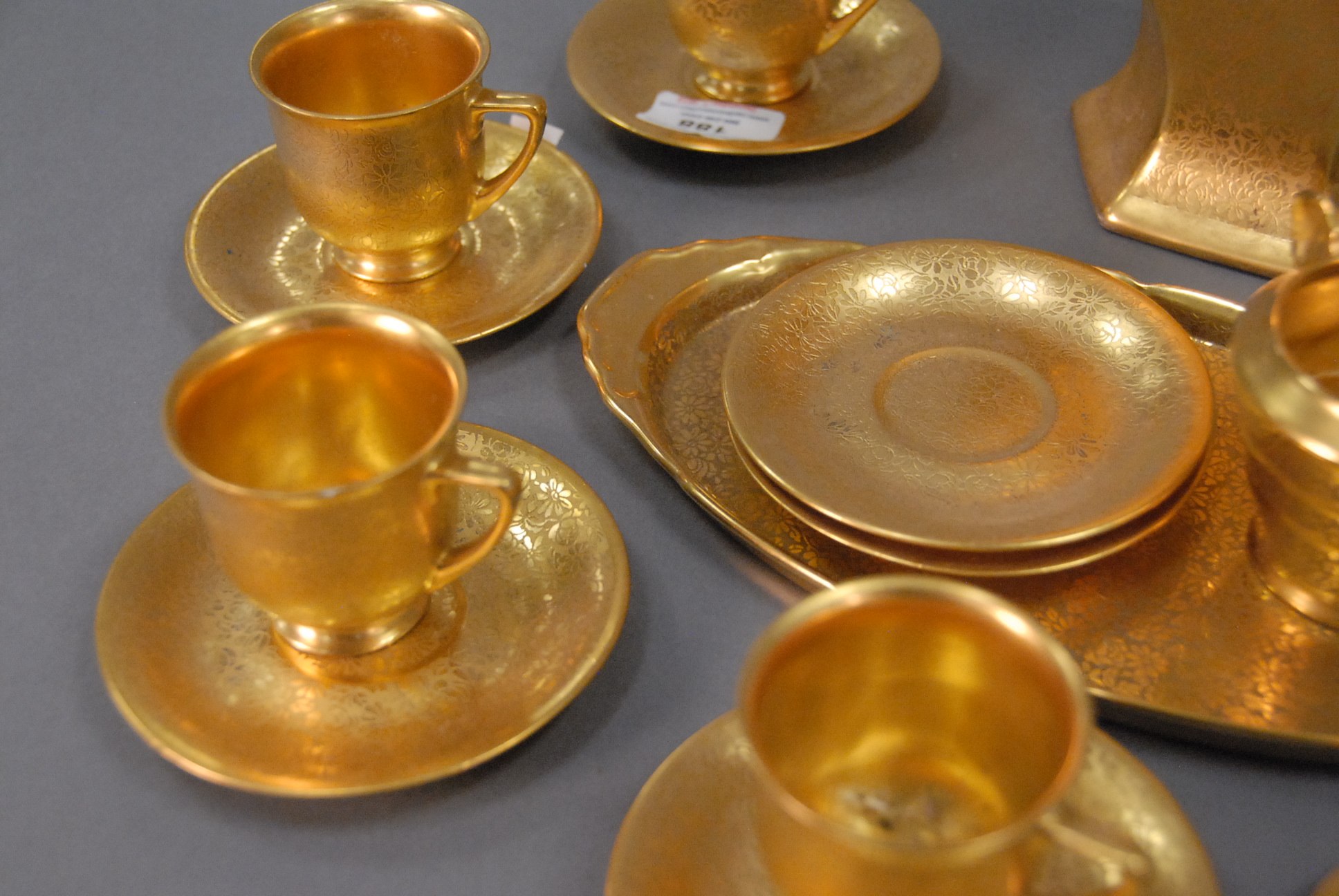 Pickard tea set with large pitcher, creamer, seven cups, nine saucers, and oval tray.