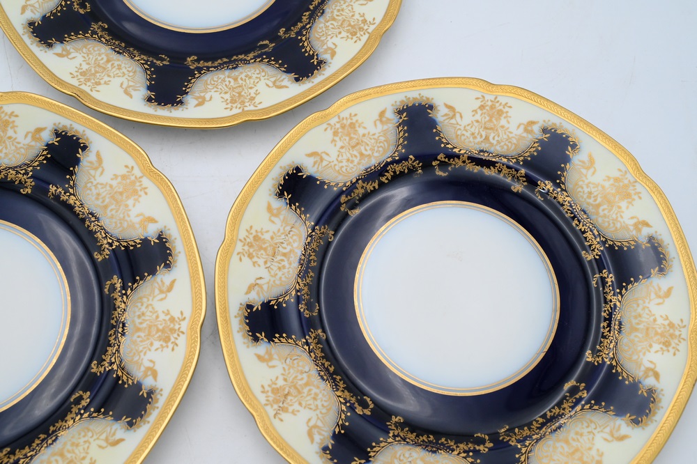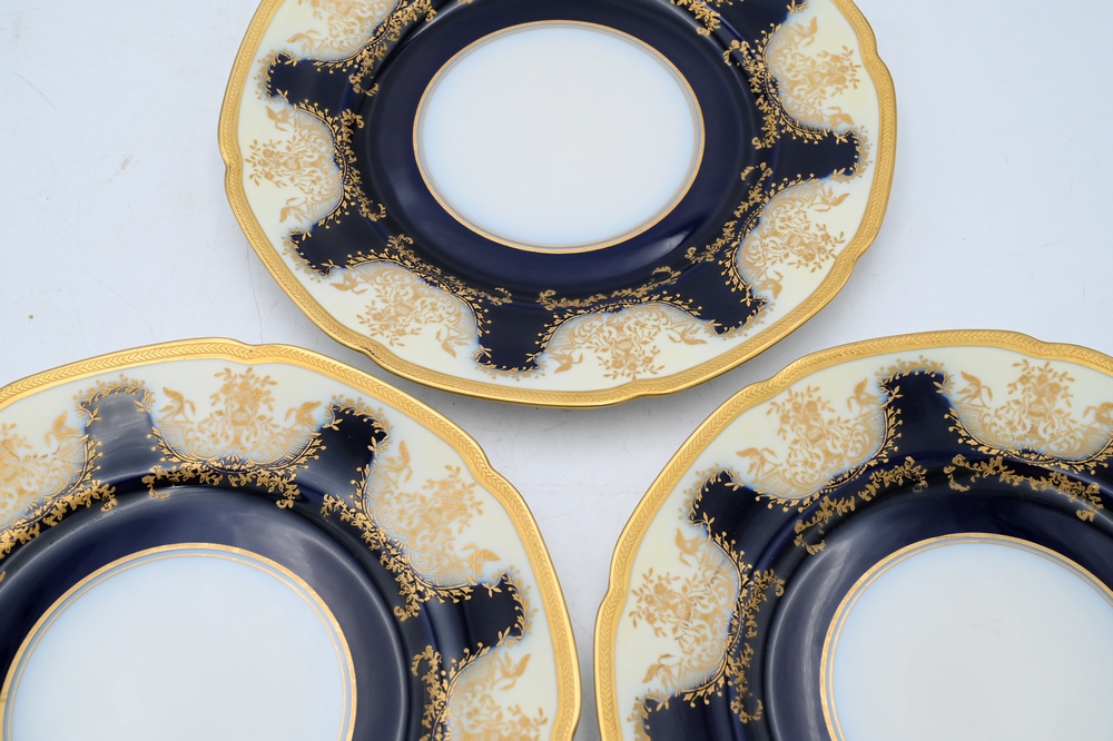 Set of 12 Hand Painted Limoges Dinner Plates, having cobalt and gold border, diameter 10 5/8 inches.