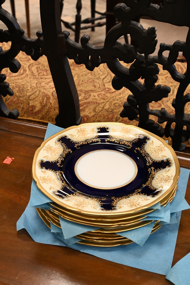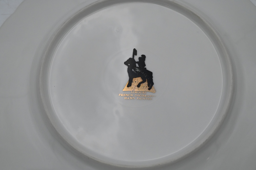 Lot 188: Set of 12 Hand Painted Limoges Dinner Plates, having cobalt and gold border, diameter 10 5/8 inches.