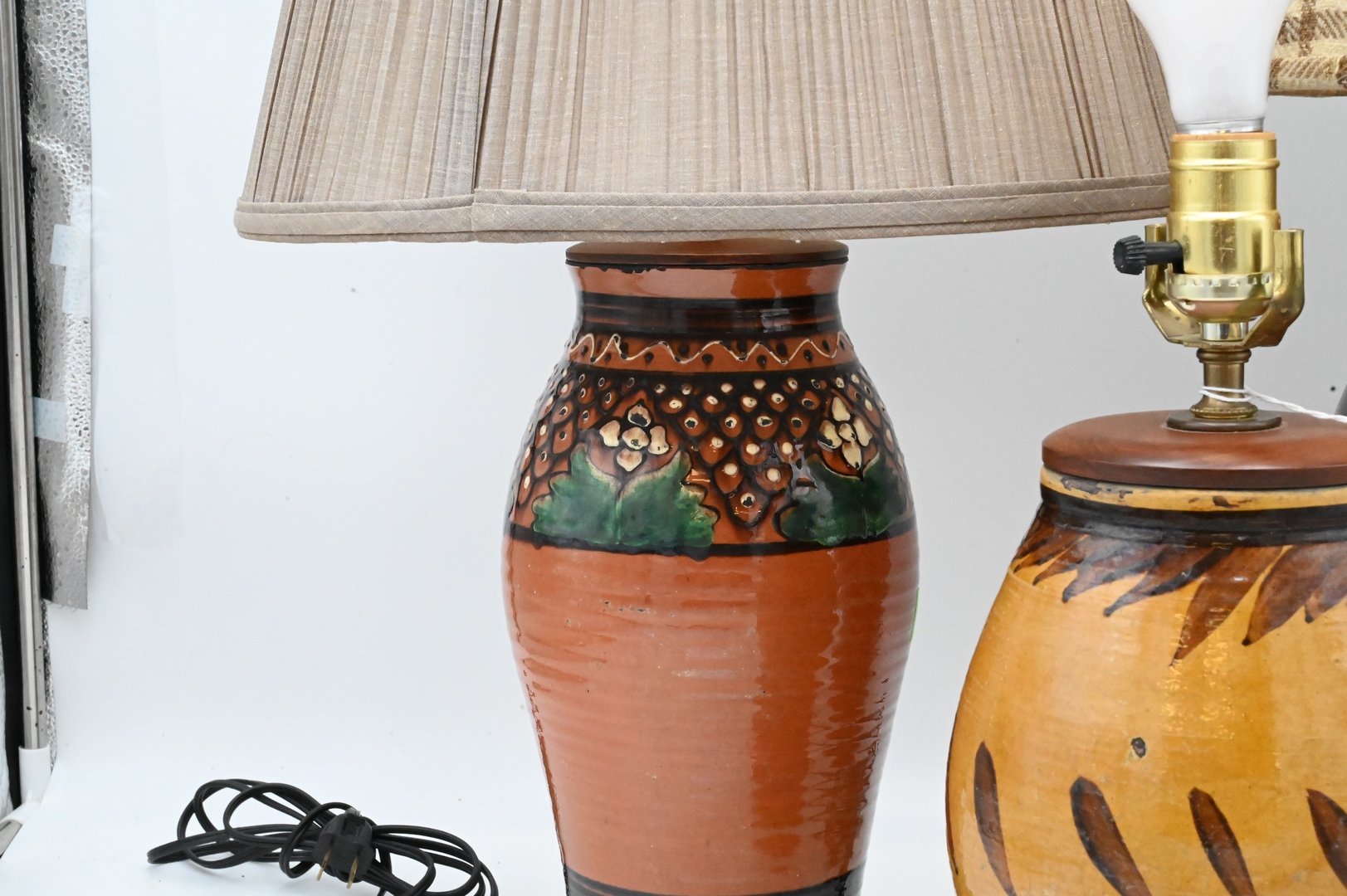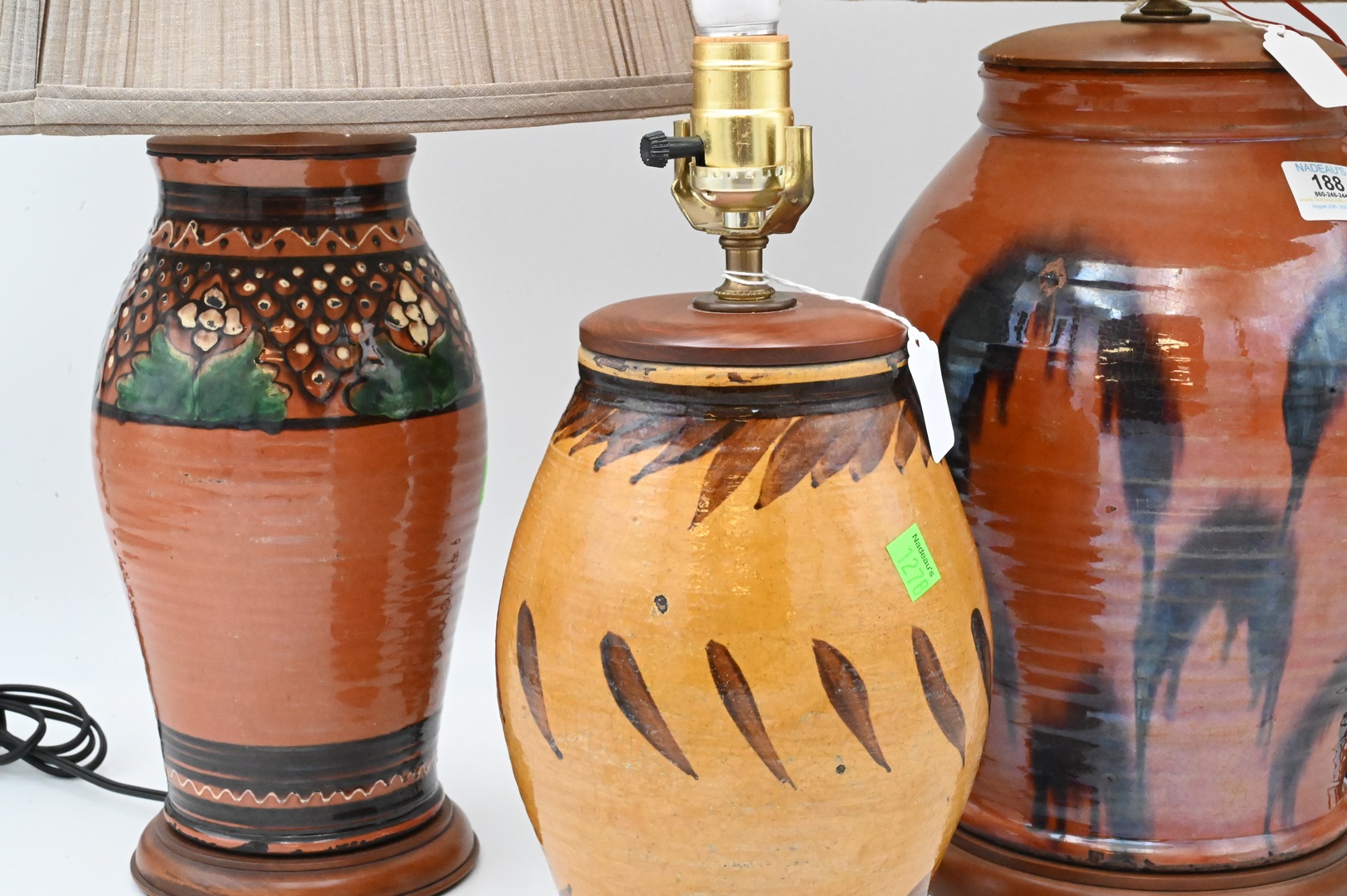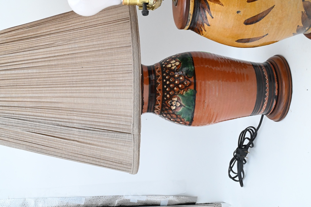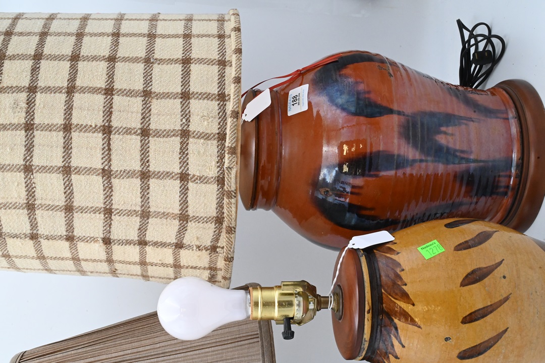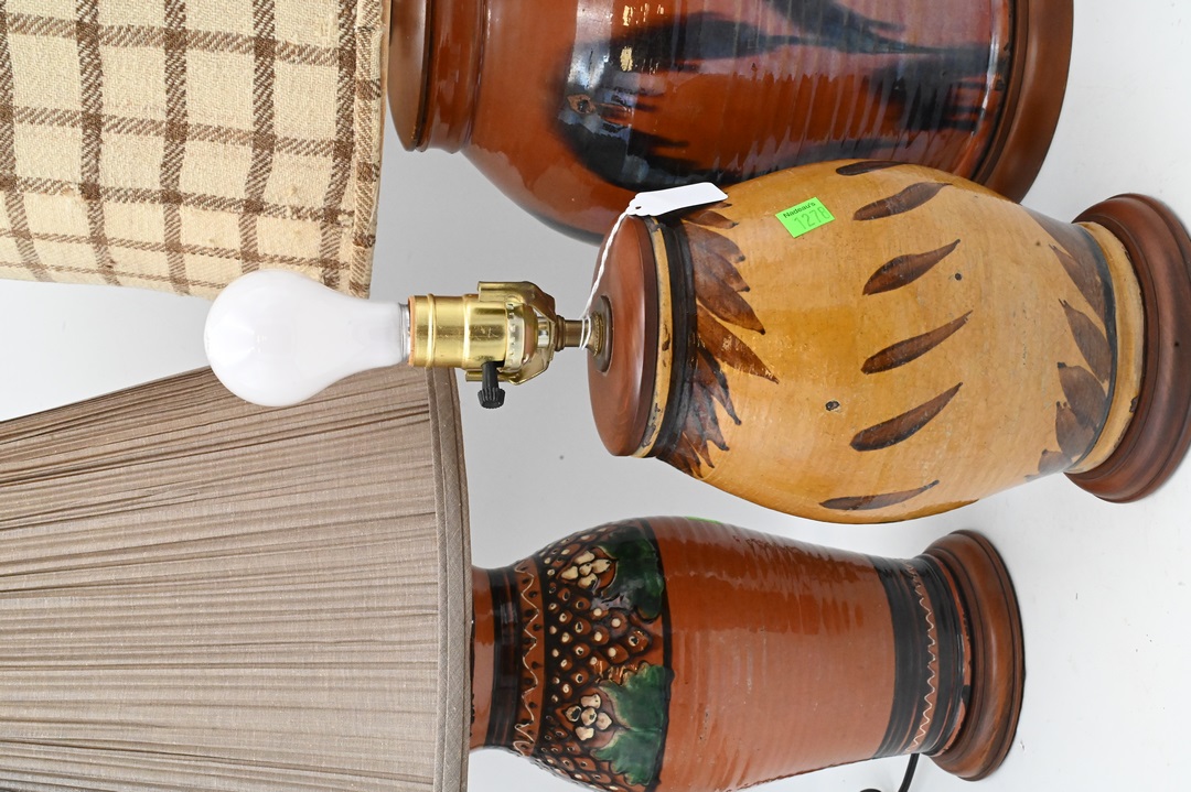 Three Large Redware Jars, made into table lamps, Christopher Woods 1990, having slipware decoration, brown glaze with flowers and a yellow glazed jar, jar height is 27 inches. Provenance: Estate of Peter Tillou, Litchfield, Connecticut.