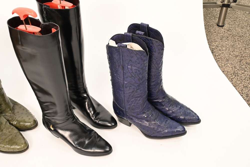Lot 188: Three Piece Lot of Designer Boots, to include Susan Bennis/Warren Edwards green ostrich boots, size 8, good condition; black leather…
