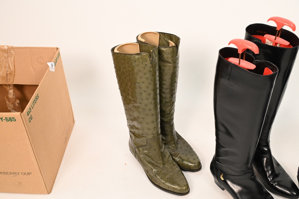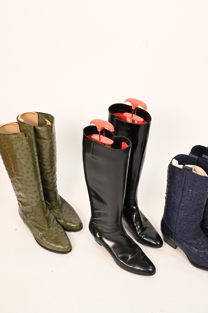 Three Piece Lot of Designer Boots, to include Susan Bennis/Warren Edwards green ostrich boots, size 8, good condition; black leather Salvatore Ferragamo tall boots, size 8, lightly worn; along with Bennis Edwards blue ostrich cowboy boots, size 8, never worn.