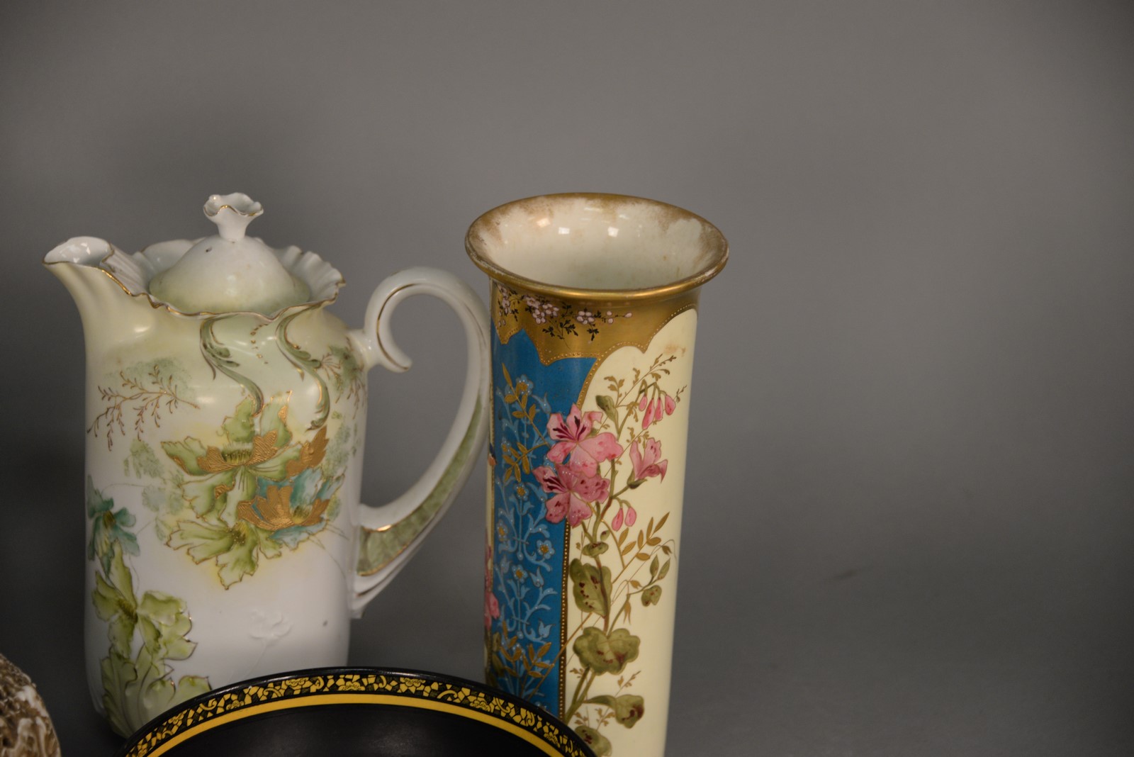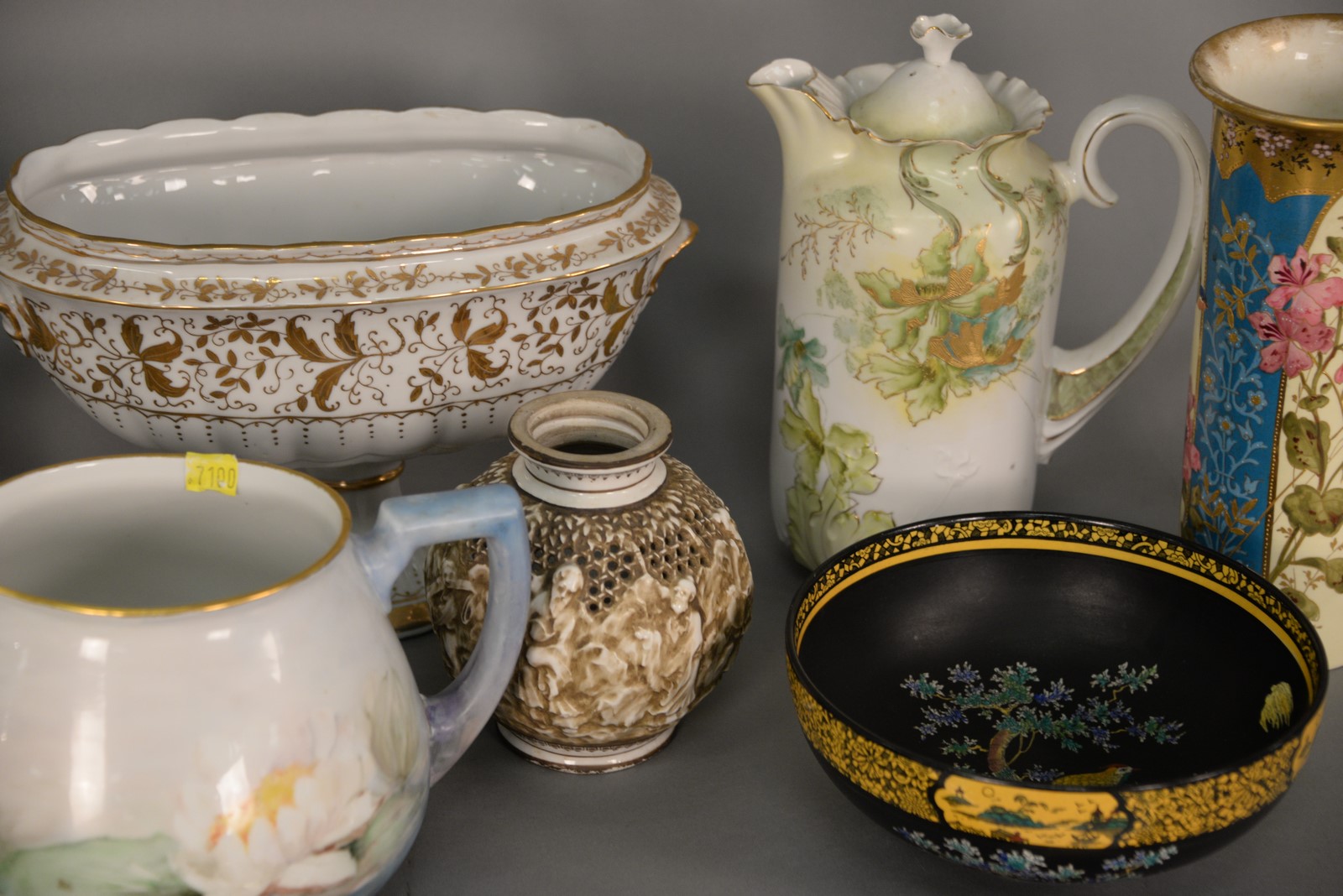 Twelve pieces of porcelain including three coffee pots, hand painted Bavaria pitcher, two vases, pair of Haviland Limoges vegetable dishes, large footed urn, Carltonware Stoke on Trent bowl, dresser tray, and large footed bowl. vegetable dishes: lg. 9 3/4 in., footed bowl: dia. 9 1/2 in.