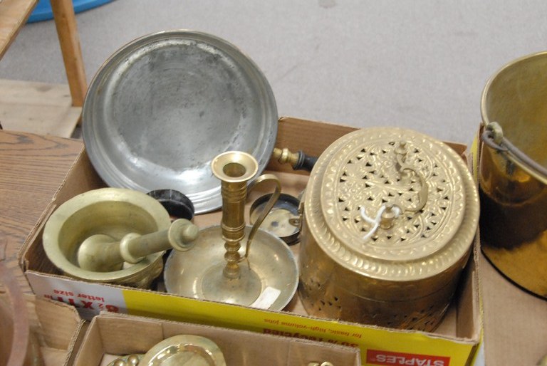 Lot 188: Two box lots of brass snippers and trays, candlesticks, censor, mortar and pestle.