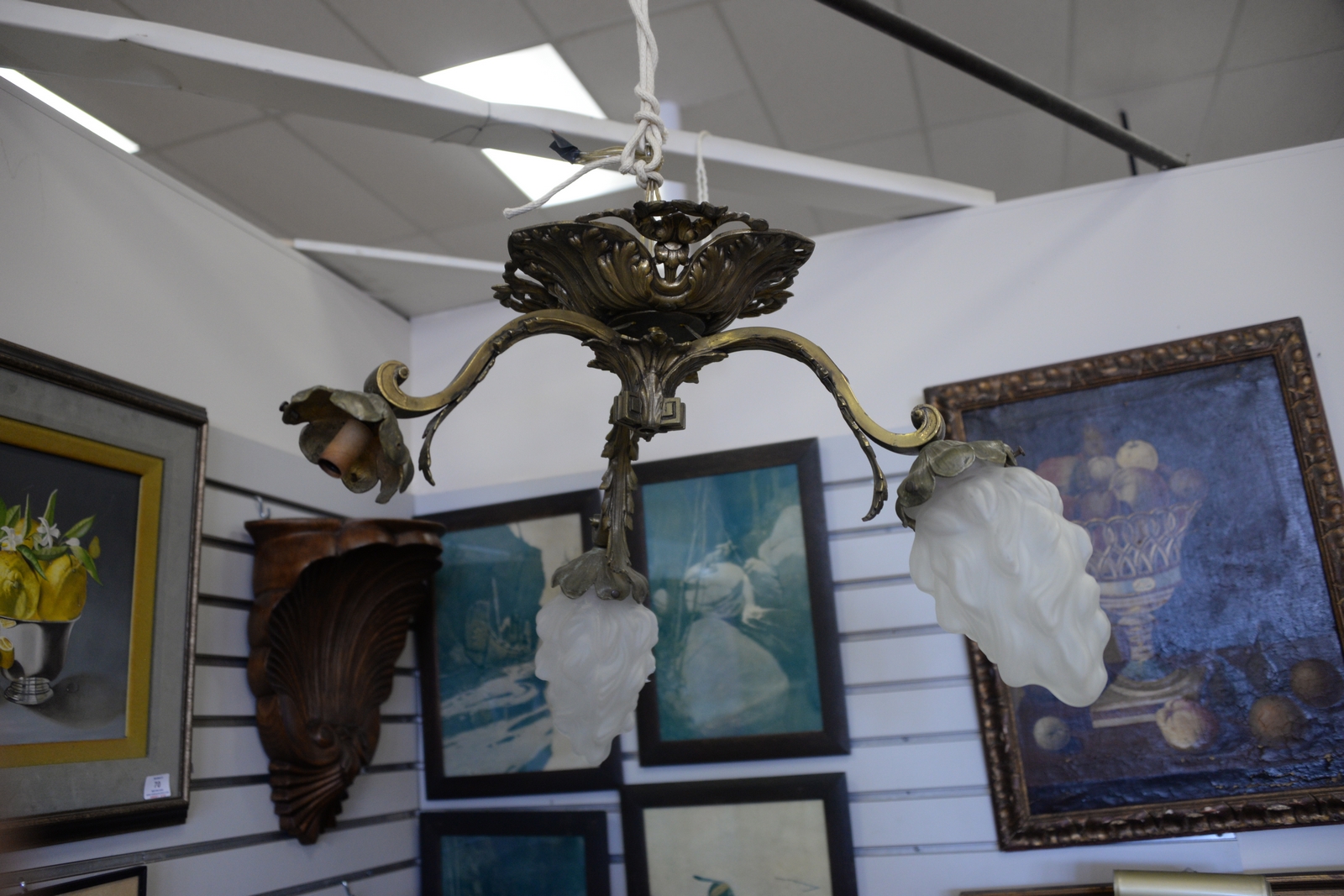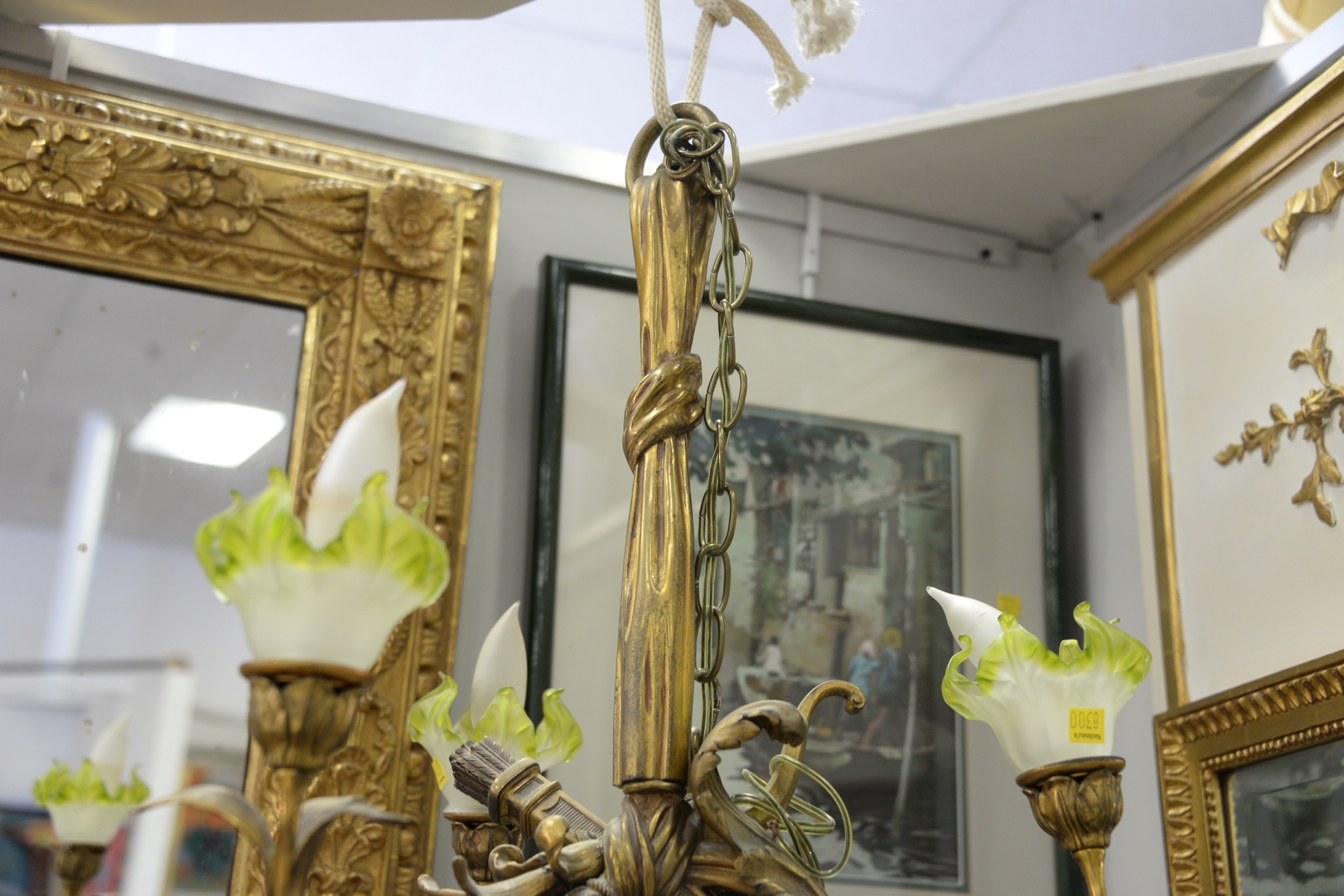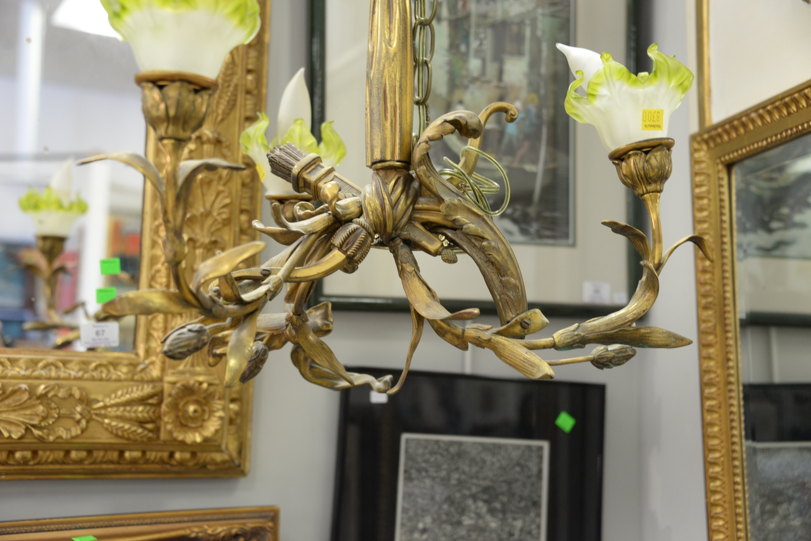 Lot 188: Two piece lot including French style three light chandelier with heavy brass flower and leaf design and green and clear frosted glas…