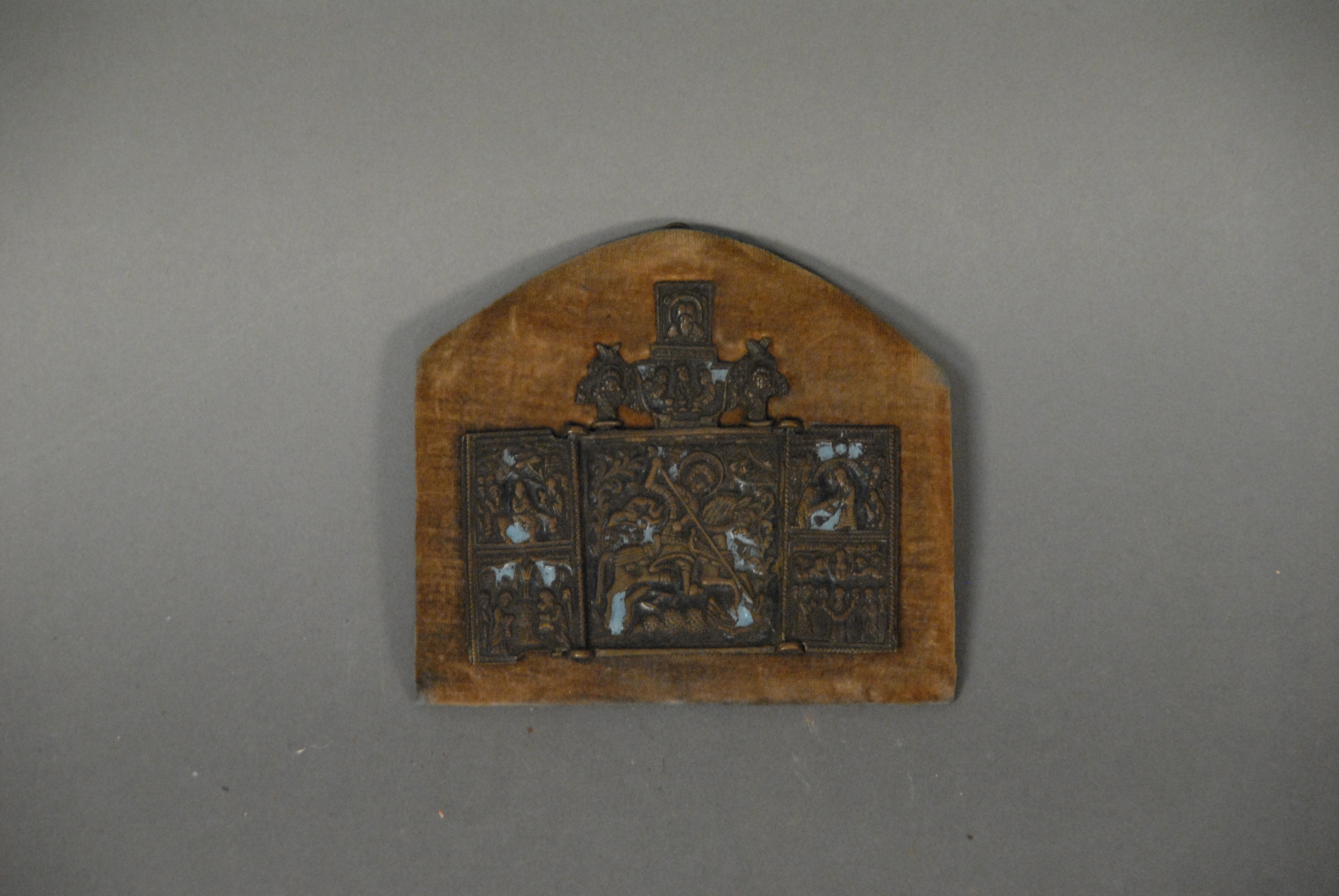 Russian bronze icon with enameling and two sides that close, mounted on cloth panel, probably 18th century.