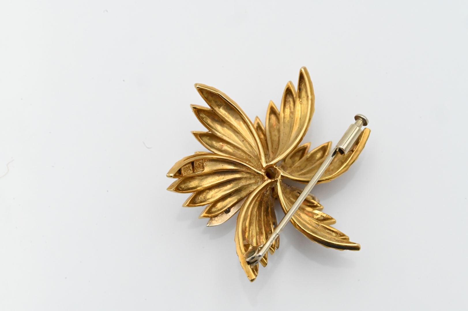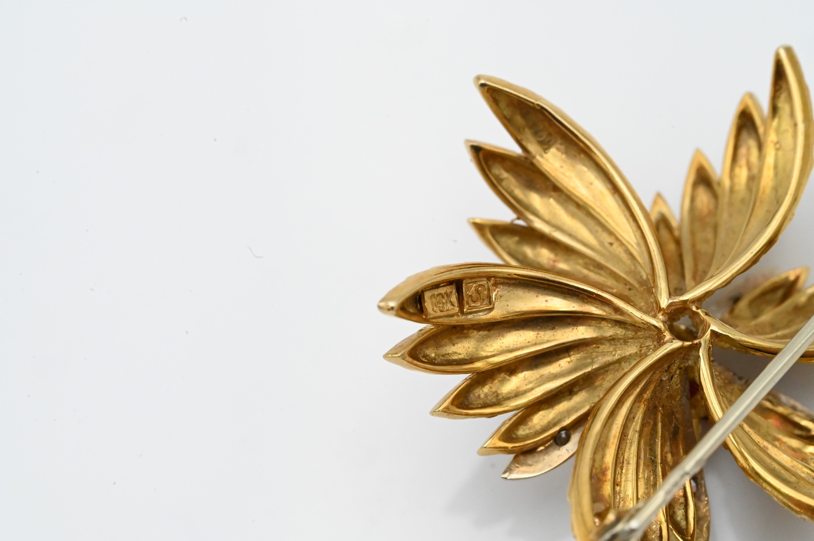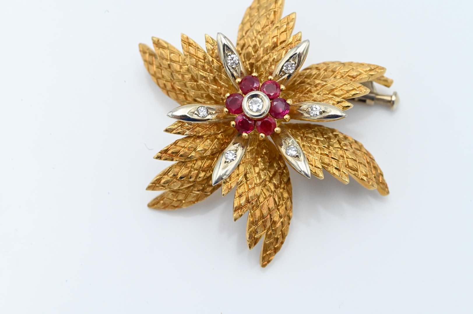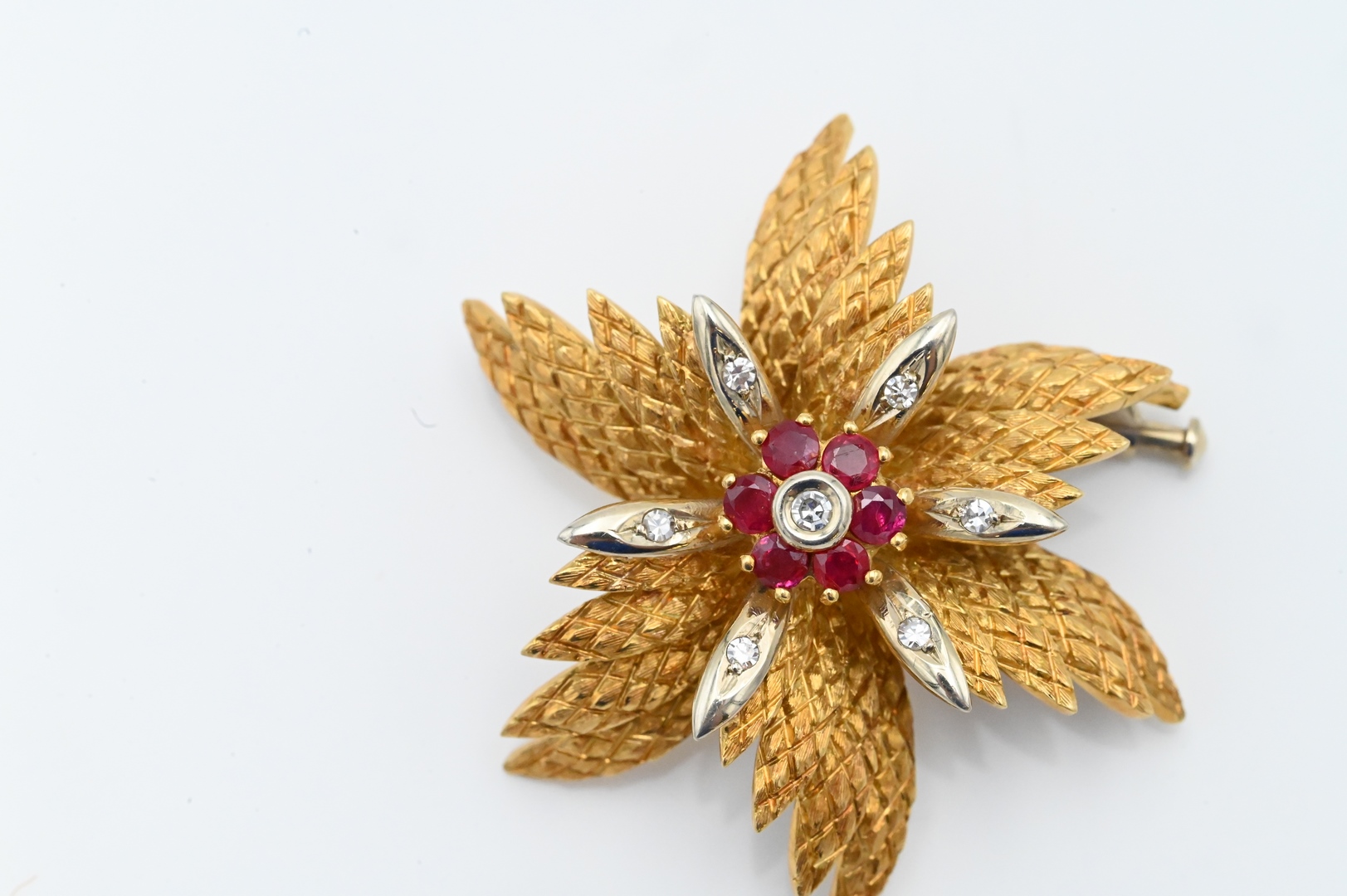 in the form of a flower with diamond and red stone center, along with diamond petals