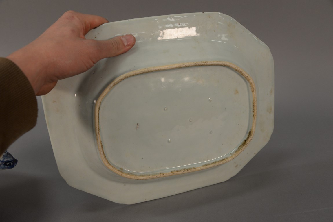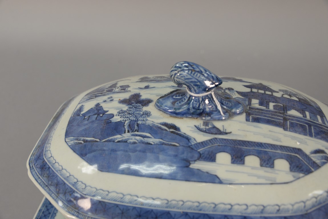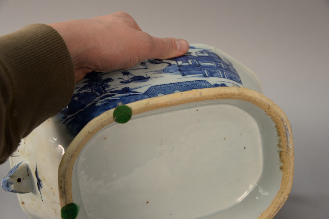 Lot 189: Canton covered tureen plus platter, tureen with boar head handles platter with chips. tureen: ht. 8 1/2 in. lg. 12 1/2 in. …