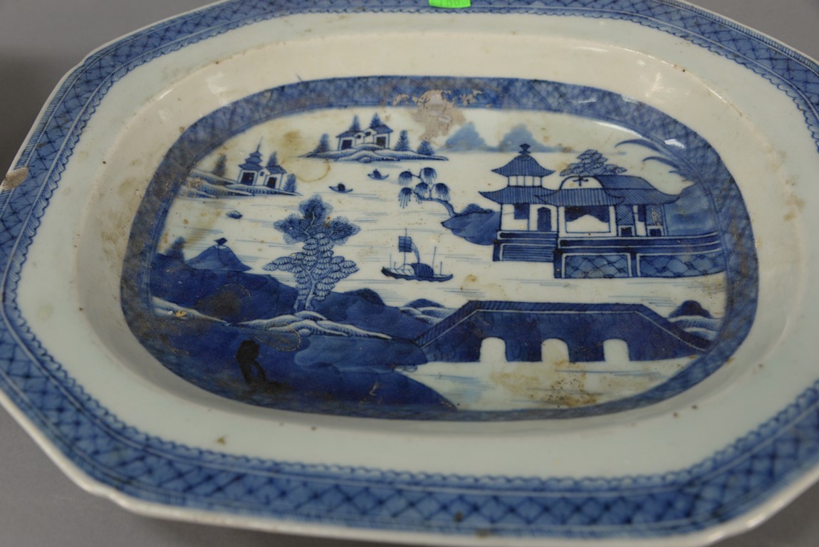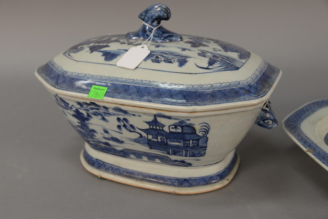 Canton covered tureen plus platter, tureen with boar head handles platter with chips. tureen: ht. 8 1/2 in. lg. 12 1/2 in. platter: lg. 14 in. wd. 11 in.