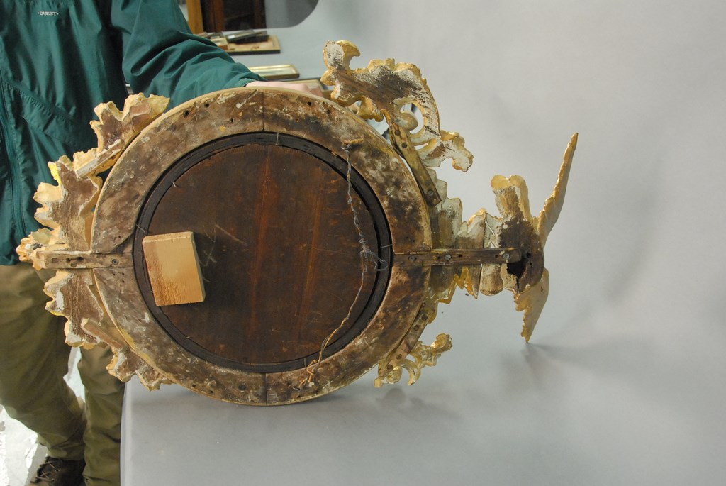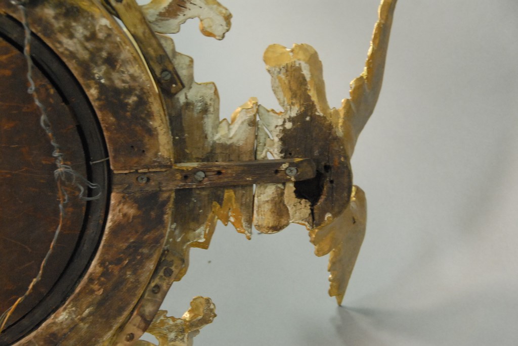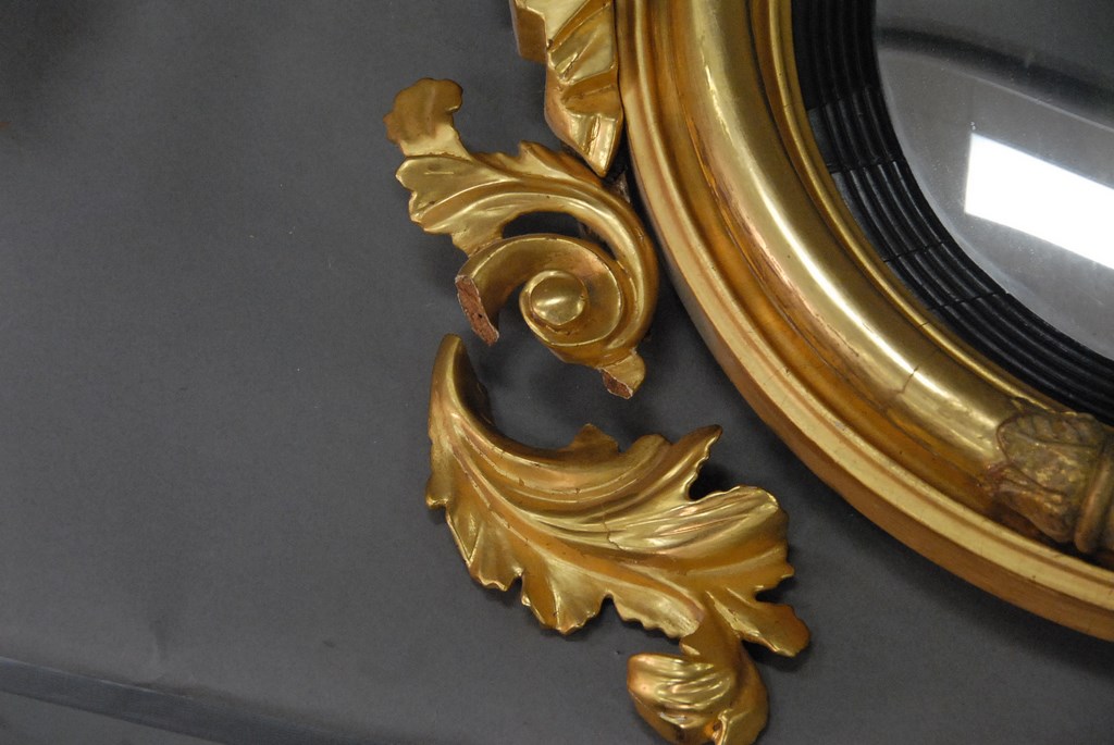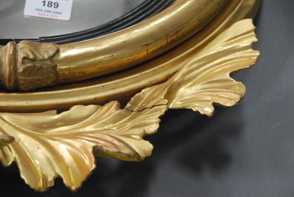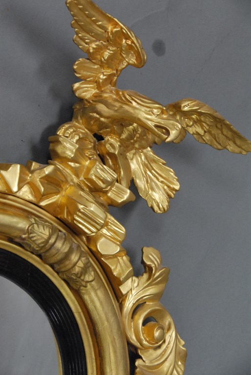 Lot 189: Federal girandole mirror with eagle finial and scrolled sides and bottom repair on one side scroll. ht. 31in. wd. 21in.