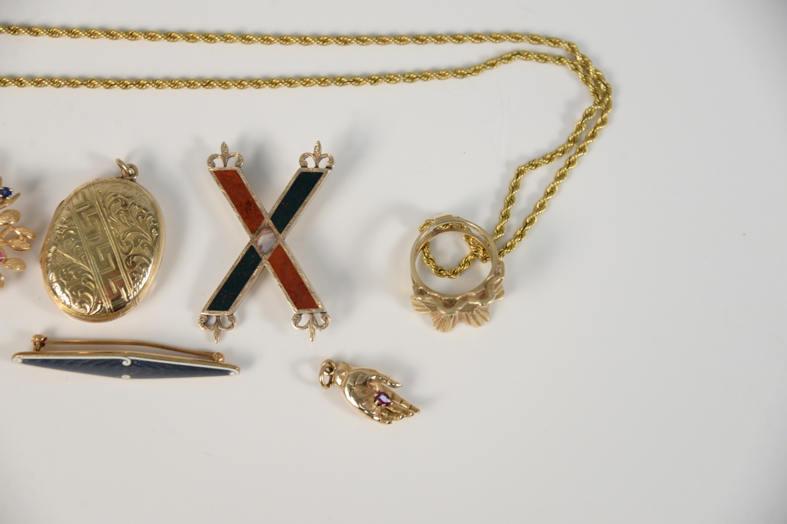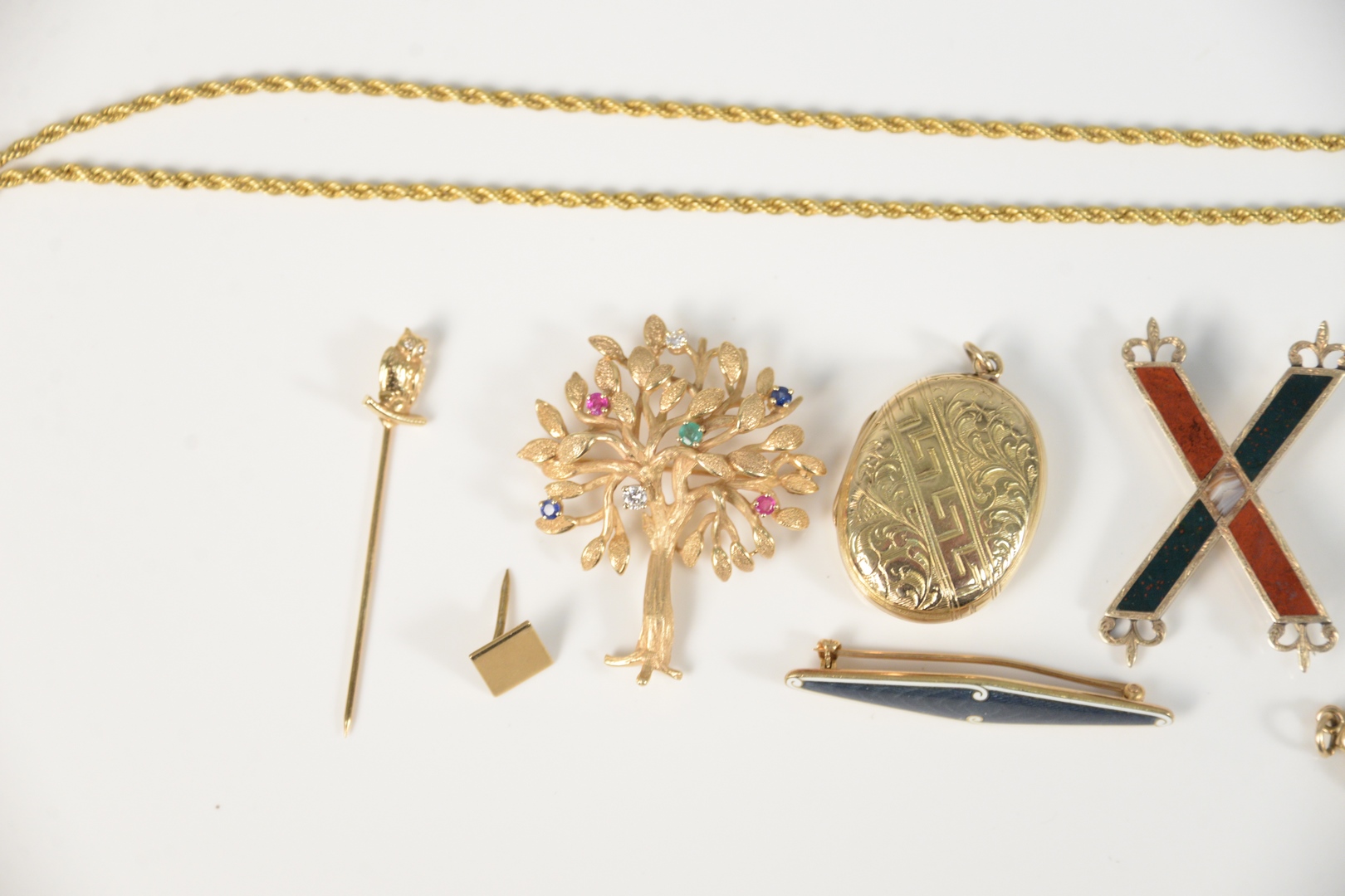 Lot 189: Group of 14K gold ring, pin, locket, chain, stickpin and charm, total weight 49.9 gr. Provenance: Estate of Dr. Thomas & Alice Kugel…