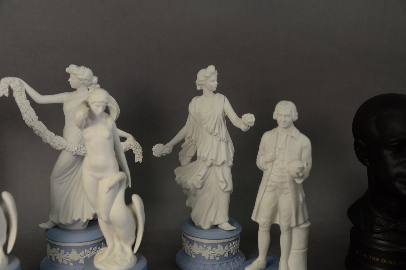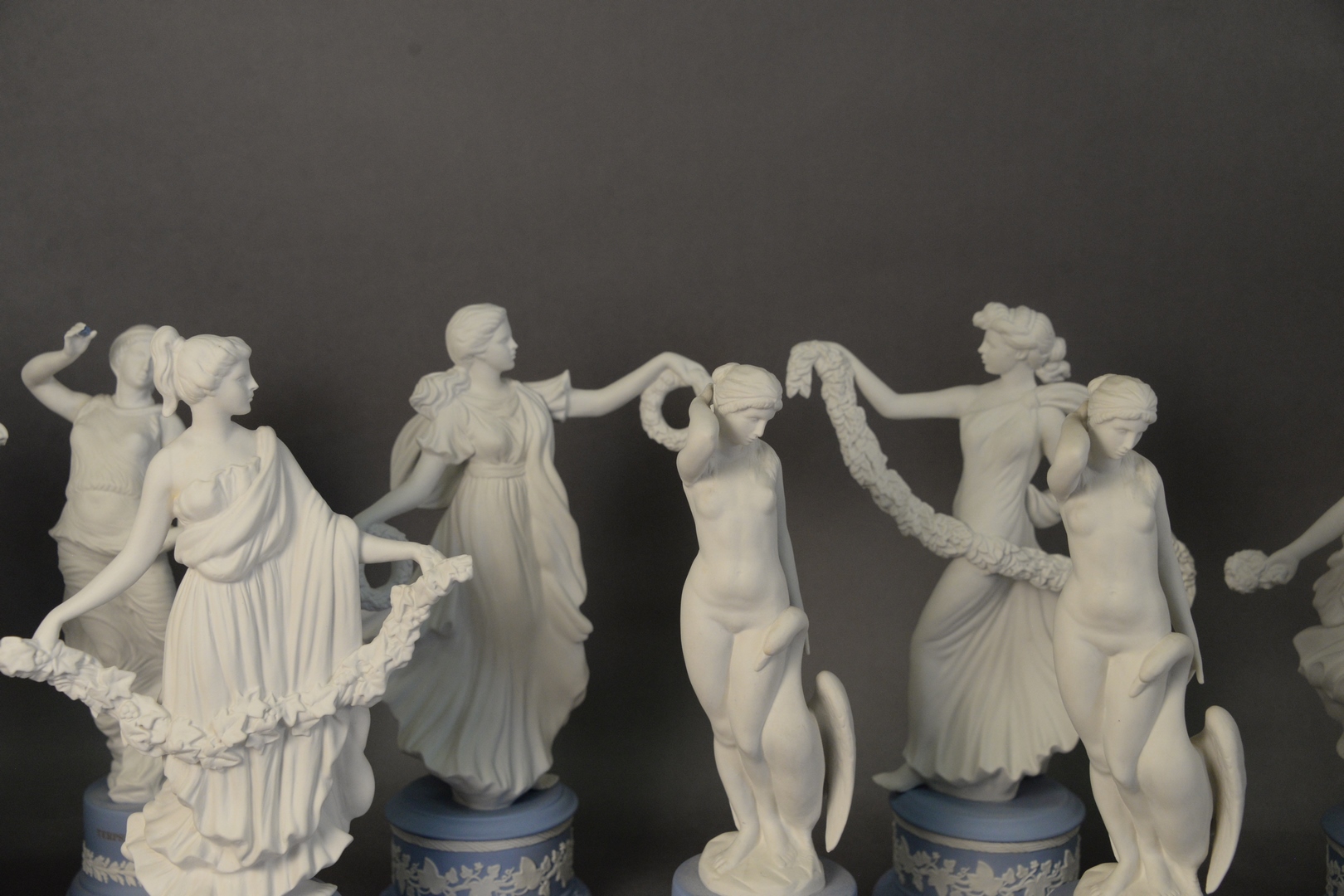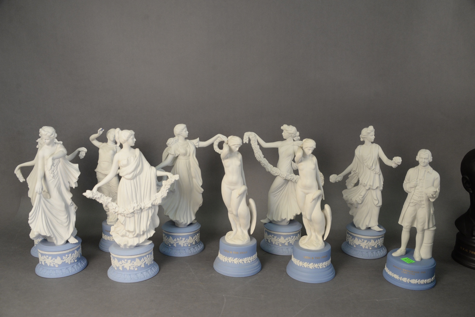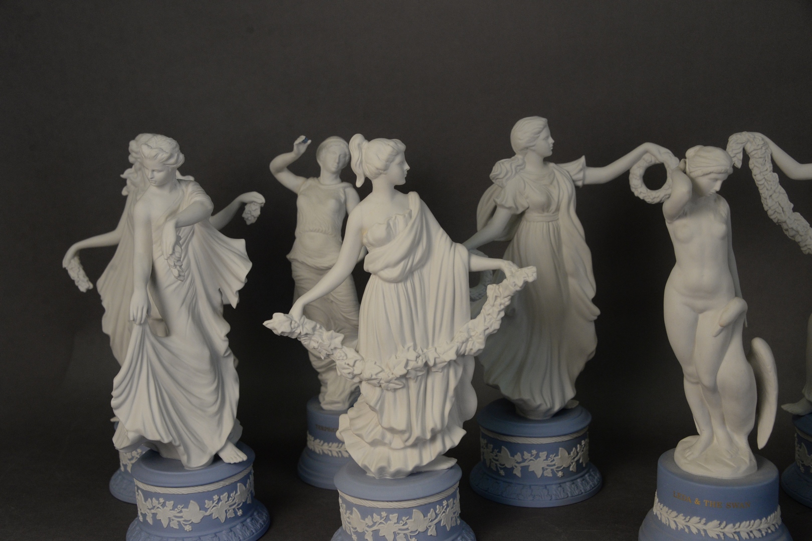 Group of Ten Wedgewood Figures, two being Leda and the Swan, Terpichore, Josiah, and six “Dancing Hours” marked limited edition each numbered, modeled by Martin Evans, all on Jasperware blue bases, tallest height 10 1/2 inches. Provenance: Estate of James Wadhams.