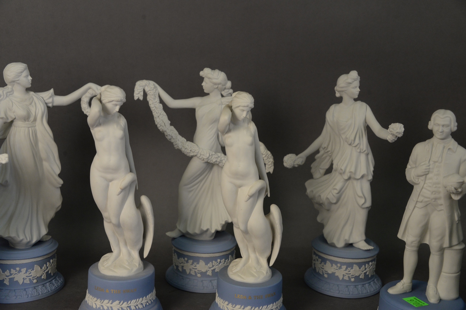 Lot 189: Group of Ten Wedgewood Figures, two being Leda and the Swan, Terpichore, Josiah, and six “Dancing Hours” marked limited edition each numbered, modeled by Martin Evans, all on Jasperware blue bases, tallest height 10 1/2 inches. Provenance: Estate of James Wadhams.