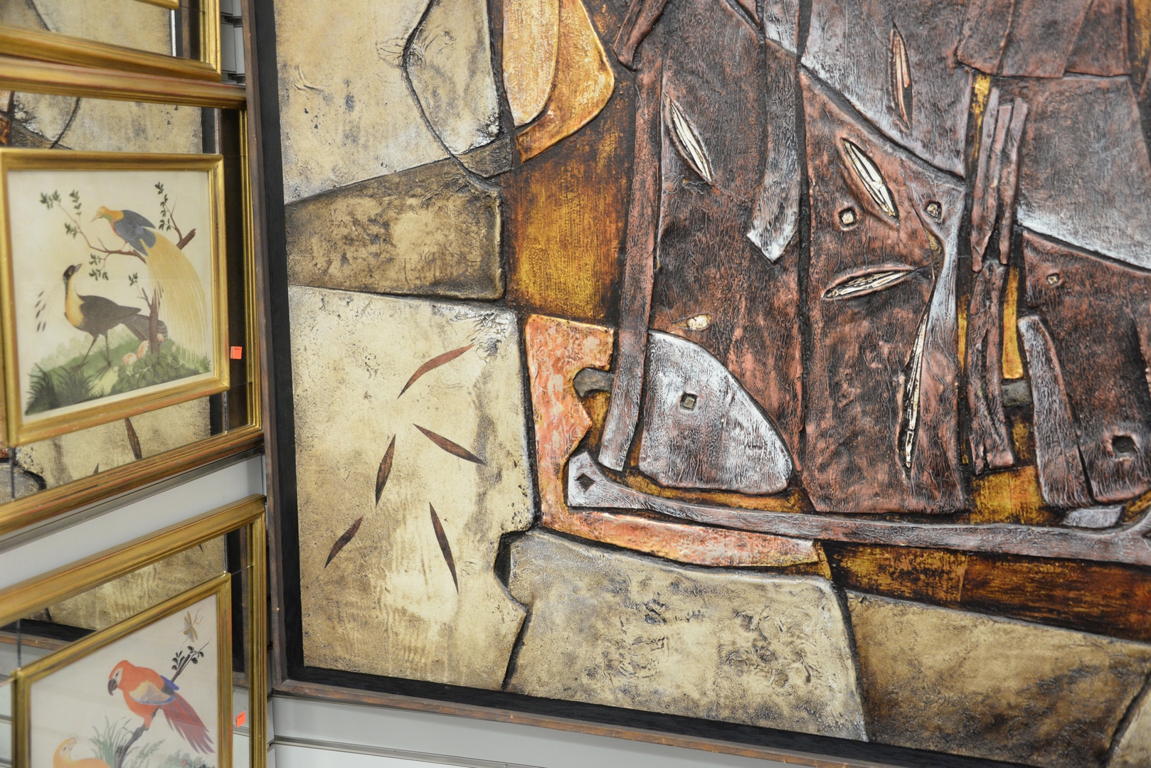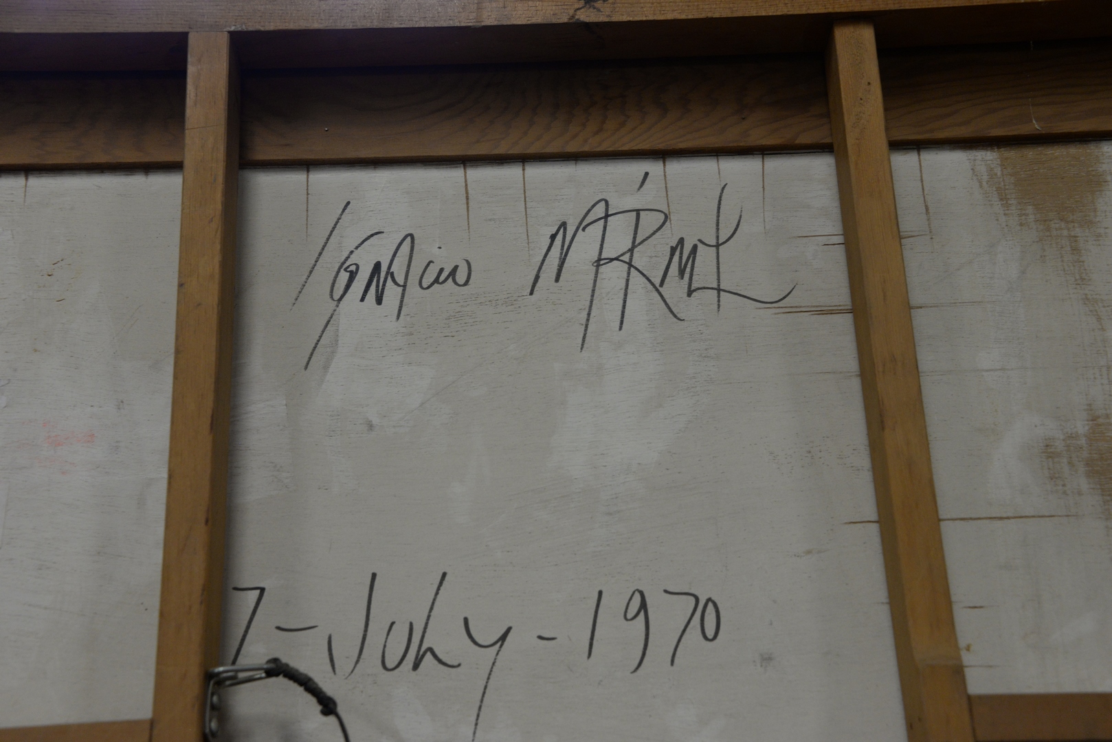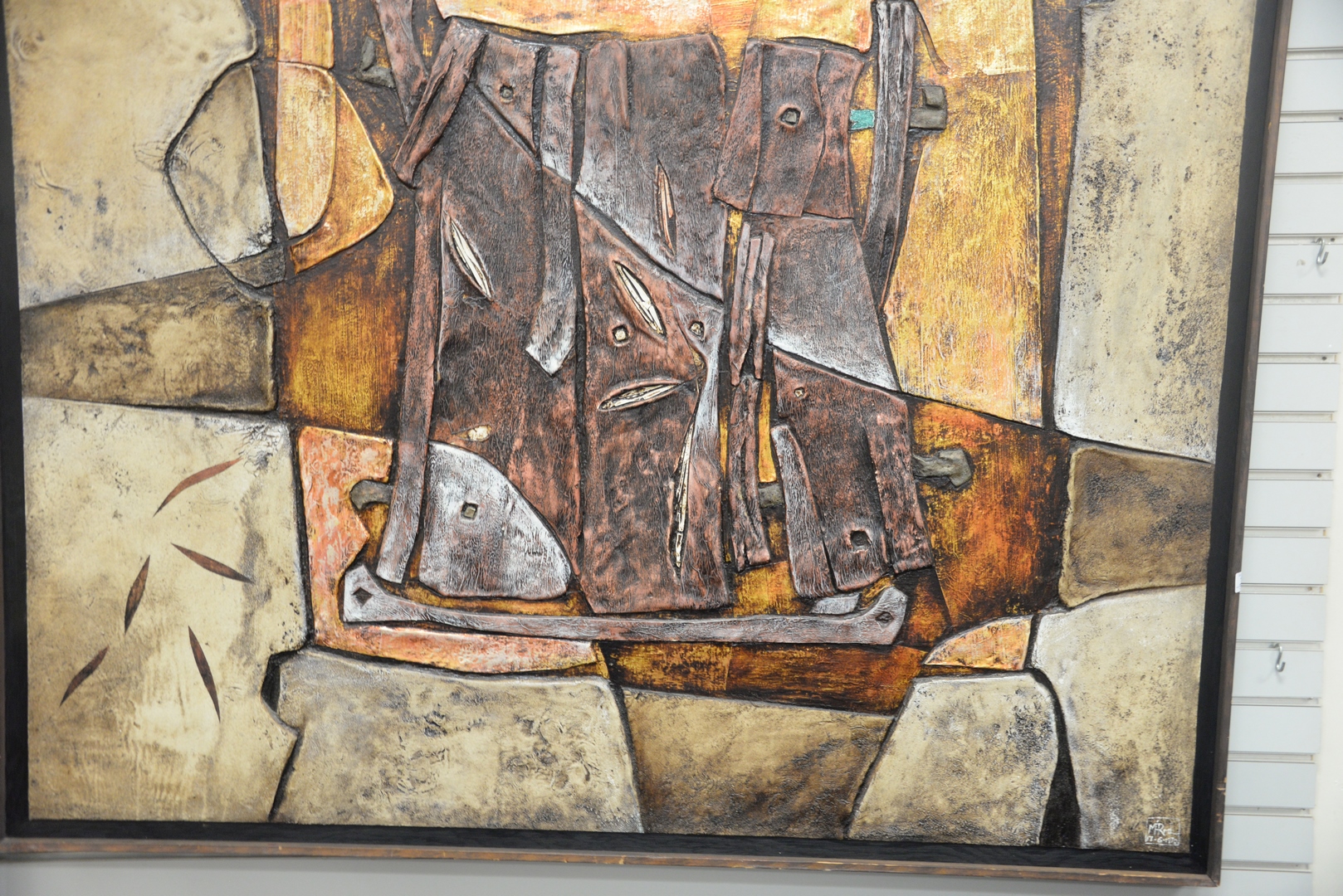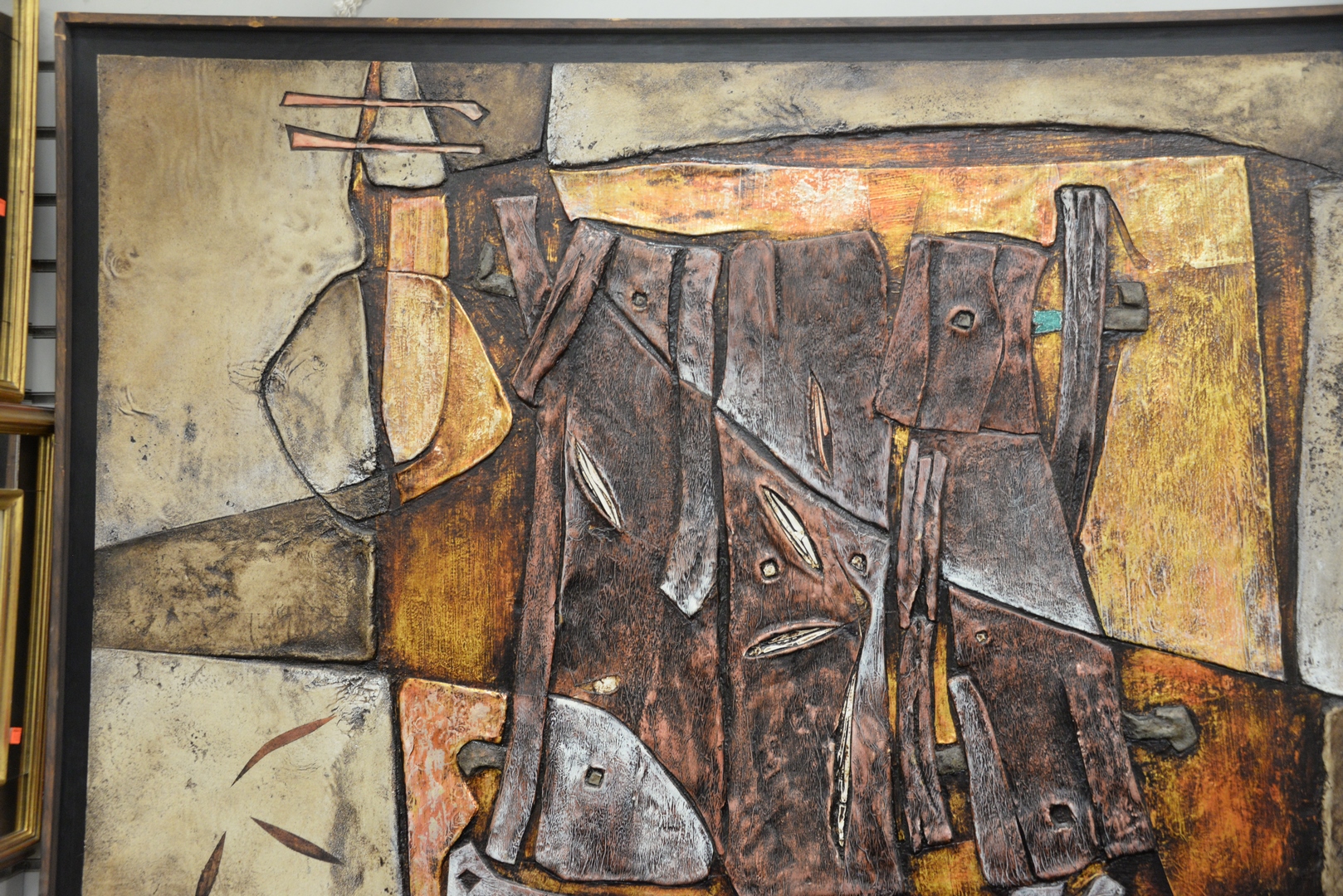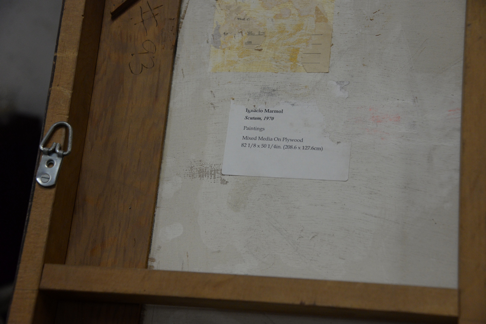 Lot 189: Ignacio Marmol (Spanish, 1934 – 1994), Scutum, 1970, mixed media relief on plywood; signed, titled, and dated on the reverse, framed 50 1/4″ x 82 1/8″.