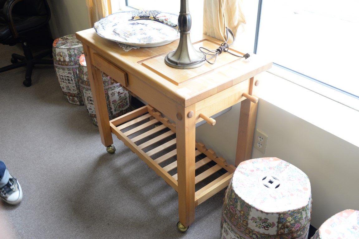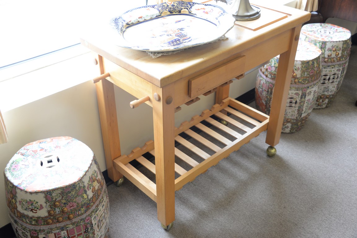 Le Gourmand maple butcher block cart. ht. 30in., top: 19 x 36
